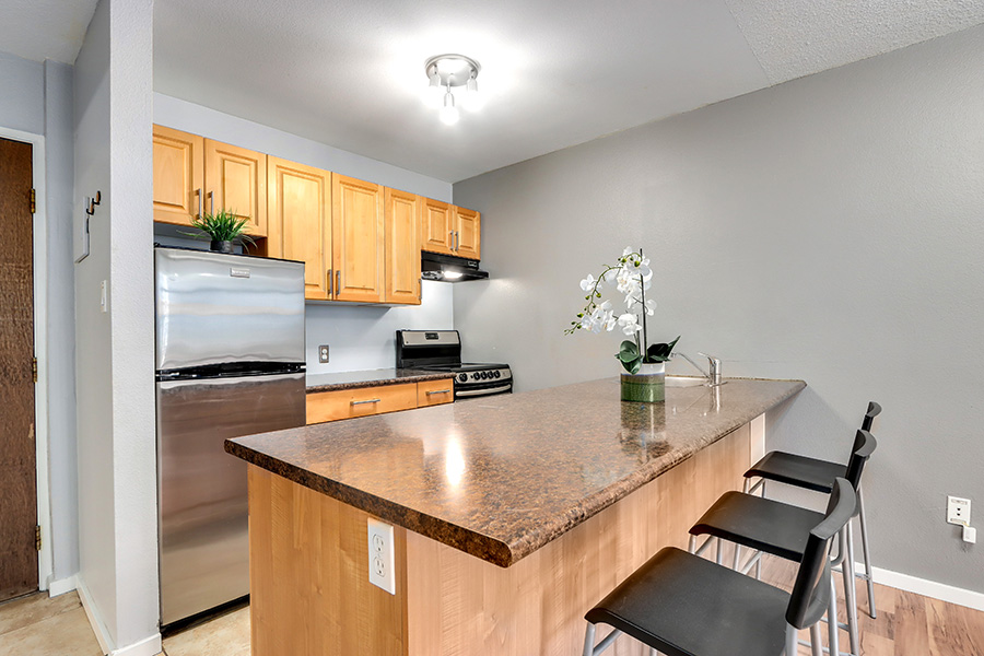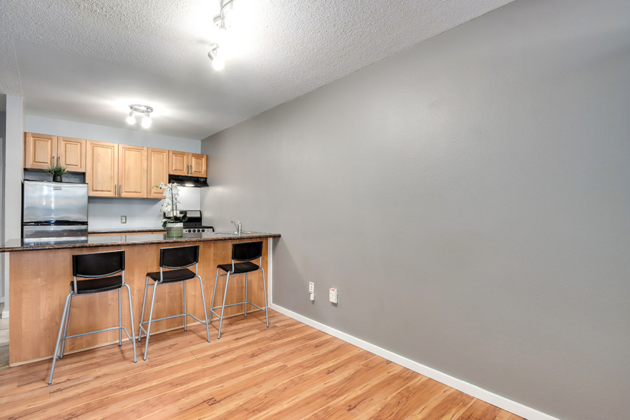 Features include a kitchen with maple cabinets, quartz countertops and breakfast bar, full-size Stainless-steel appliances: fridge, stove & oven, laminate flooring throughout, covered balcony, and shared laundry