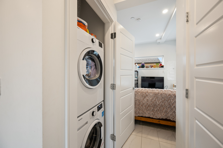 Features in this bright, upgraded two-level laneway home include open plan kitchen with granite countertop, stainless steel appliances: Fridge, stove, dishwasher, bedrooms (2) on the upper floor each have private balconies, bed included in 1 of the bedrooms, and in-suite washer and dryer