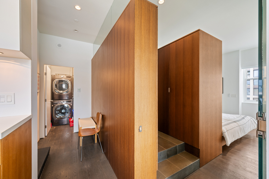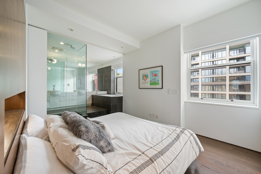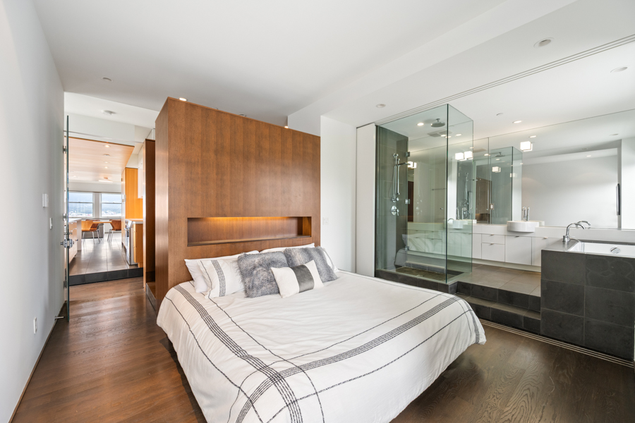 The primary bedroom includes a built-in bedframe and walk-through wenge wood closets. The