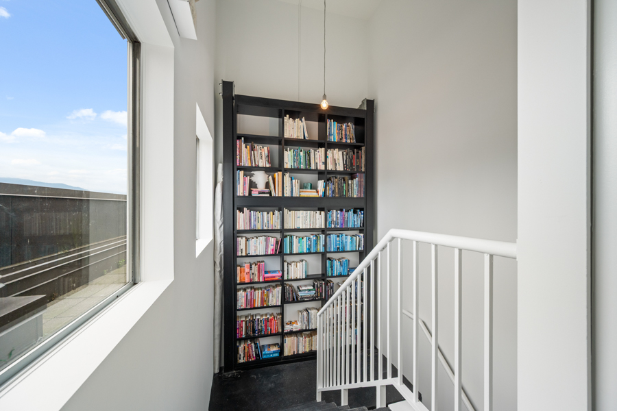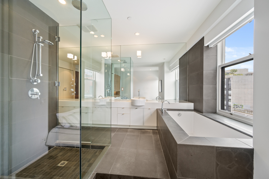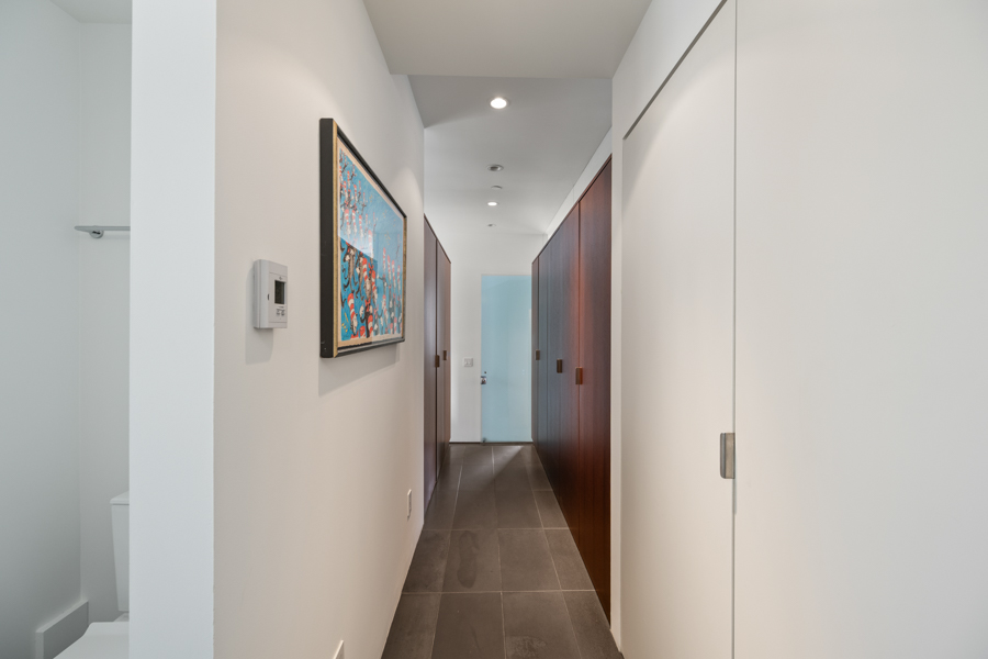 Custom millwork throughout, including a dramatic two-storey bookshelf. Remote-controlled sun-shades and opaque blinds offer comfort and convenience.