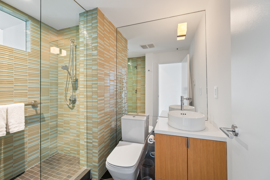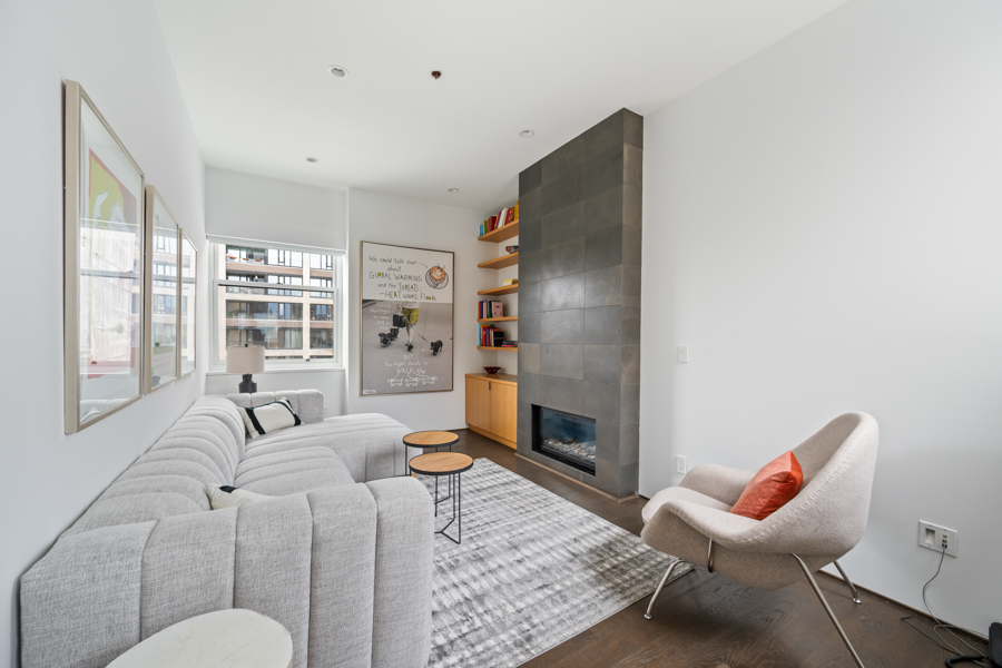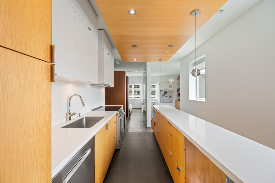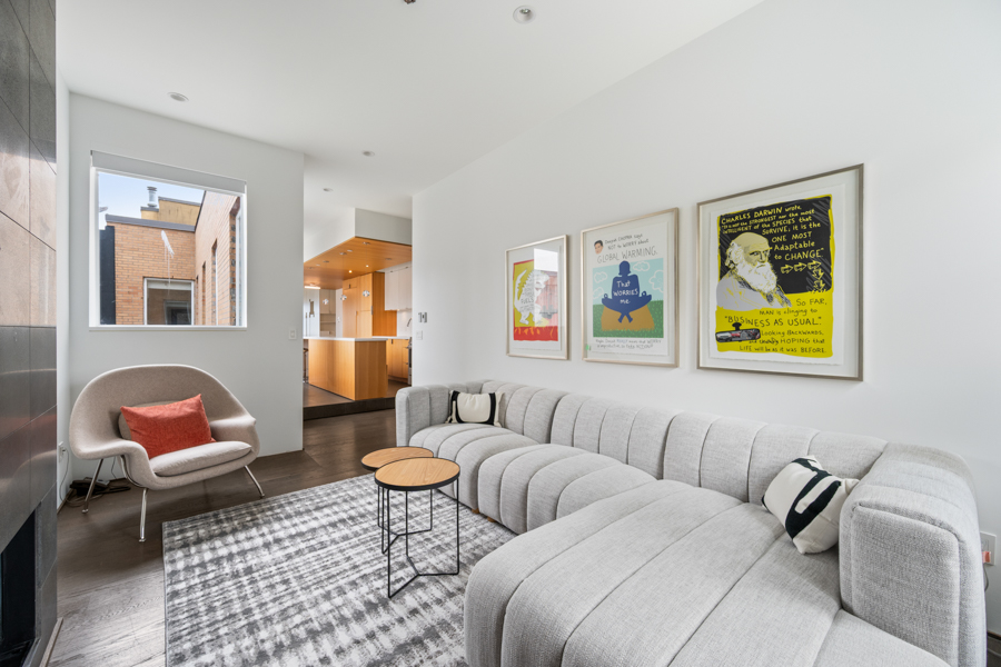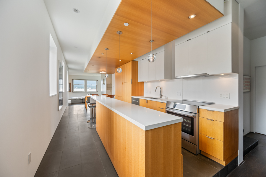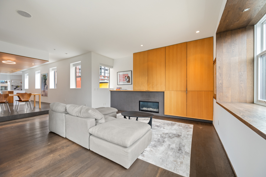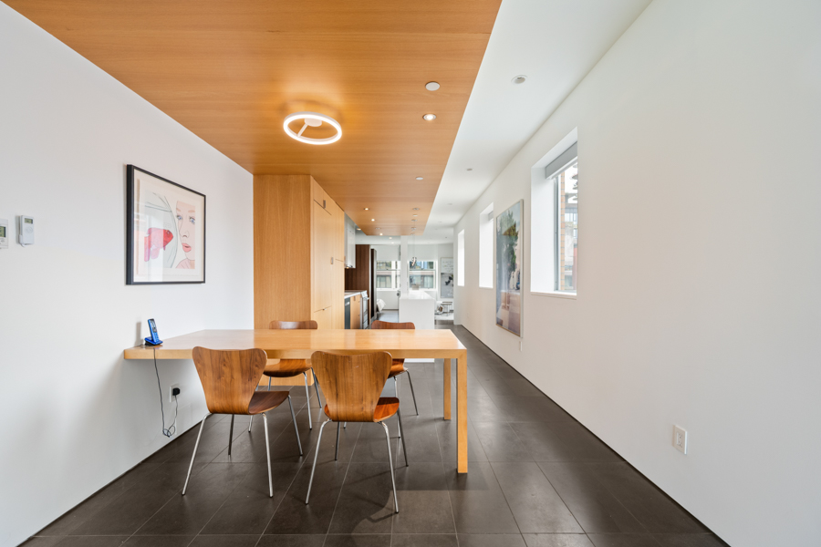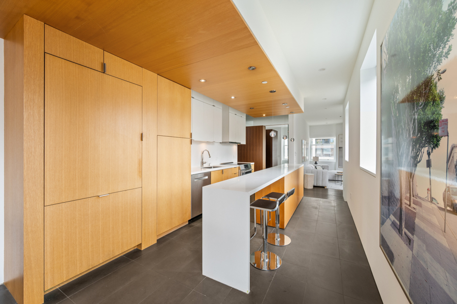 Splyce Design, this two-bedroom plus den home features soaring 10-foot ceilings and expansive