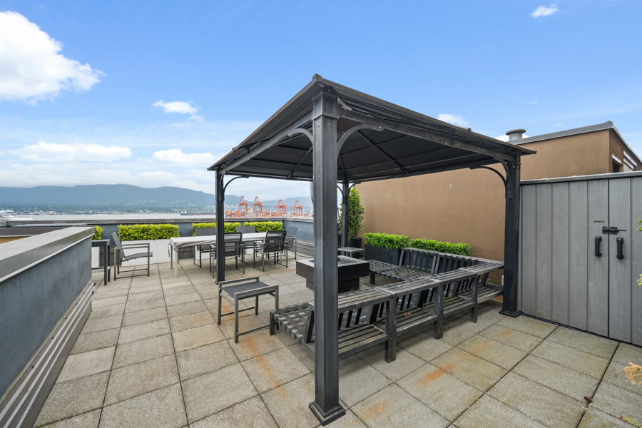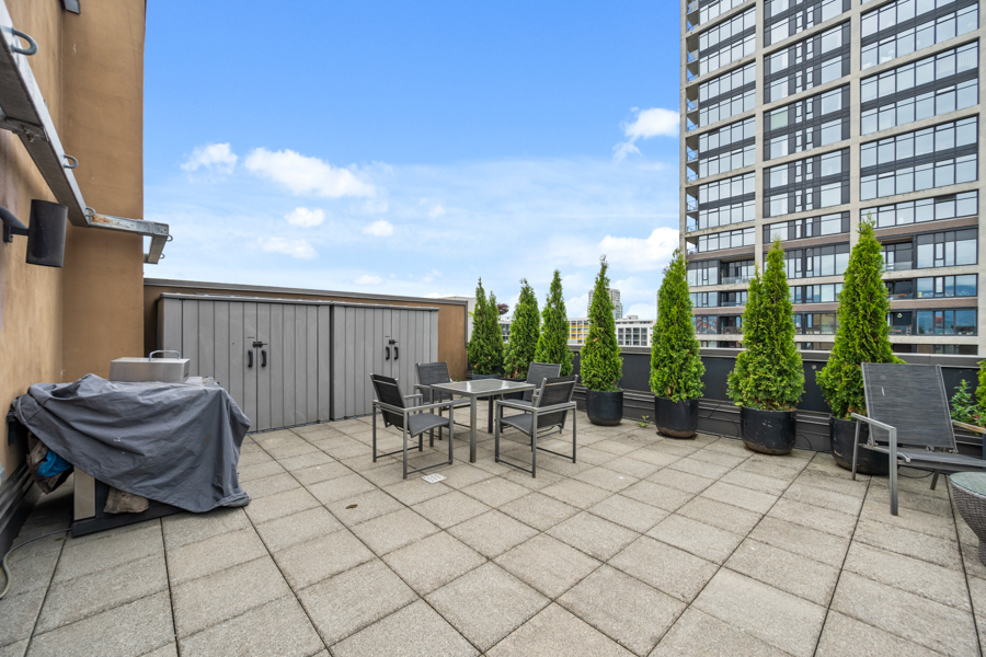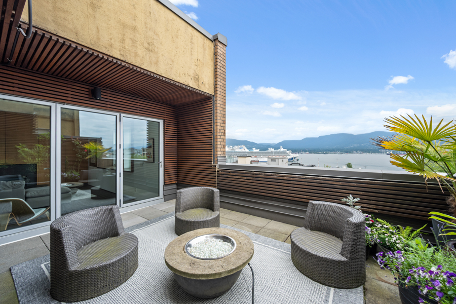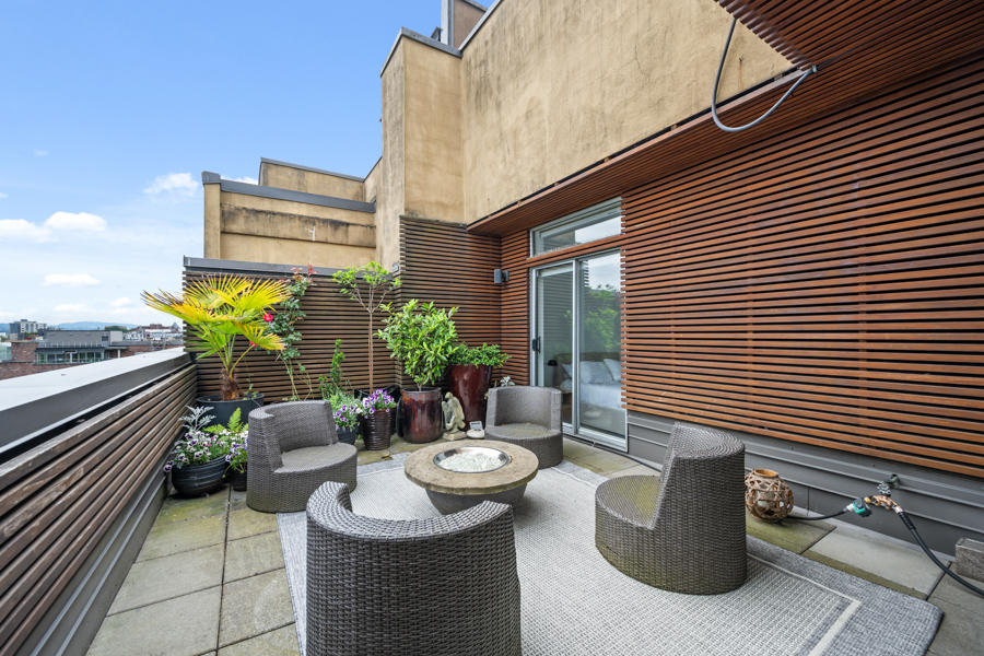 Enjoy your exclusive 1,086 sq. ft. rooftop patio with a sofa lounge, bistro set, fire pit, and gas