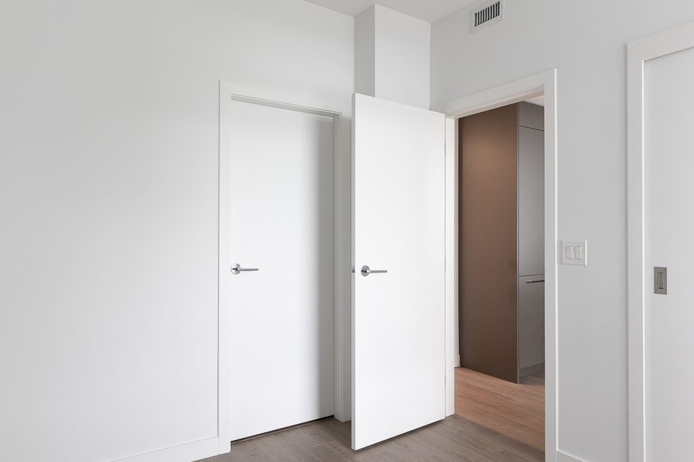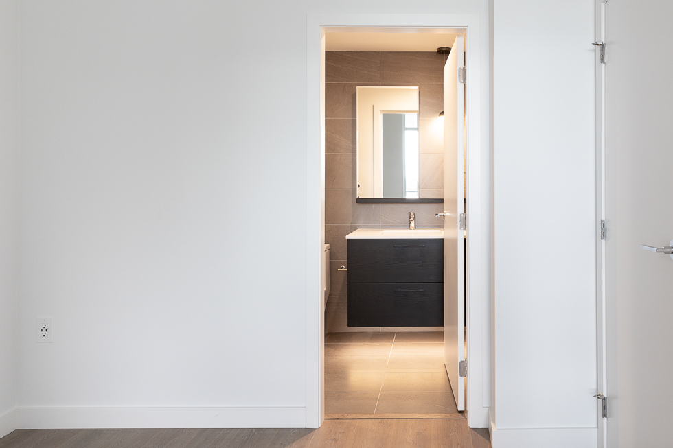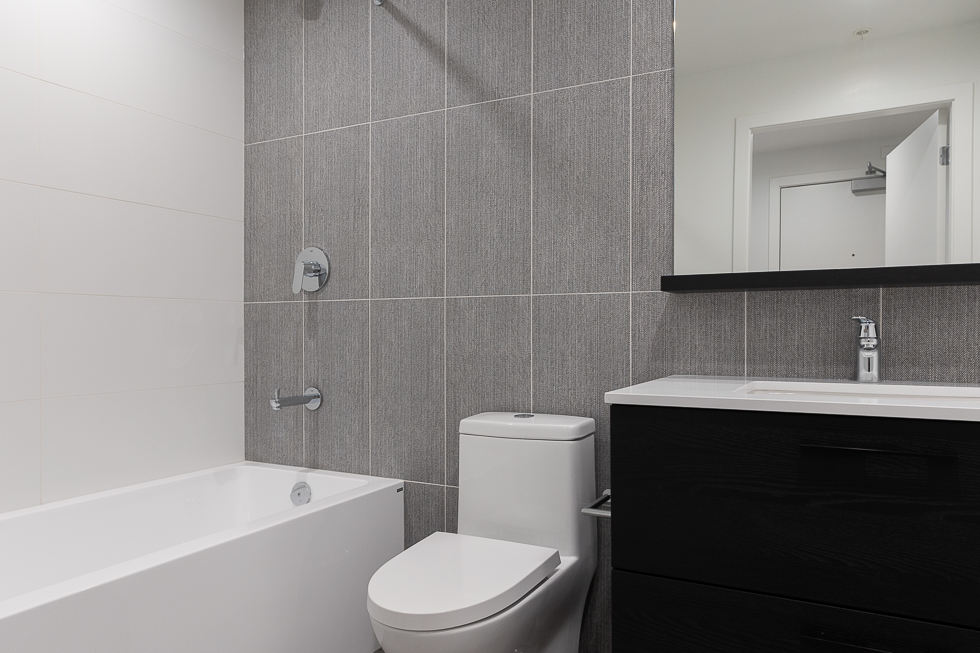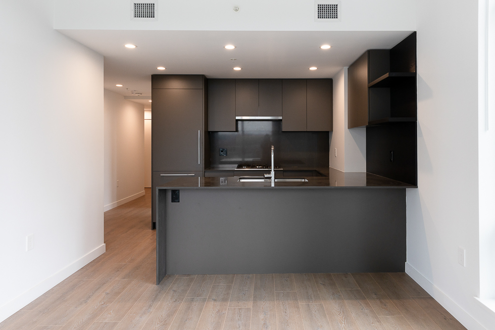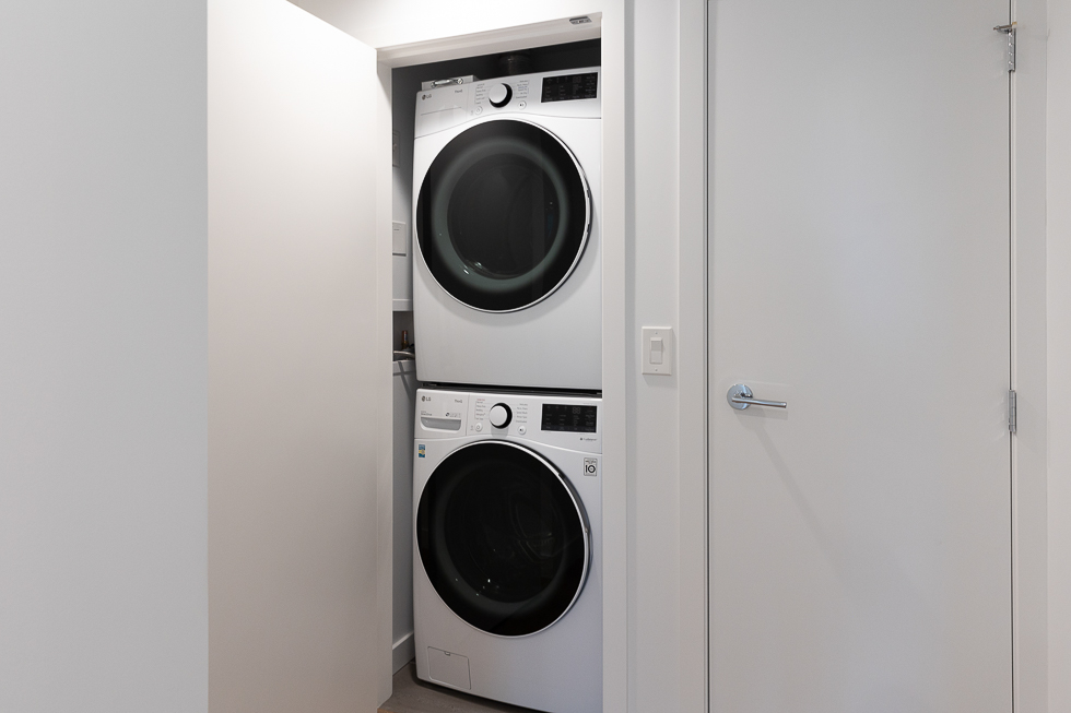 Features in this 7th floor unit include air conditioning, 9ft ceilings, floor to ceiling windows, a modern Kitchen with European inspired cabinetry, quartz countertops and integrated Fisher & Paykel appliances, bedrooms located on separate side of unit to one another, primary Bedroom with ensuite bathroom, a large covered 240 sq ft balcony, spa-like Bathrooms with quartz countertops and recessed lighting, and in-suite washer and dryer