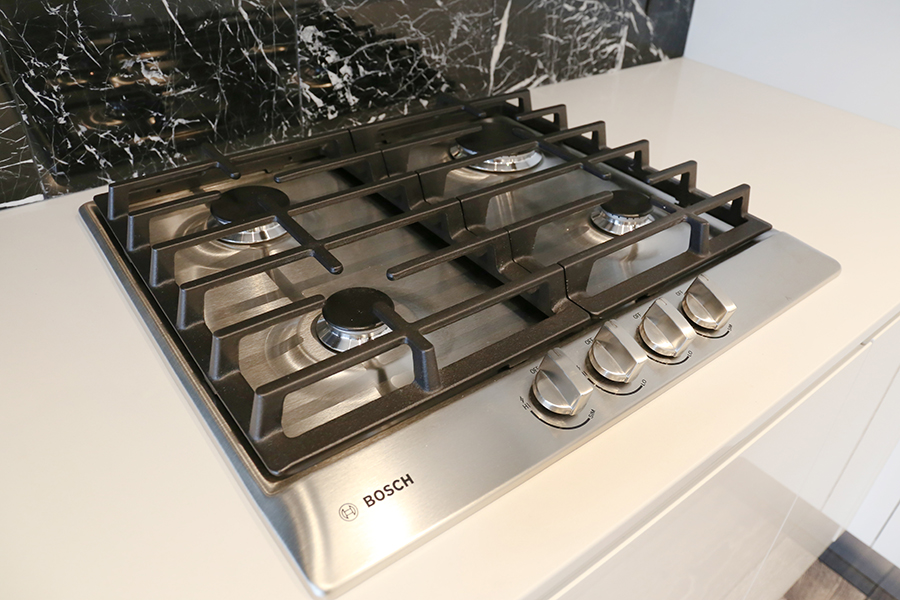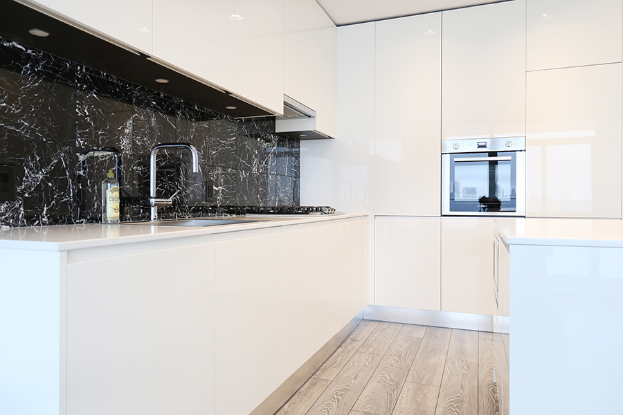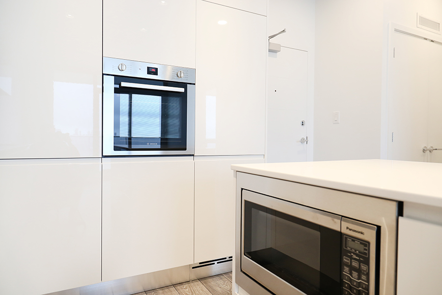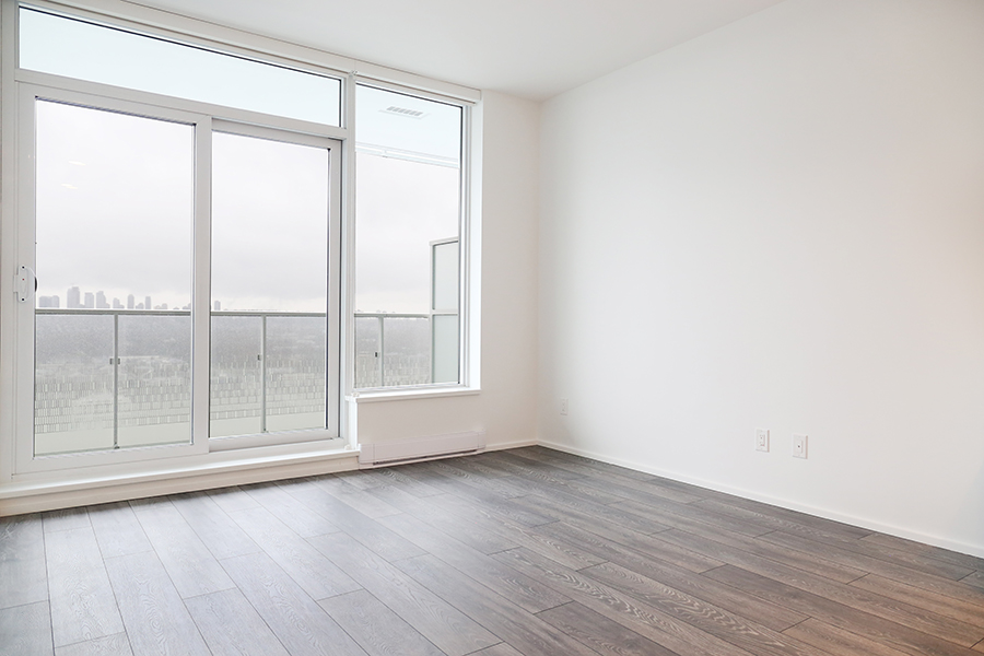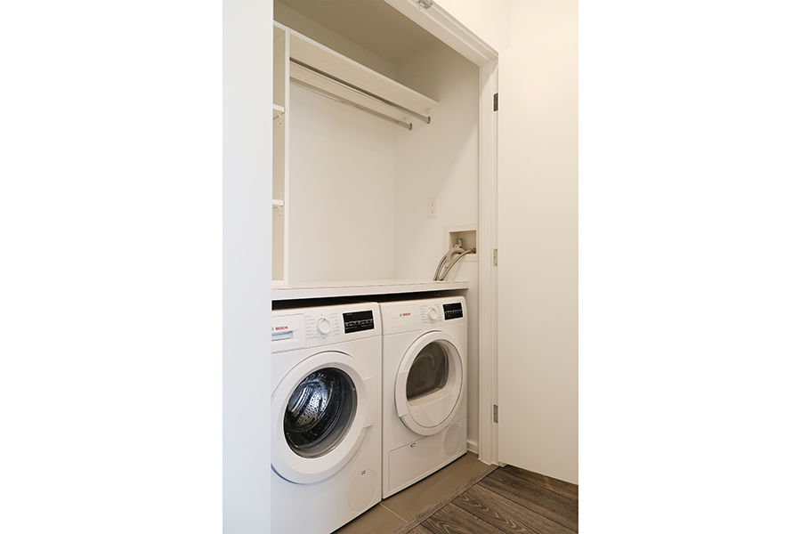 Features in this 32nd floor with open plan living include floor to ceiling windows, premium stainless steel and integrated appliances: Fridge, Dishwasher, Gas Stove, Wall Oven, and Microwave, stone quartz countertops and kitchen island, engineered wood laminate flooring throughout, ensuite bathroom, walk-in-closet, covered balcony, and in-suite side-by-side washer and dryer.
