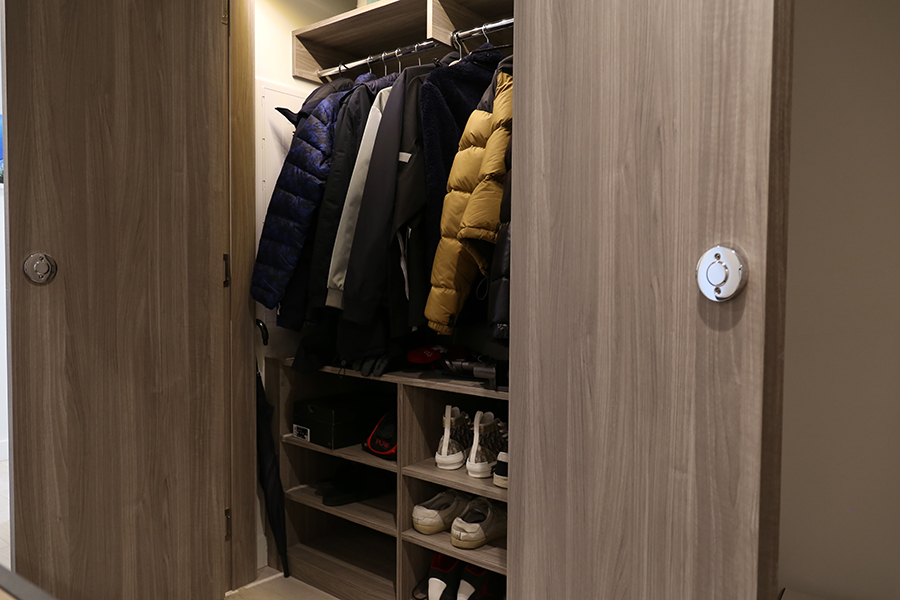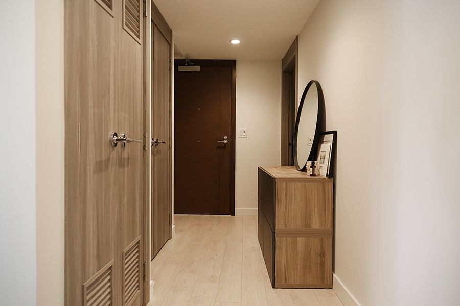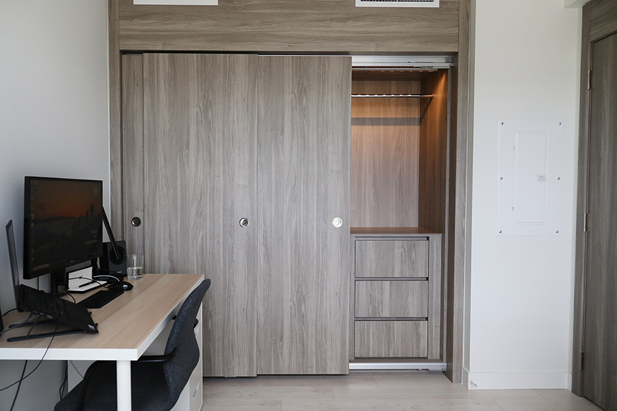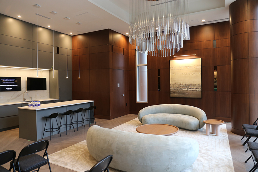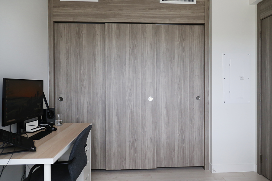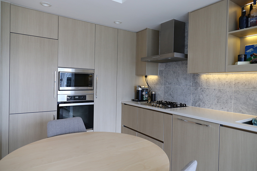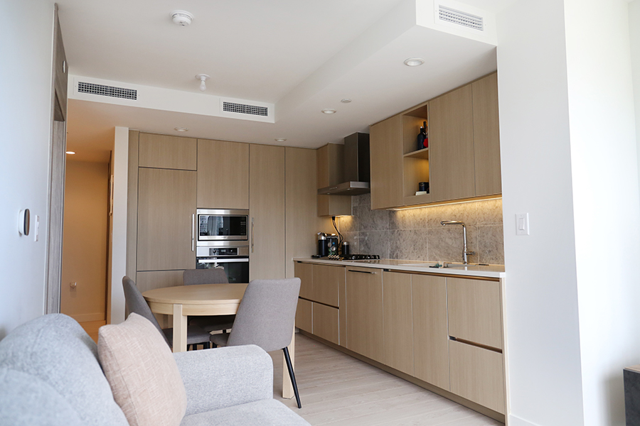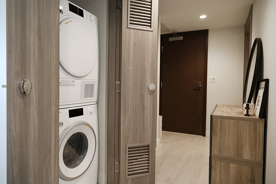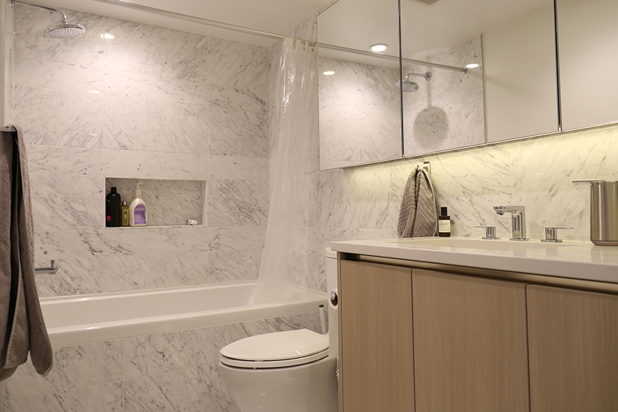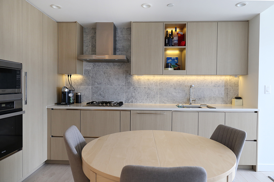 Features include floor to ceiling windows, dark Roller-shade window coverings to enhance privacy, modern kitchen with quartz counter tops, integrated Miele appliances: fridge, stove & oven, dishwasher, and Panasonic microwave, engineered laminate wood flooring throughout, marble tile flooring and tub/shower surround, large closet with custom organizer system, central air-conditioning & heating, and in-suite Miele washer and dryer.