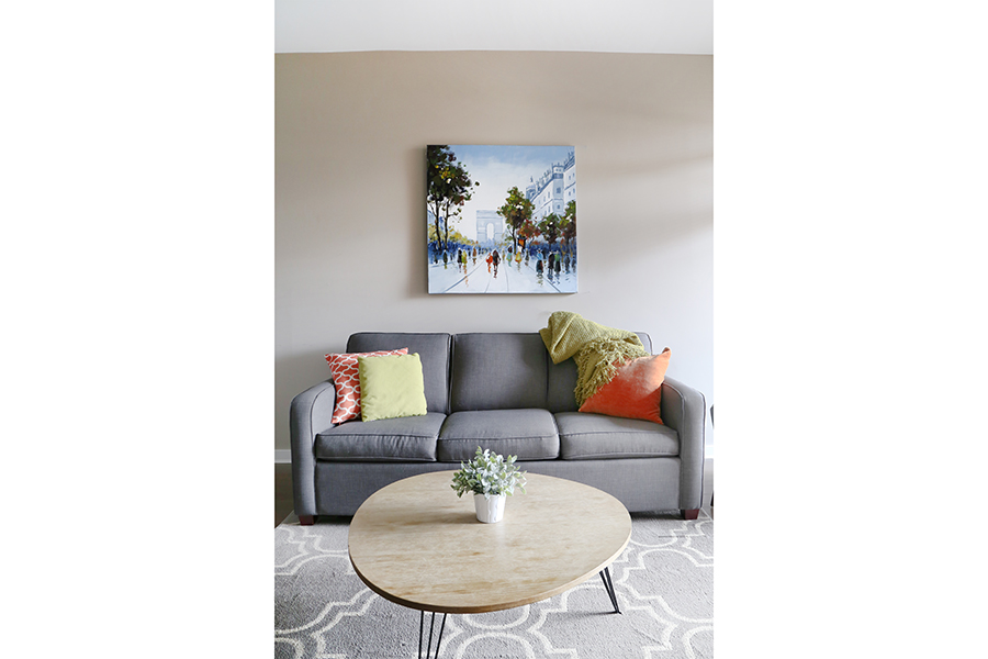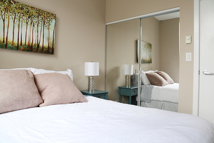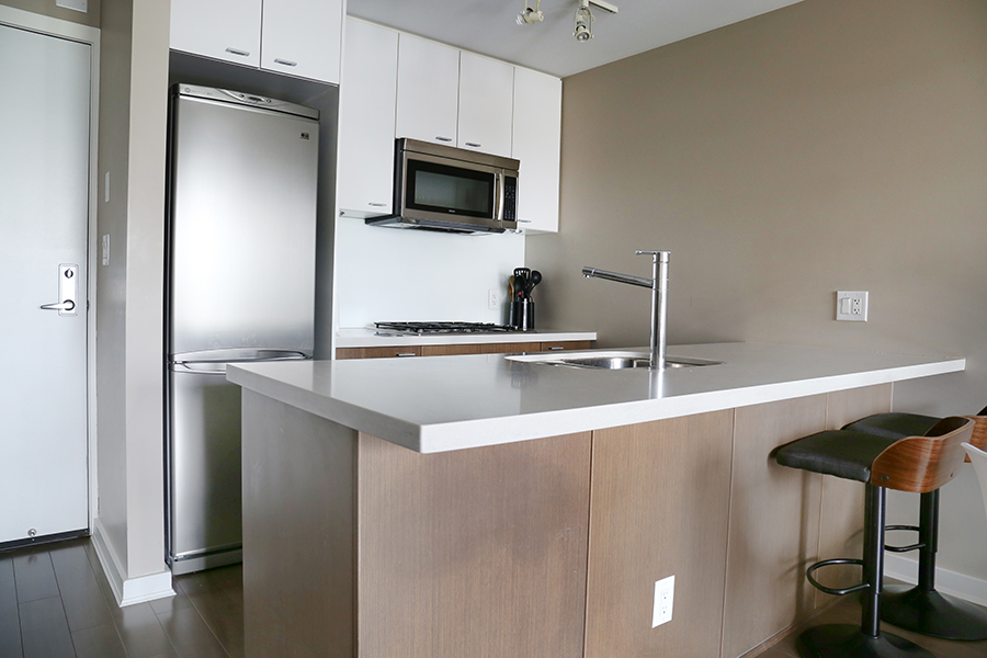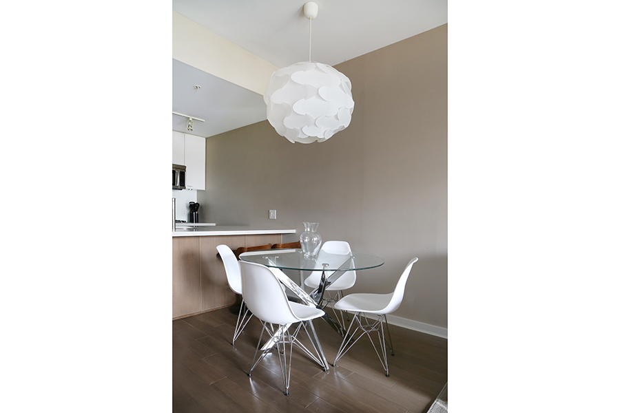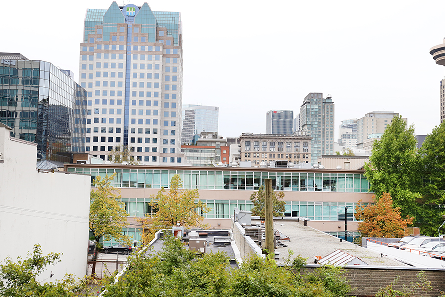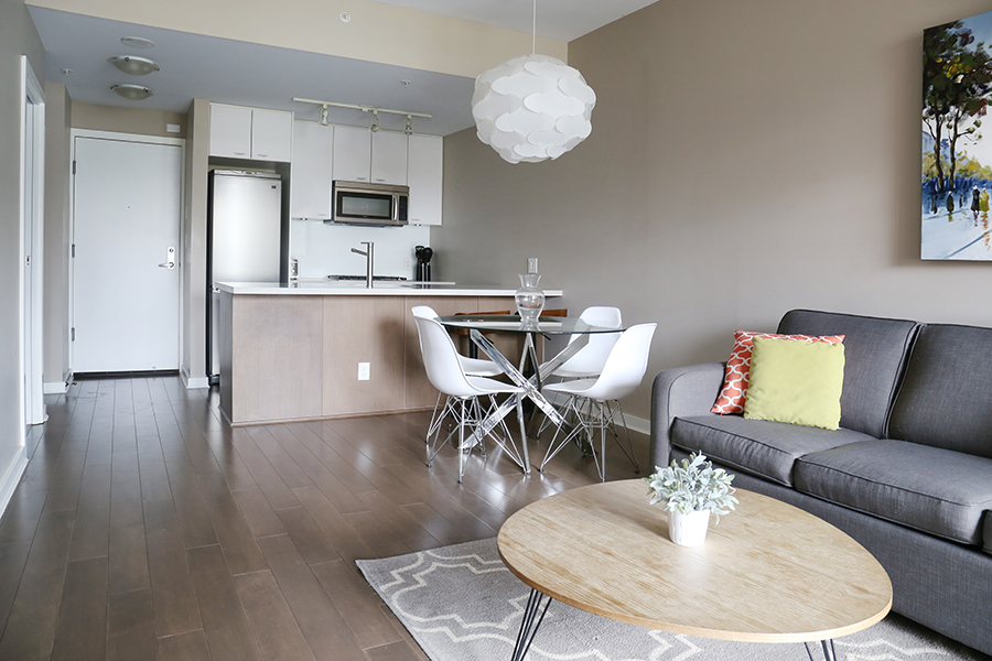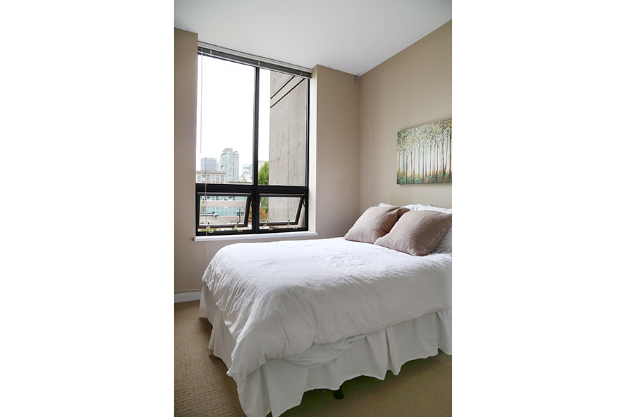 Features include large den, perfect for an office, open plan kitchen with plenty of storage, stainless steel appliances, gas stove, over-height ceilings, engineered hardwood floors, an in-suite washer and dryer, and a covered balcony. This spacious and bright one-bedroom unit located in Crosstown Vancouver is exactly what you are looking for. The unit was professionally furnished by Kendall Ansell Interiors. Located at Dunsmuir and Beatty St, you’ll be able to walk across the street and enjoy the very popular Chambar restaurant or grab a pint at Devil’s Elbow or do a quick Costco run just a block away. A short walk to both Yaletown and Gastown, the skytrain is also right across the street giving you easy access to the city’s main transportation hubs. With modern and very comfortable furnishings, you will enjoy relaxing in your own space all day long. There is in-suite laundry, full-sized appliances, a dishwasher and two TVs. The patio is covered allowing you to use the space any time of the year. Building amenities include one secure parking space in the covered parkade, gym, common bike storage and an outdoor Zen garden.