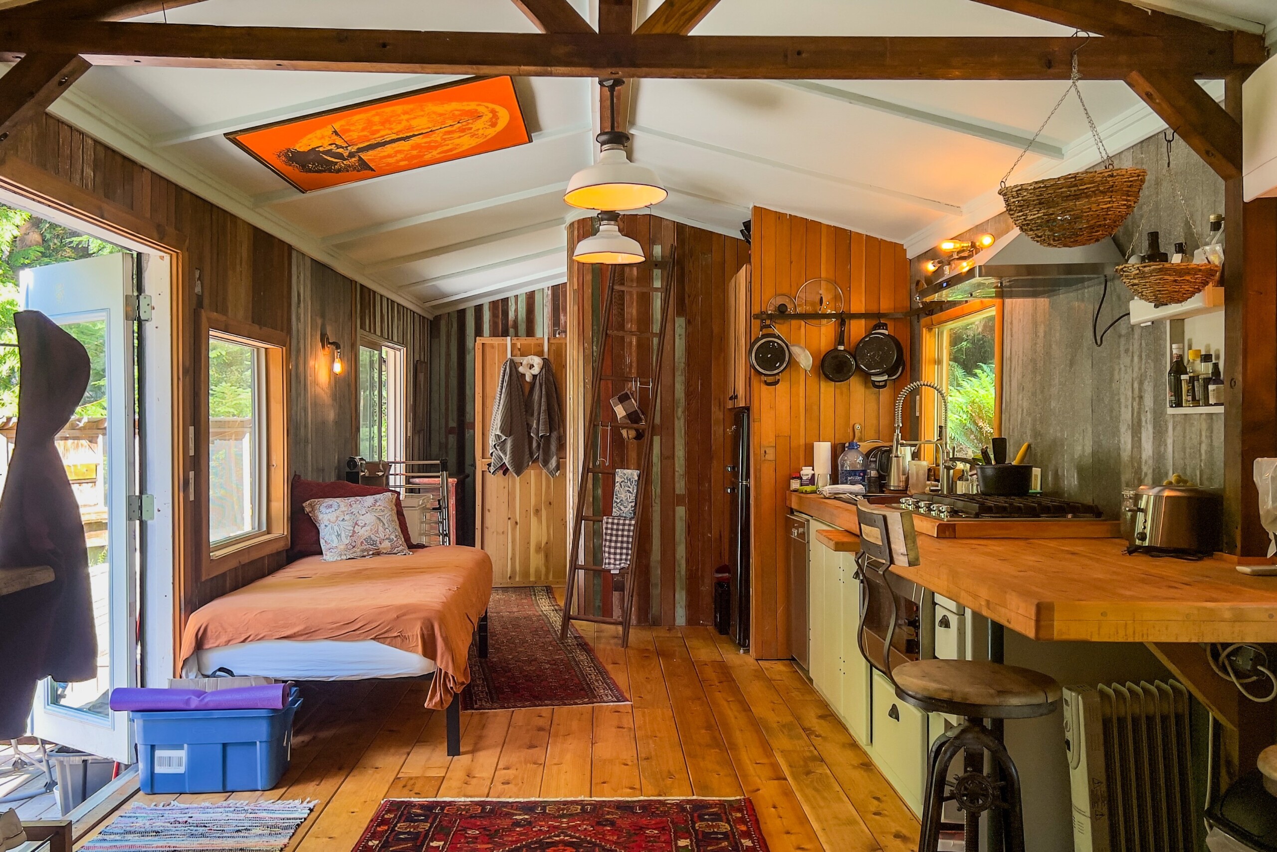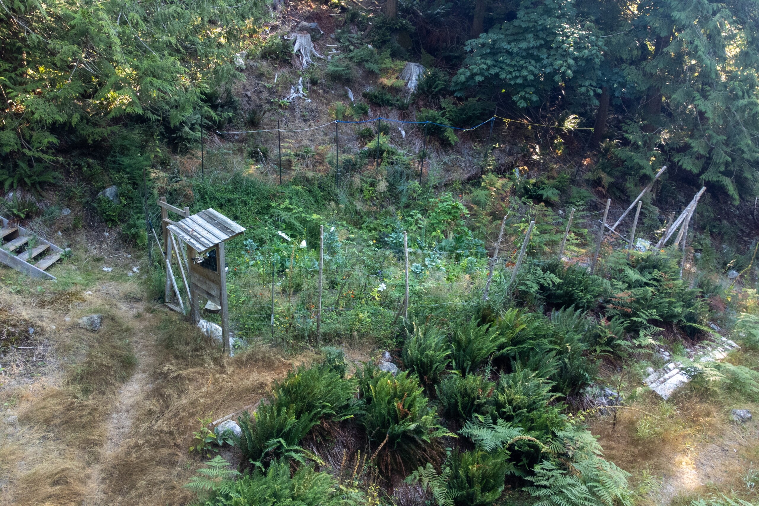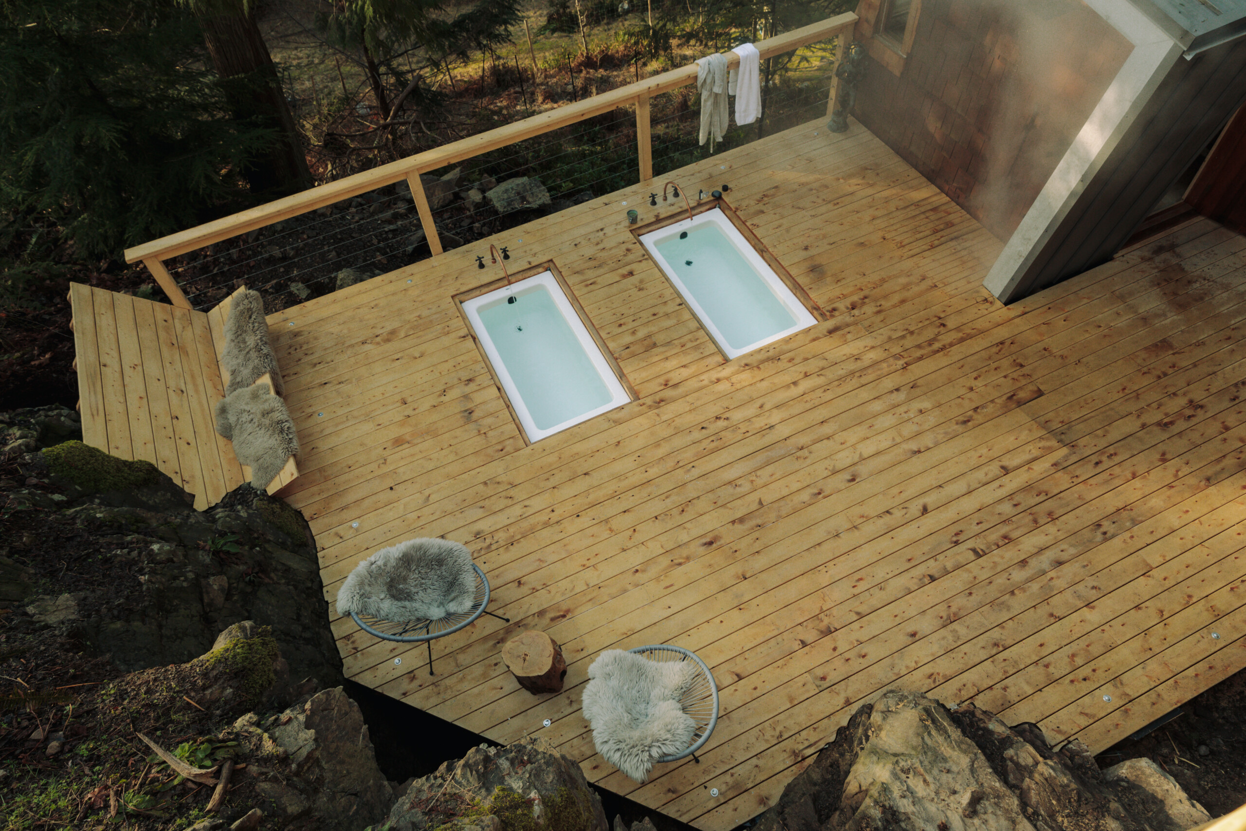 Walk down some steps to arrive at the forest spa with two outdoor tubs and a Scandinavian style sauna. Descend another set of steps to arrive at the 791 sqft 1-bedroom cabin with full kitchen, fireplace, bathroom, outdoor patio & veggie garden ready to pick for meal time. Continue the journey via your private trail which leads directly to Killarney Loop.