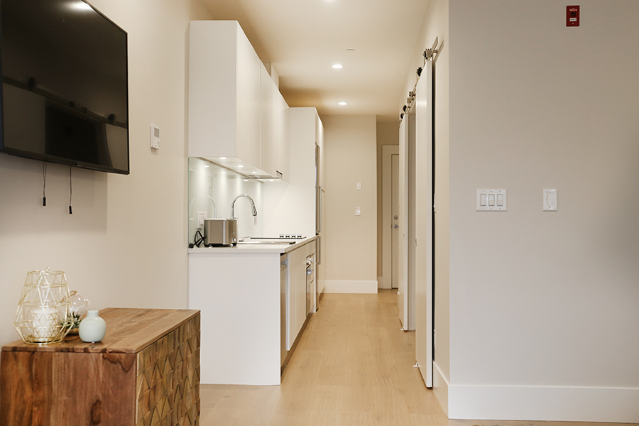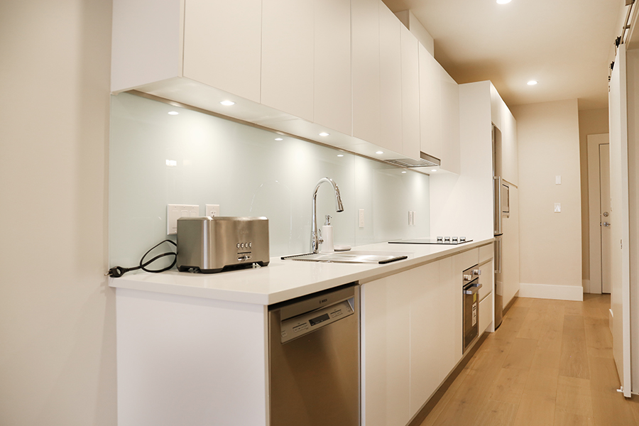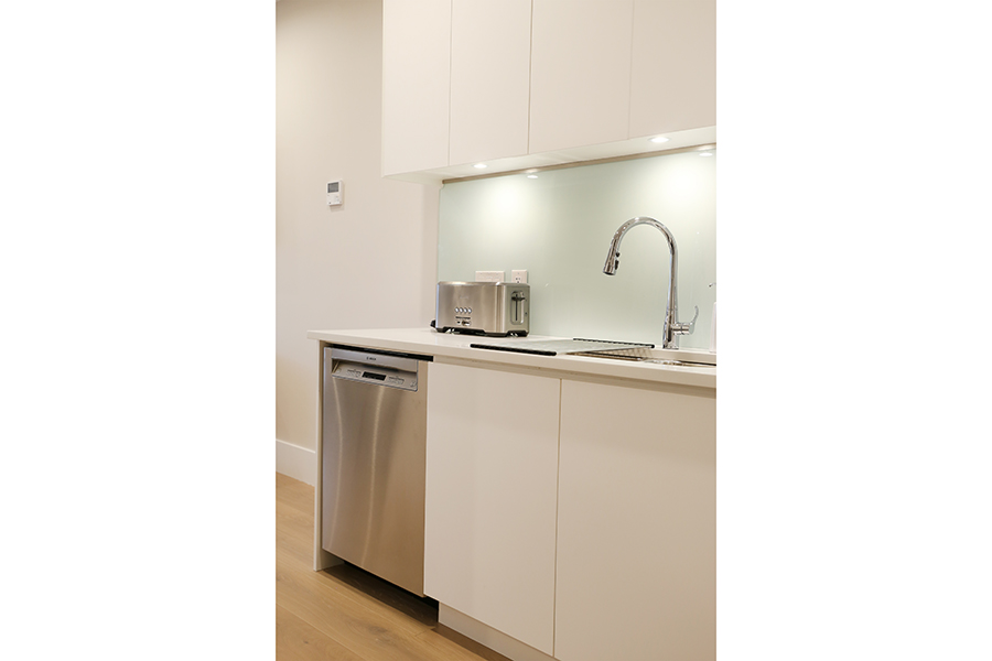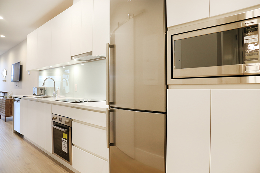 Feature include Open plan kitchen with plenty of storage fully stocked with microwave, toaster, pots, pans, utensils, plates and all kitchen supplies you need, Bosch stainless steel fridge, stove/oven and dishwasher, Spacious bedroom with queen size bed, Ensuite bathroom with large walk-in shower, 10 foot ceiling, Air conditioned homes, Engineered wide plank hardwood floors, Covered balcony, In-suite washer and dryer