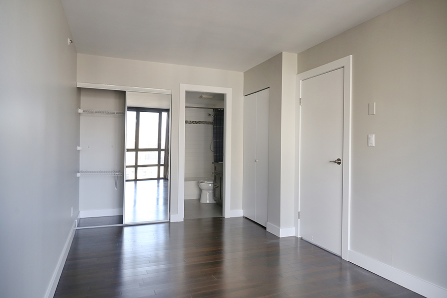 Features include floor-to-ceiling windows, engineered hardwood maple flooring throughout, full-size Stainless-steel appliances: fridge, stove & oven, dishwasher, and microwave, granite countertops, spacious dining room & living room, bedrooms on separate side of unit, primary bedroom with ensuite bathroom, covered balcony, city views, and in-suite washer and dryer.