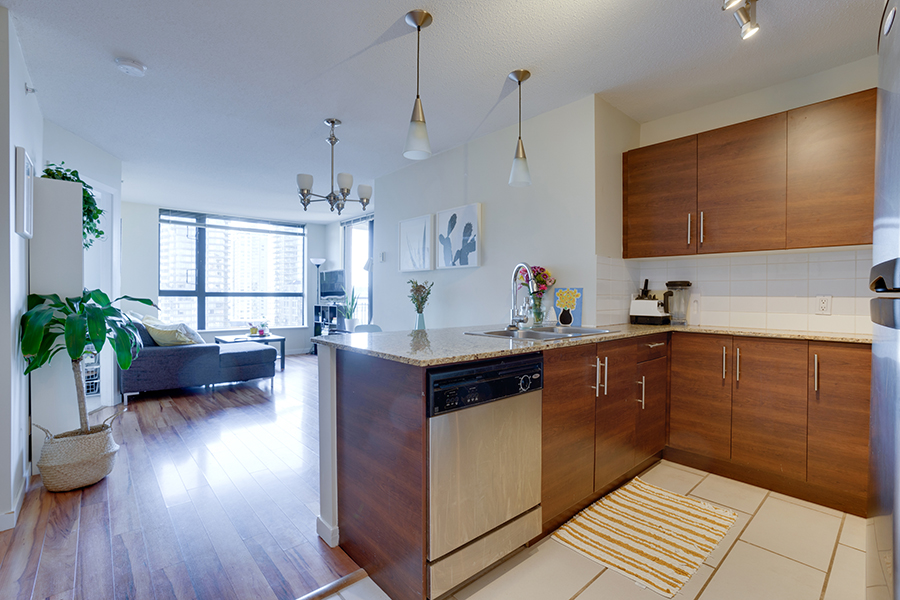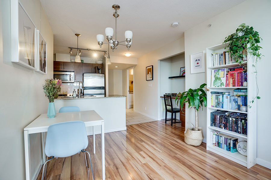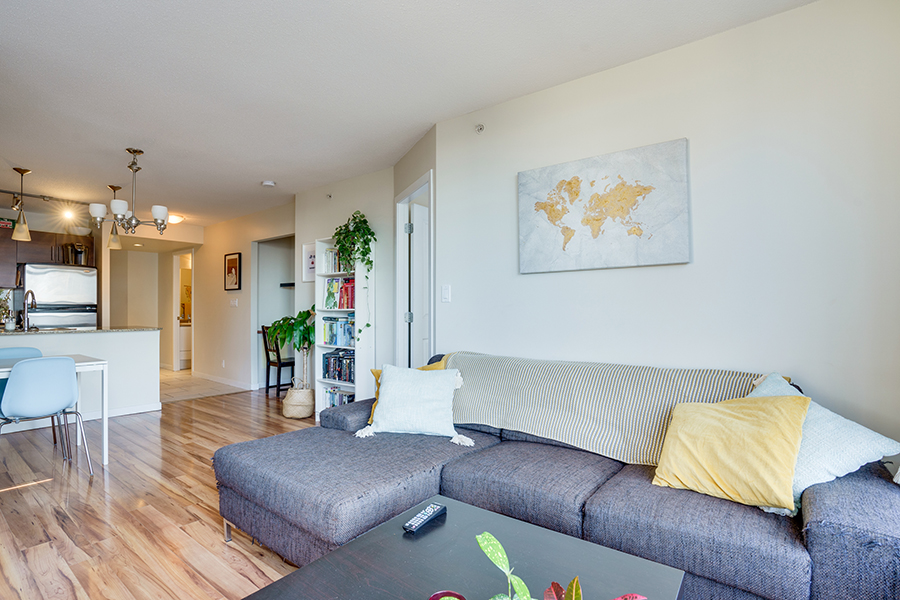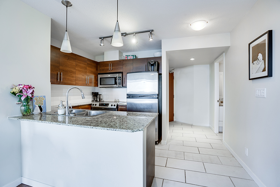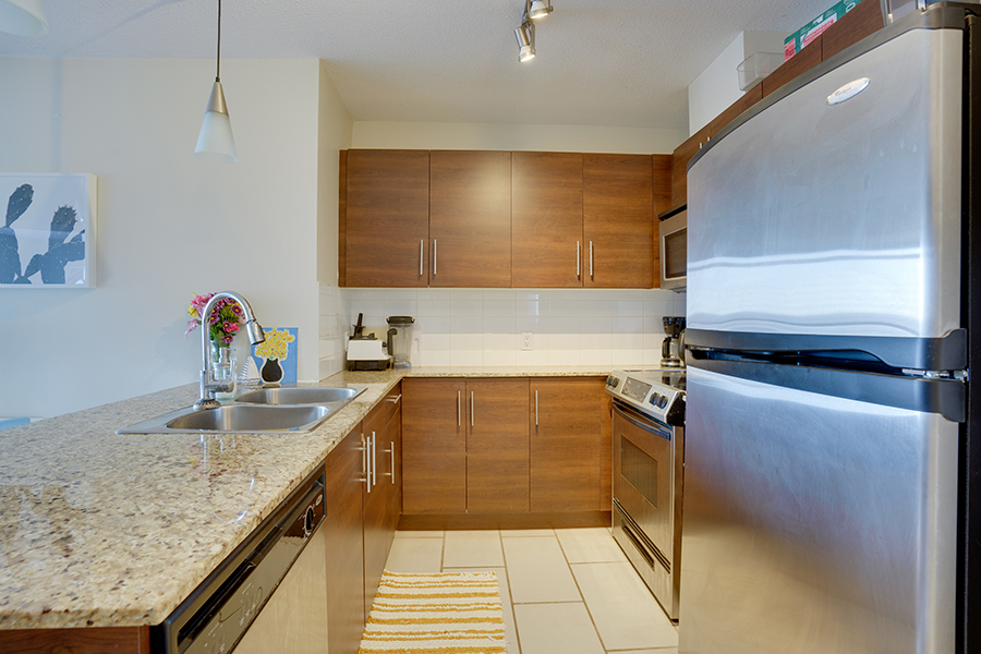Features in this corner unit include open concept kitchen, dining and living room, oversized windows allowing plenty of natural light, large covered patio, southwest exposure, peekaboo water views, stainless Steel Appliances: Fridge, Dishwasher, Stove, Oven, Microwave, granite countertops, master ensuite bathroom, built in office nook, in-suite washer and dryer