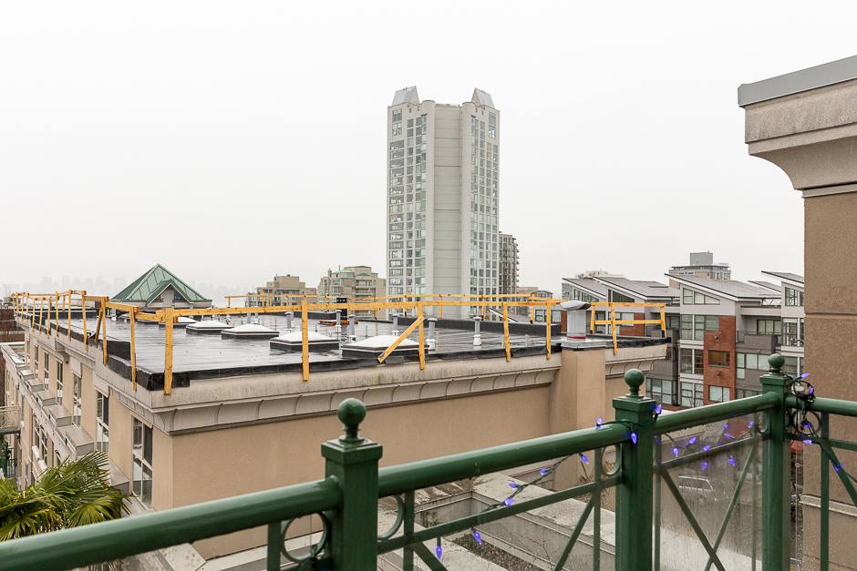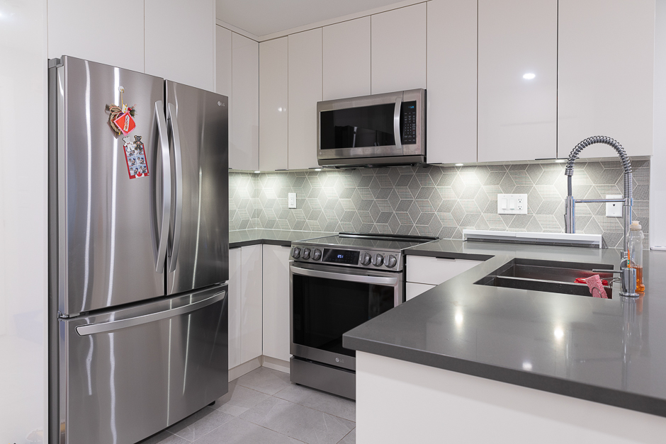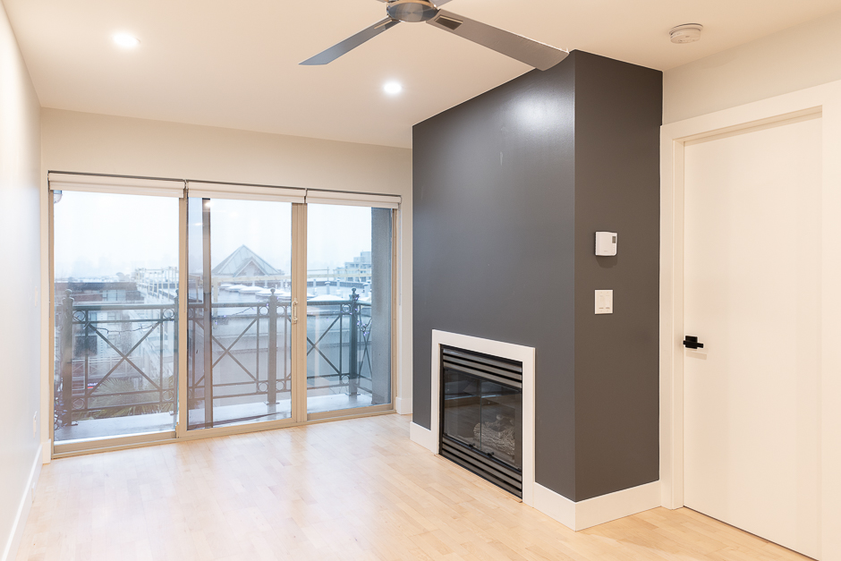 Features in this renovated south facing unit include gas fireplace, modern Kitchen with quartz countertops, full-size Stainless-steel appliances: fridge, stove & oven, dishwasher, and microwave, primary bedroom double closets, large den with skylight, balcony with views of Vancouver overlooking building’s courtyard, and in-suite washer and dryer