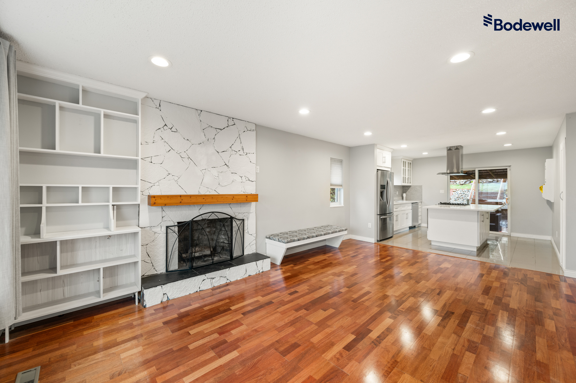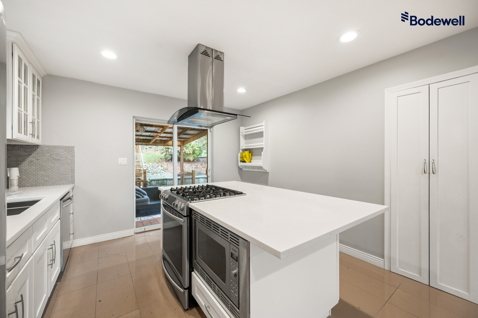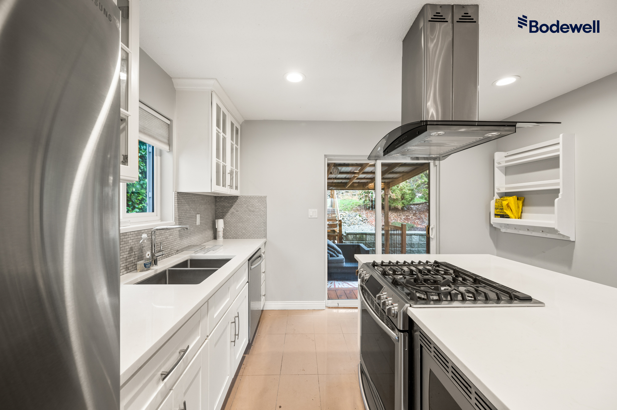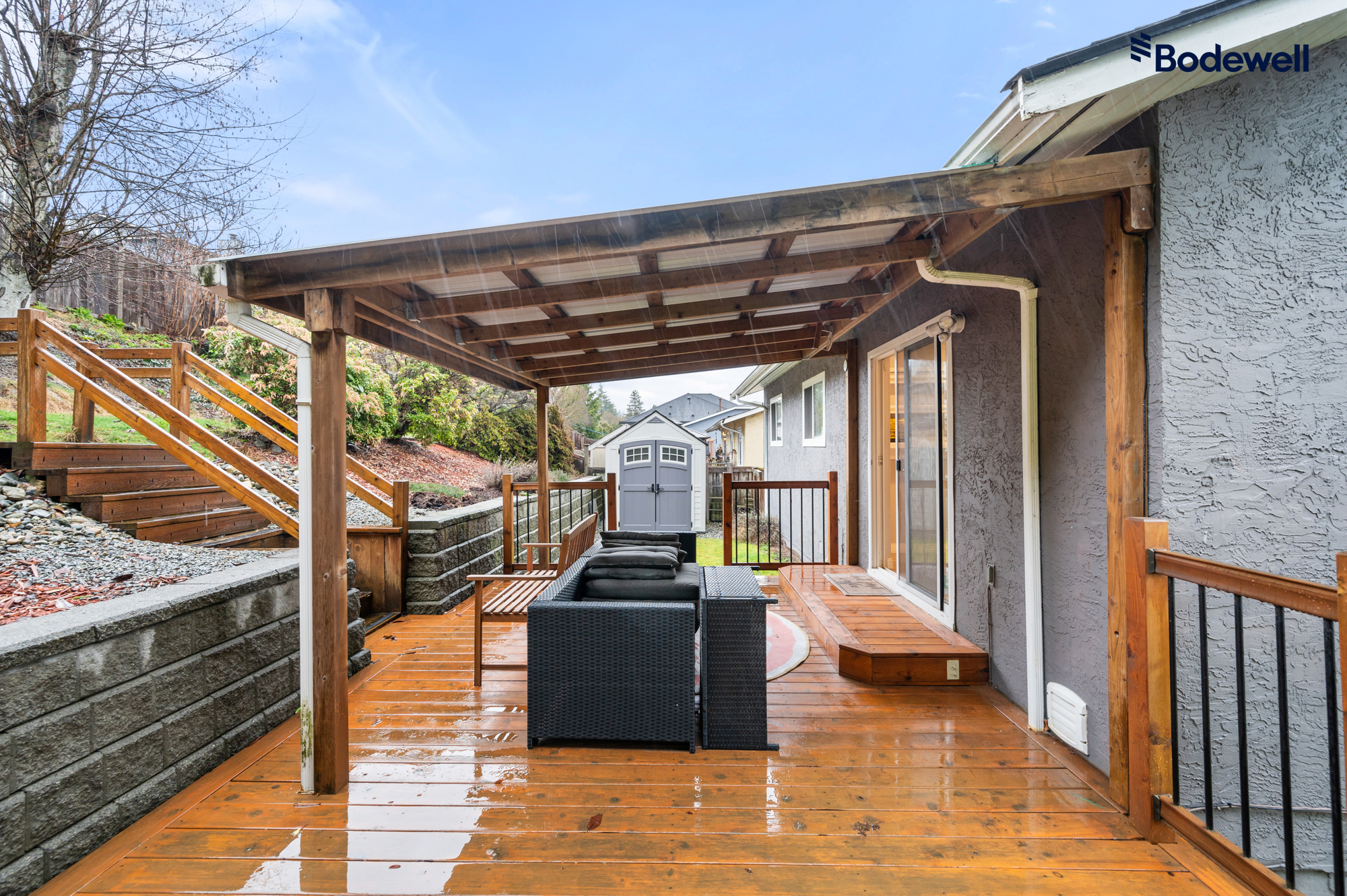 Features in this spacious two-level home include upper floor with main living spaces (3 beds + 2 baths), lower floor with garage access and an in-law suite (1 bed + 1 bath). Primary bedroom with ensuite bathroom, thoughtfully designed & updated main kitchen with plenty of storage, quartz kitchen island, countertops & backsplash, stainless steel Samsung appliances: fridge, gas stove, dishwasher, and microwave, large covered ceck directly off of kitchen (with patio furniture), wood burning Fireplaces in both upstairs and downstairs living rooms, laminate flooring throughout living areas, carpeted bedrooms & tiled Kitchens. In-suite washer and dryer