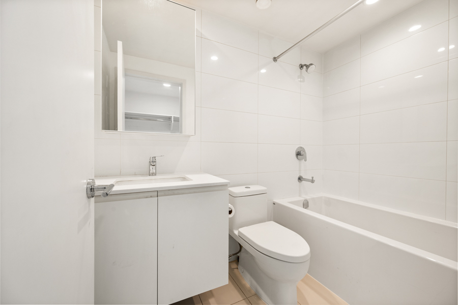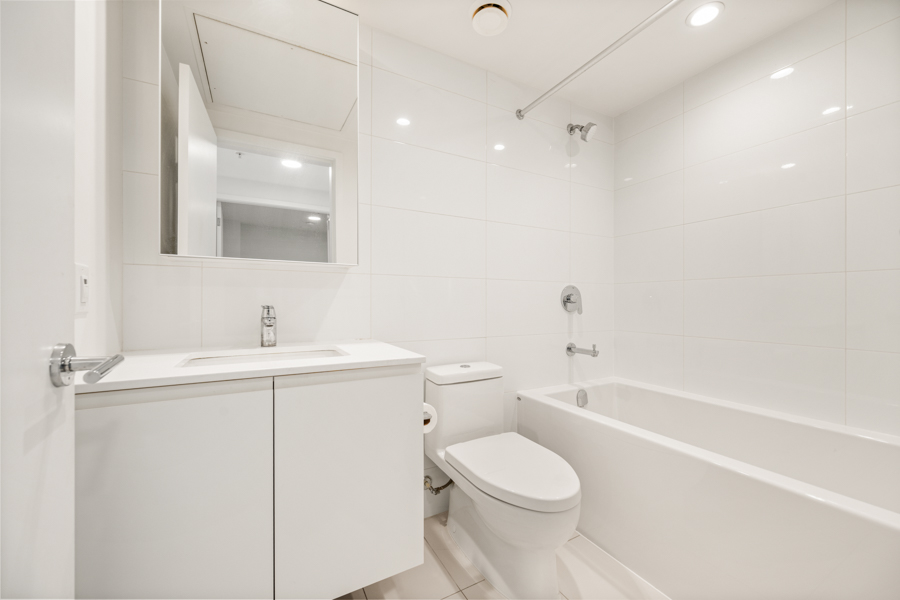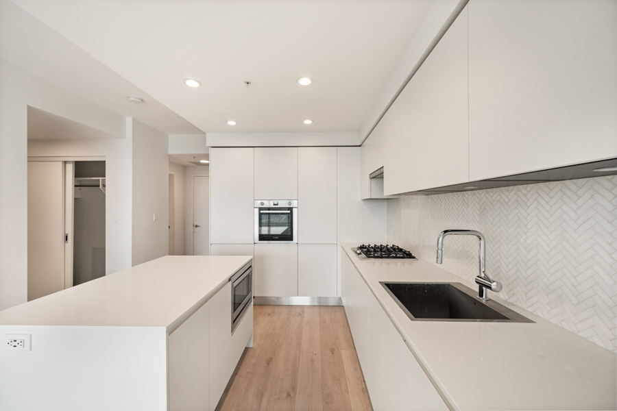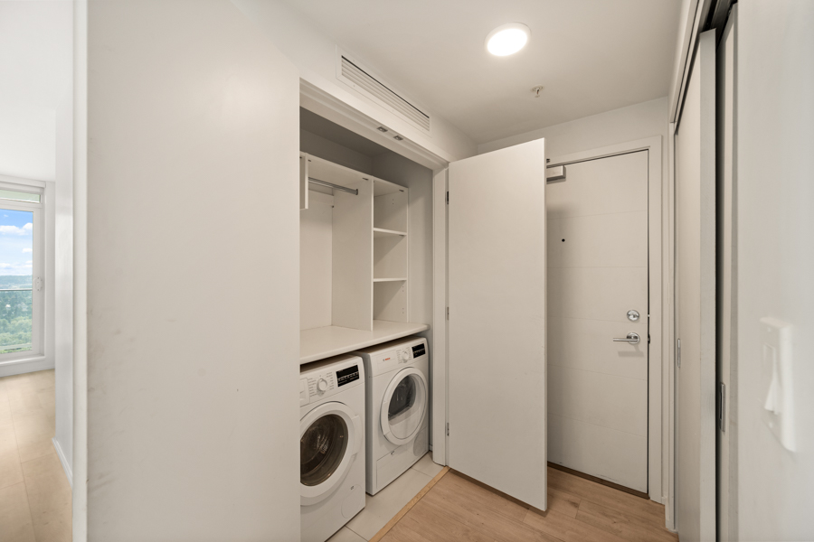 Features in this modern 36th floor unit include an open plan kitchen with worktable island that accommodates seating. Integrated and Stainless Steel appliances: gas range, oven, dishwasher, fridge, and microwave. Large balcony with views of city, greenspace, and mountains. Primary bedroom with walk-in closet, and ensuite washroom. In unit Air Conditioner. In-suite washer and dryer, side-by-side units with built ins above for functionality.