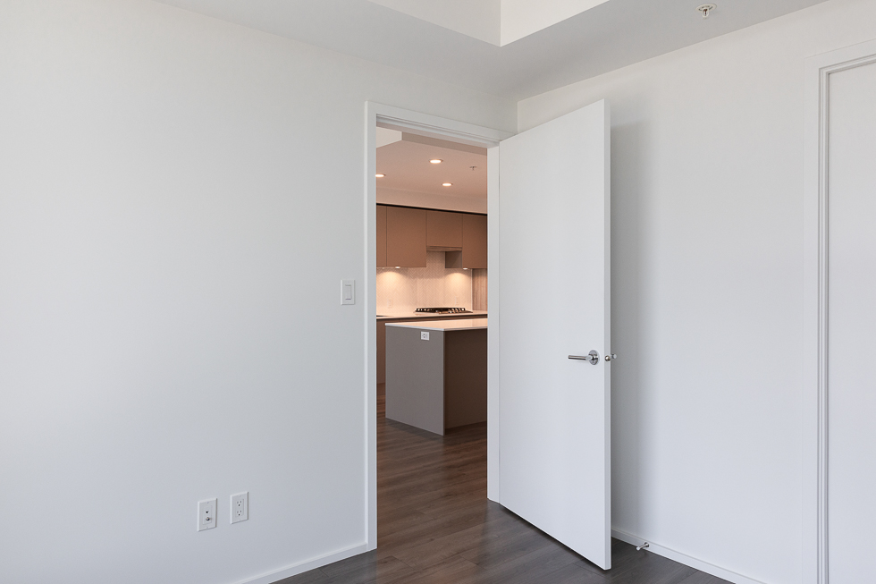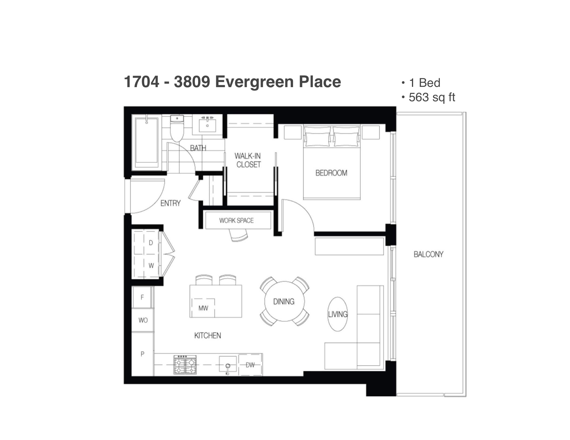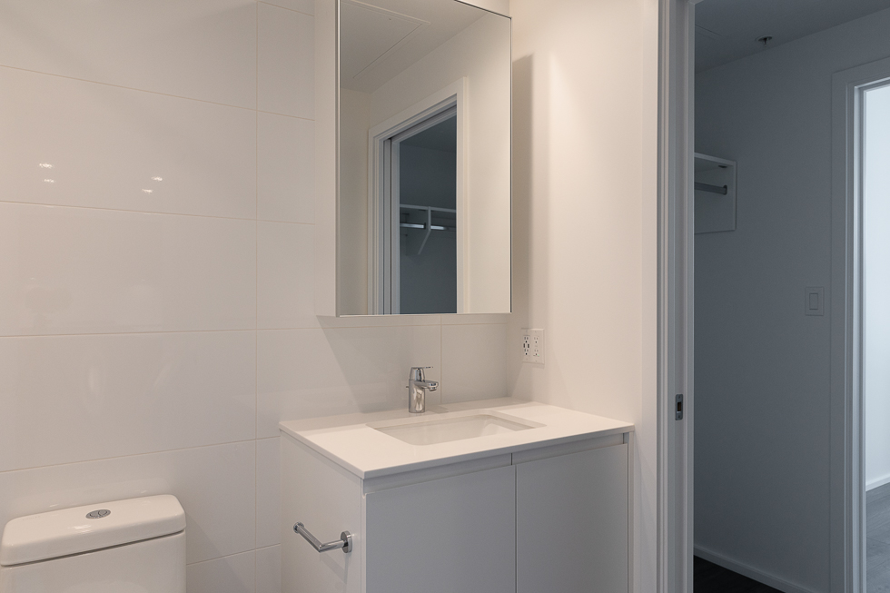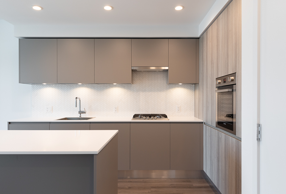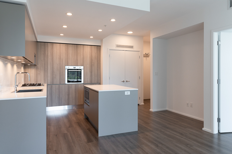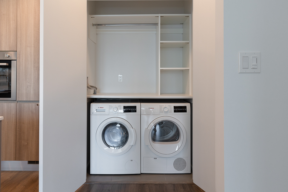 Features in this 17th floor unit include a modern open plan kitchen with worktable island with space for seating, integrated and stainless steel appliances, large balcony with views of city, greenspace, and mountains, primary bedroom with walk-in closet with hanger rods and shelfs on both sides, bathroom with 2 entrances, can be accessed via the living space and the primary bedroom, Air Conditioning, and in-suite washer and dryer (side-by-side) with built ins for functionality.