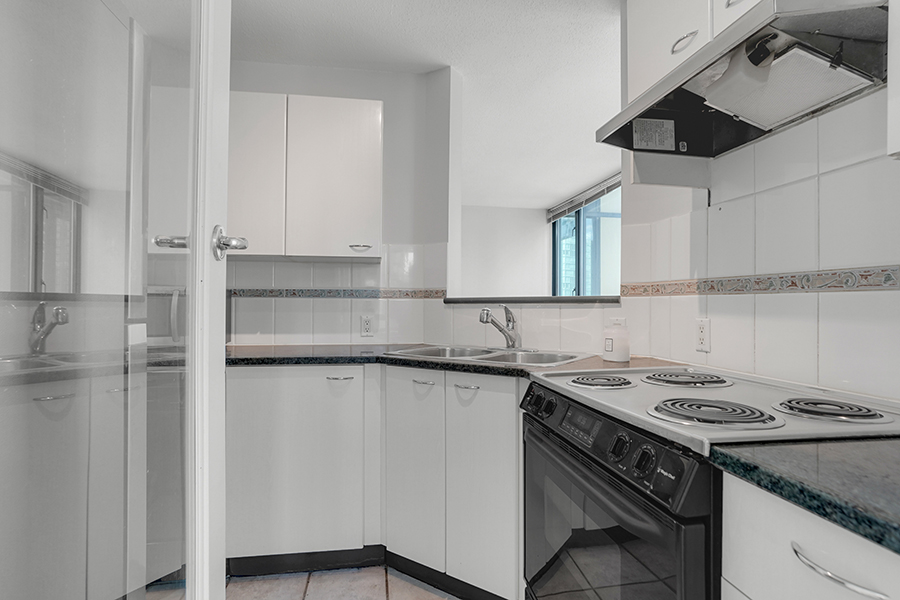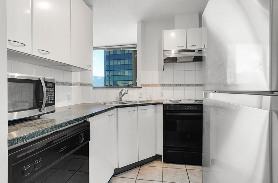 Features in this corner unit include floor-to-ceiling windows, appliances: Fridge, Stove, Oven, Dishwasher & Microwave, engineered laminate wood flooring, den with windows, perfect for a home office, partial Mountain views, and in-suite washer and dryer.