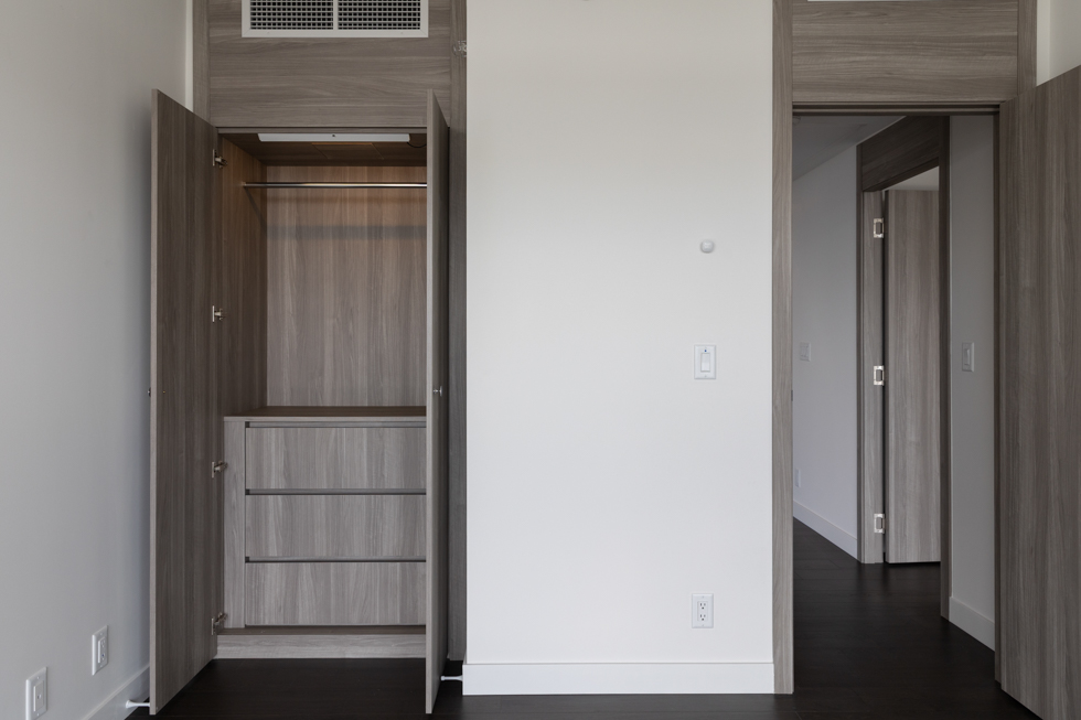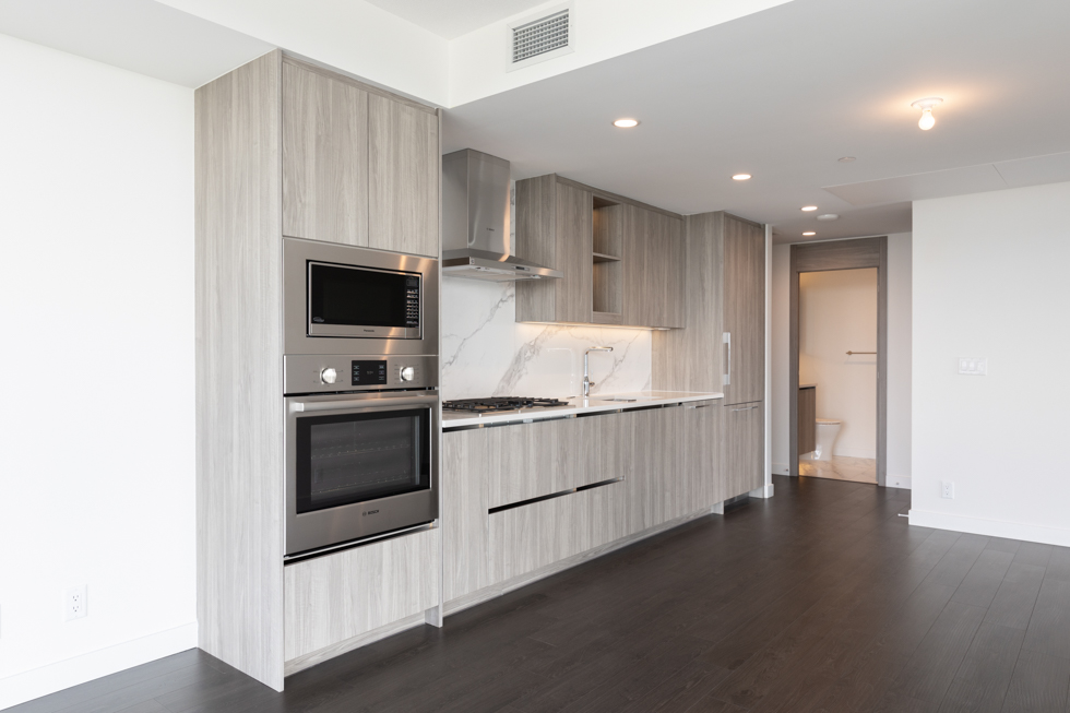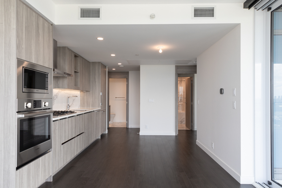 Features in this 39th floor unit include dark roller shades, electric blinds in the living room, in-unit central heating & air conditioning, unobstructed views of Brentwood, sliding glass doors that open up the corner or living room to flow seamlessly onto the 340 sq ft covered wraparound balcony, modern kitchen with island and quartz countertops, full-size stainless-steel appliances: fridge, stove & oven, dishwasher, and microwave, smart home thermostat, covered balcony with Radiant heat, and in-suite washer and dryer