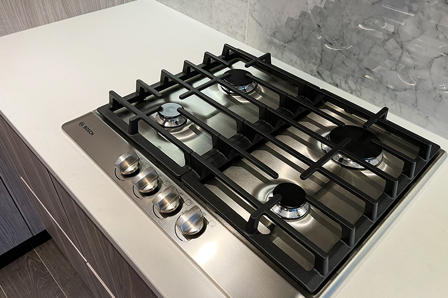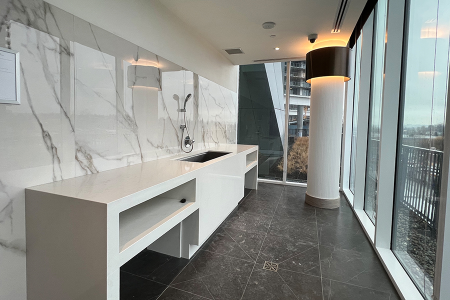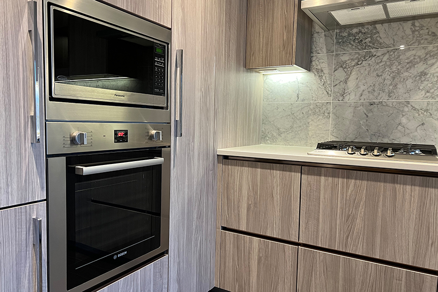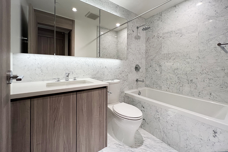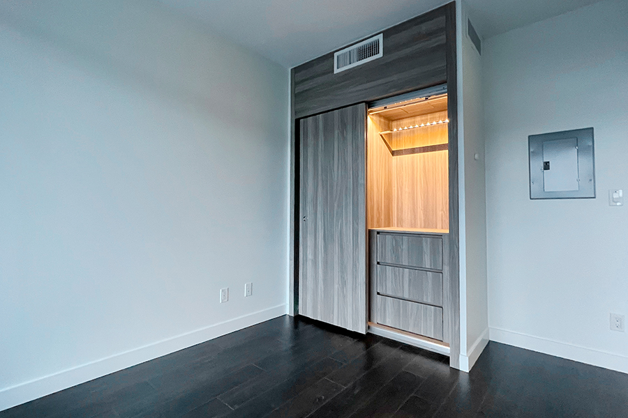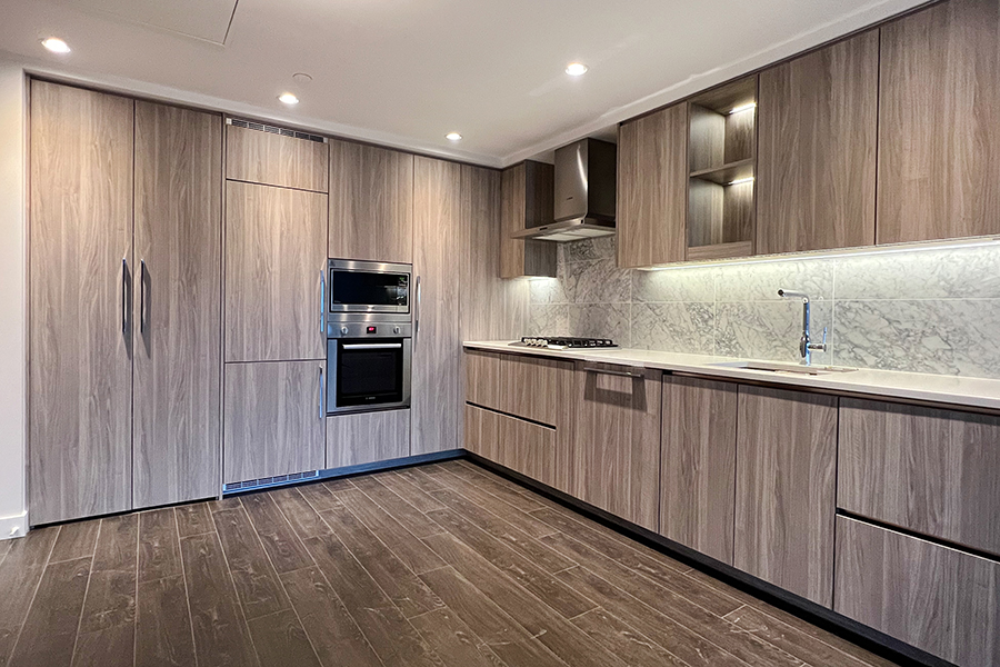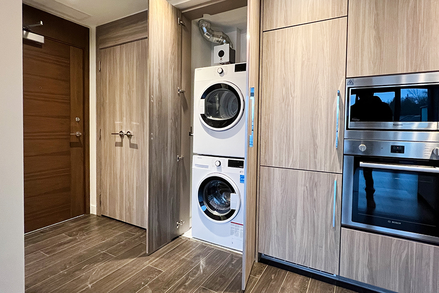 Features in this 6th floor unit include in unit central heating & air conditioner, 188 sq ft of balcony, modern Kitchen with island and quartz counter tops, full-size Stainless-steel appliances: fridge, stove & oven, dishwasher, and microwave, smart home thermostat, covered balcony, and in-suite washer and dryer.