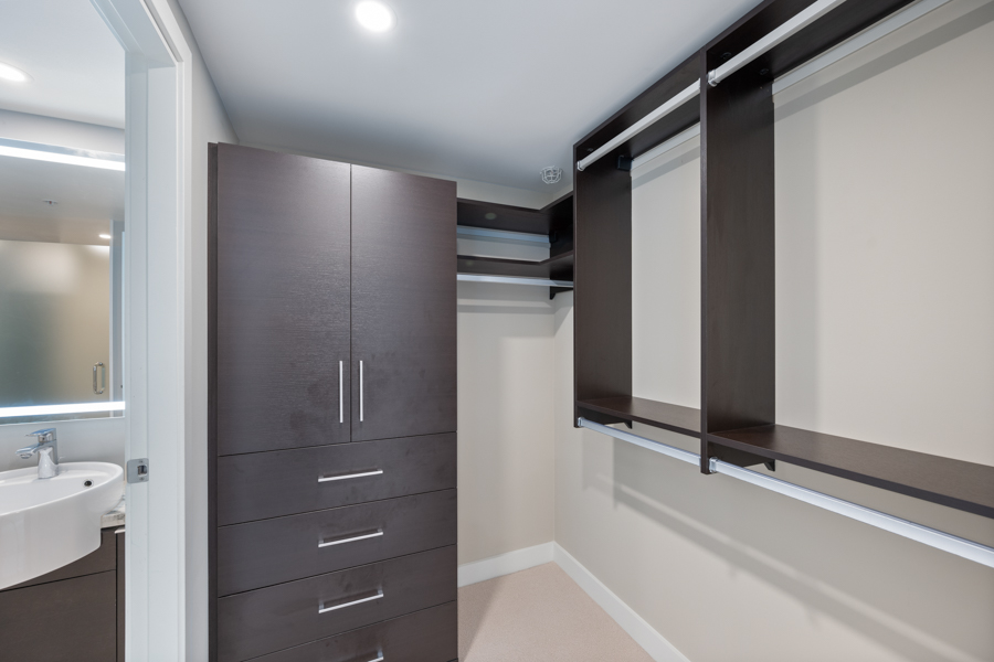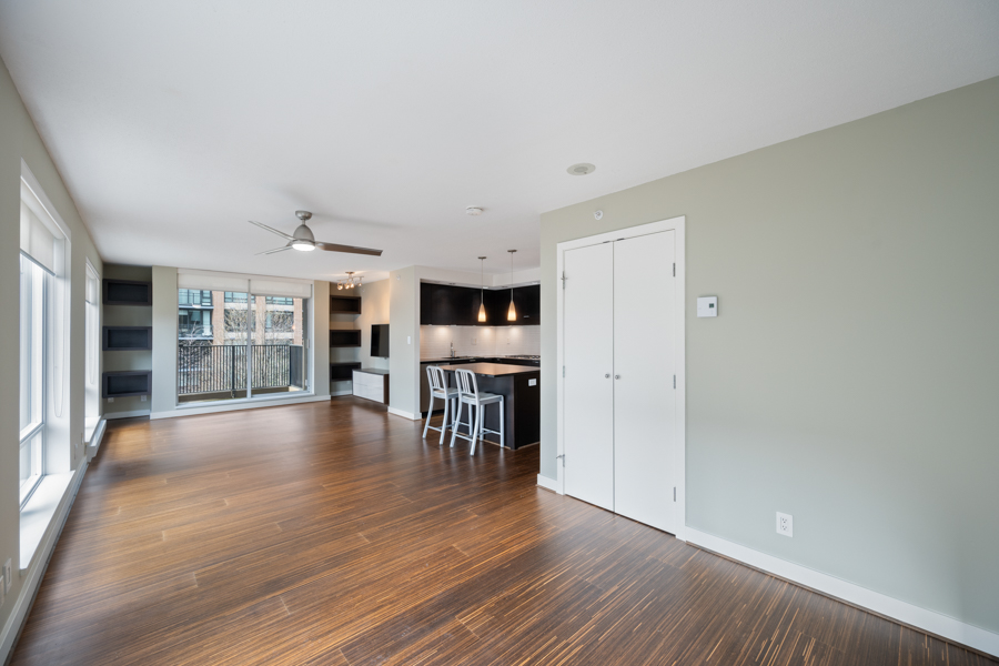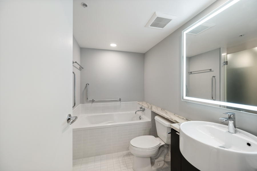 Features in this spacious 6th floor unit include contemporary design with custom millwork in living room and closets, modern open plan kitchen includes a kitchen island with additional storage and breakfast bar seating, stainless steel appliances include: fridge, gas cooktop, oven, dishwasher, and microwave, primary bedroom has walk in closet and ensuite bathroom, ensuite bathroom has a deep soaker tub and an extra-large shower with 2 shower heads (shower is accessible from both bathrooms), located on the quiet side of building, faces South-West, private covered balcony overlooking courtyard, and in-suite washer and dryer