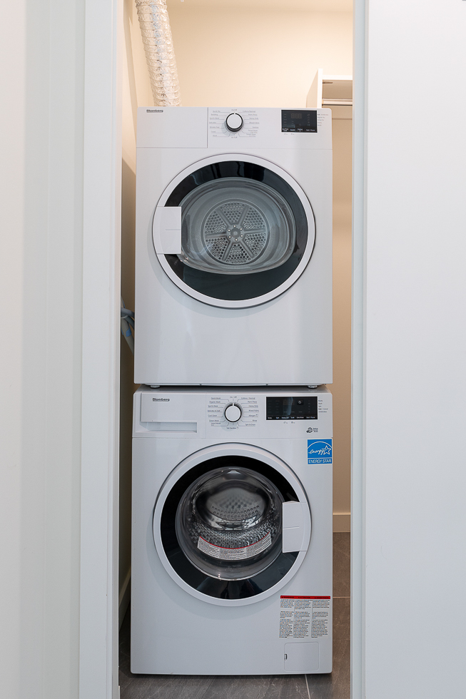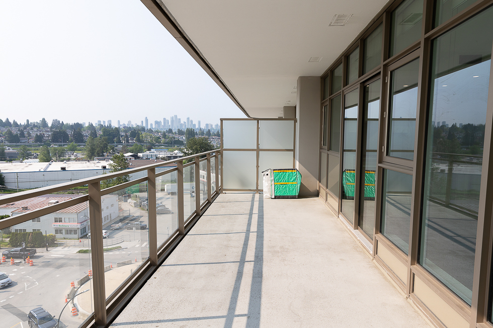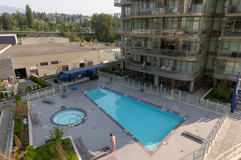 Features in this 7th floor corner unit include south east views of Burnaby, 9′ ceilings, central A/C and heating, spacious open kitchen with breakfast bar, integrated and stainless steel appliances, laminate flooring throughout living, dining, & kitchen, 273 sqft wraparound patio, and in-suite washer and dryer.