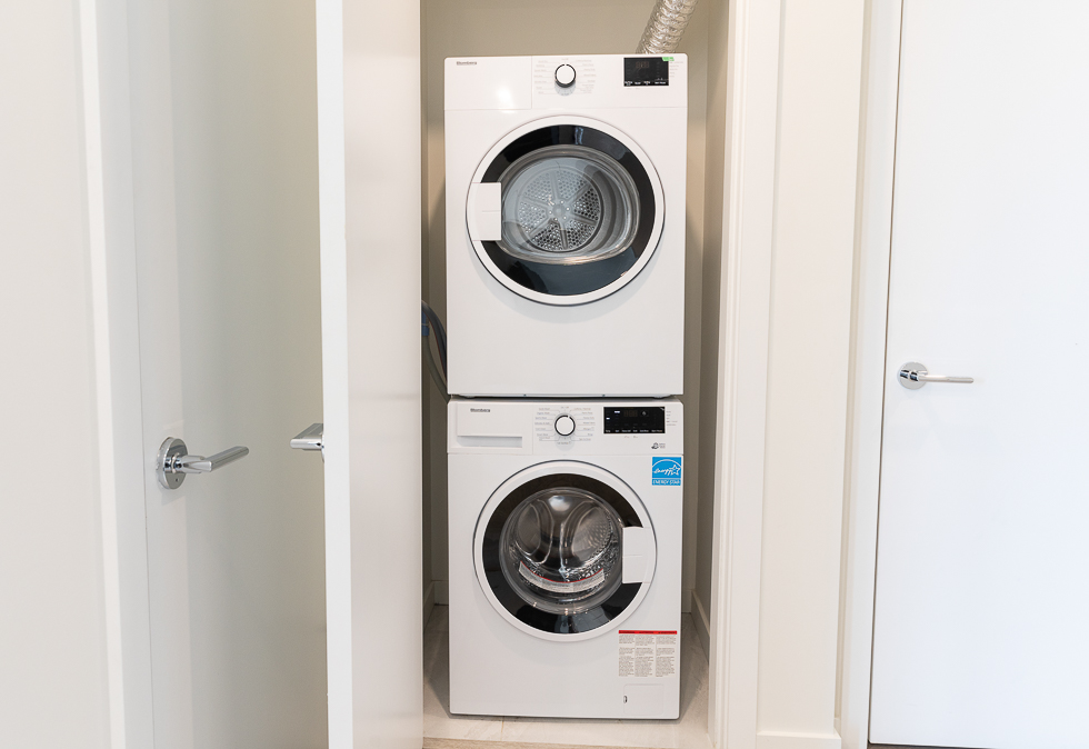 Features in this corner unit include, 9’ ceilings, flex space/den, central Air-conditioning and heating, spacious kitchen with island peninsula, integrated & stainless-steel appliances, laminate flooring throughout living, dining and kitchen areas, spacious private terrace (156 sq ft), and in-suite washer and dryer