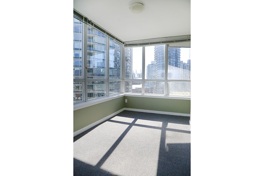 Features in this unit include Bright, corner unit open plan living, full-size stainless steel appliances: Fridge, Dishwasher, Gas Stove, Oven, Microwave, gas fireplace, air-conditioning, den perfect for a home office, extra storage room or nursery, laminate oak wood flooring throughout, covered private patio, south views of False Creek and Science World, secured building, and in-suite washer and dryer. Amenities include concierge, gym, party room, indoor pool, and sauna/steam room.