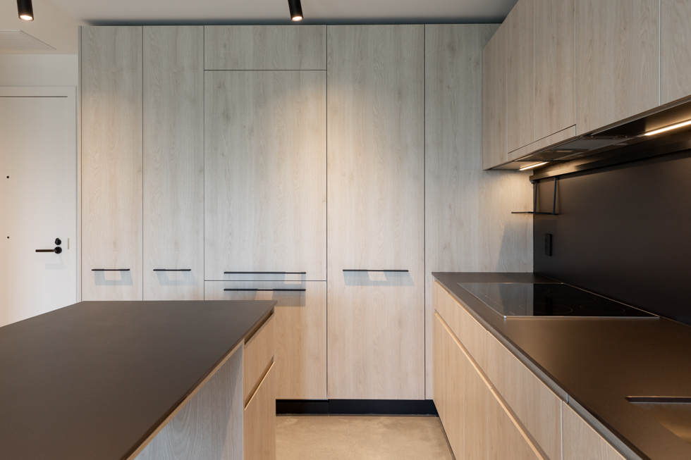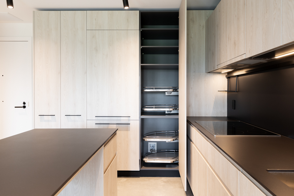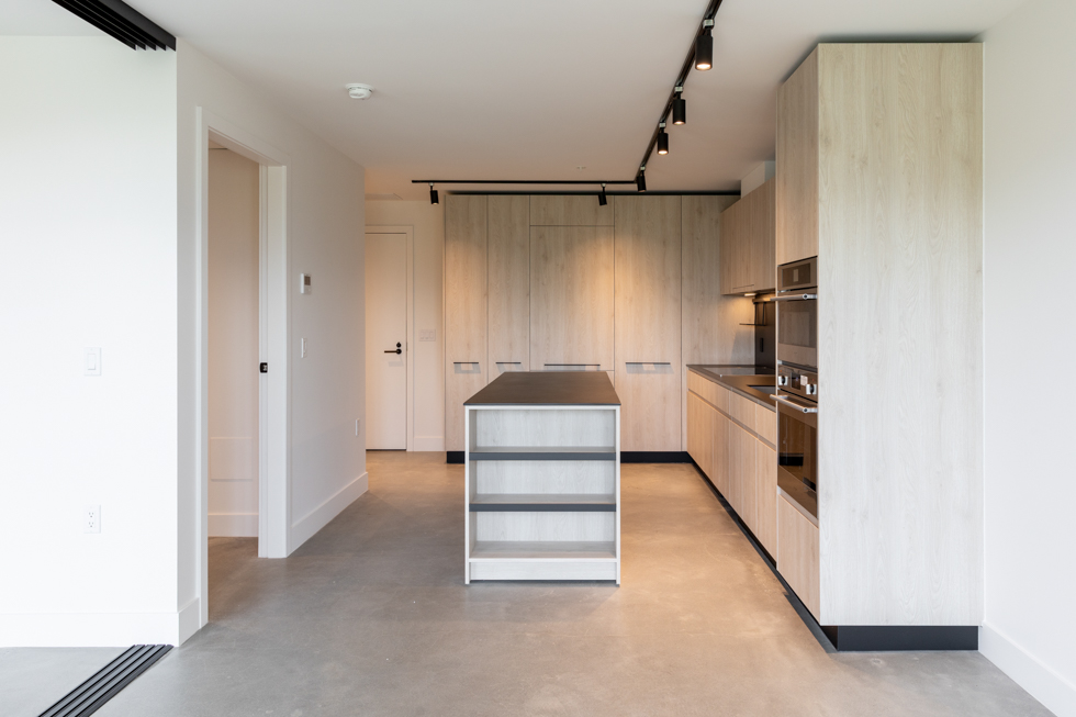 Features in this 3rd floor unit include a “Cressy Kitchen” with lots of built in storage and swing-out pantry, integrated and stainless steel appliances including: fridge, glass cooktop, dishwasher, wall oven, and built in microwave, a functional kitchen island with more storage and room for seating, flex space off of kitchen area, living area with built-in desk/entertainment nook, sliding frosted glass wall to bedroom area, opens wide for a more spacious feel, built in wardrobe in the bedroom, this unit has an oversized patio that looks out over green roof. The parking stall for this unit is EV ready if needed, but has not been installed. In-suite washer and dryer