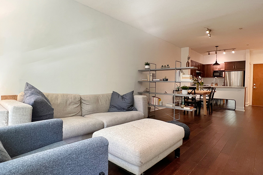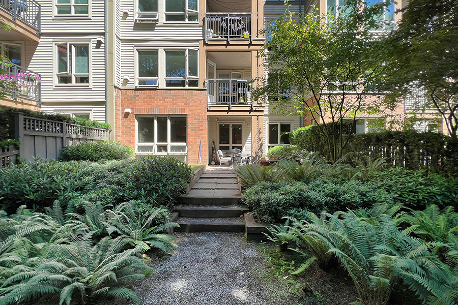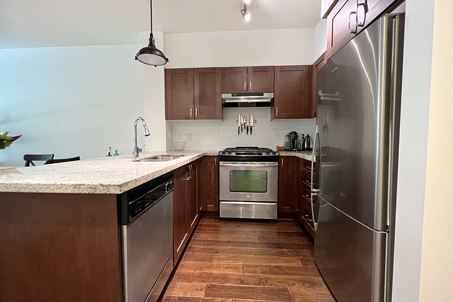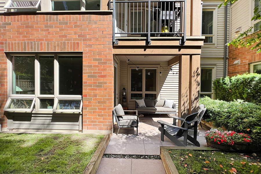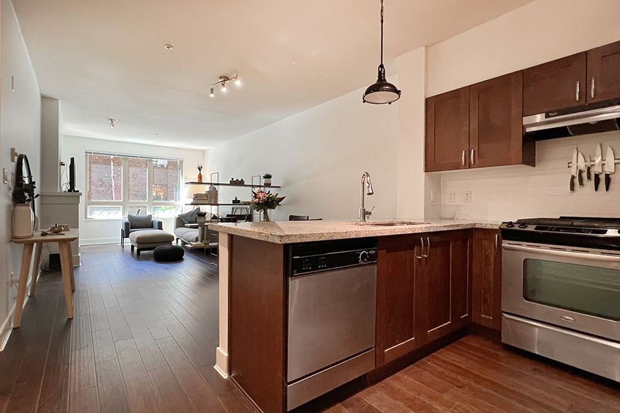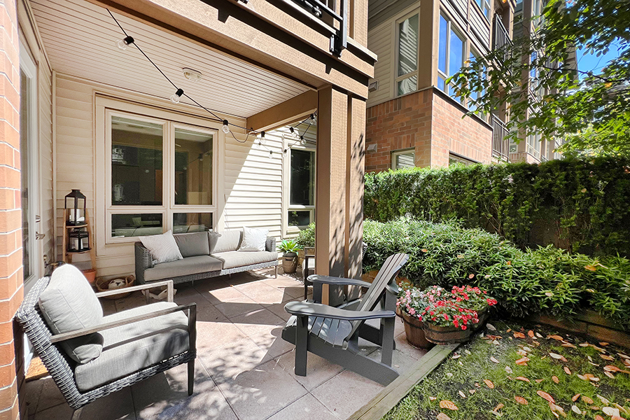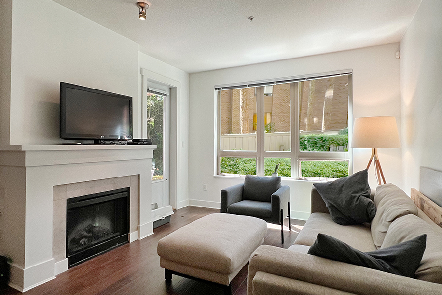 Enjoy Lynn Valley life in this property featuring a gas fireplace, engineered hardwood throughout, 9 ft ceilings, open concept kitchen with granite countertops, stainless steel appliances, & gas range, primary bedroom with walk-in closet, well-appointed ensuite bathroom with soaker tub, stand-up shower, & side-by-side sinks, in-suite washer and dryer, and large covered patio.