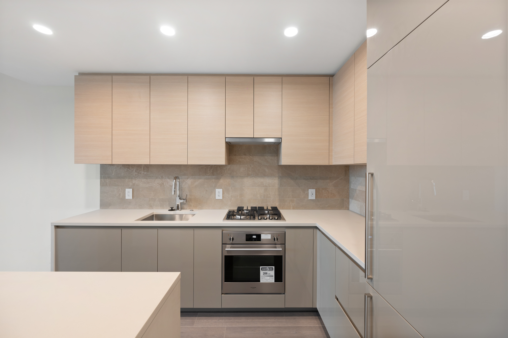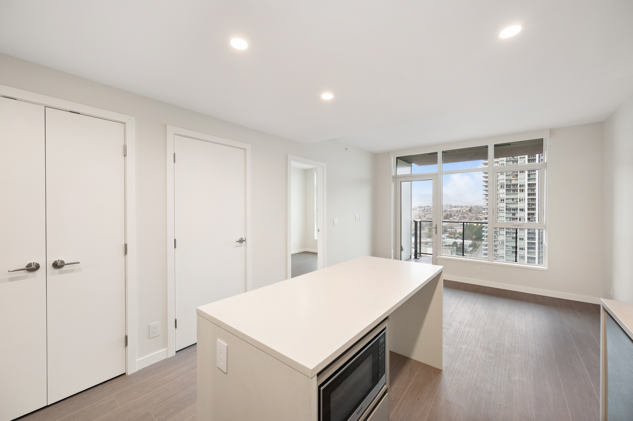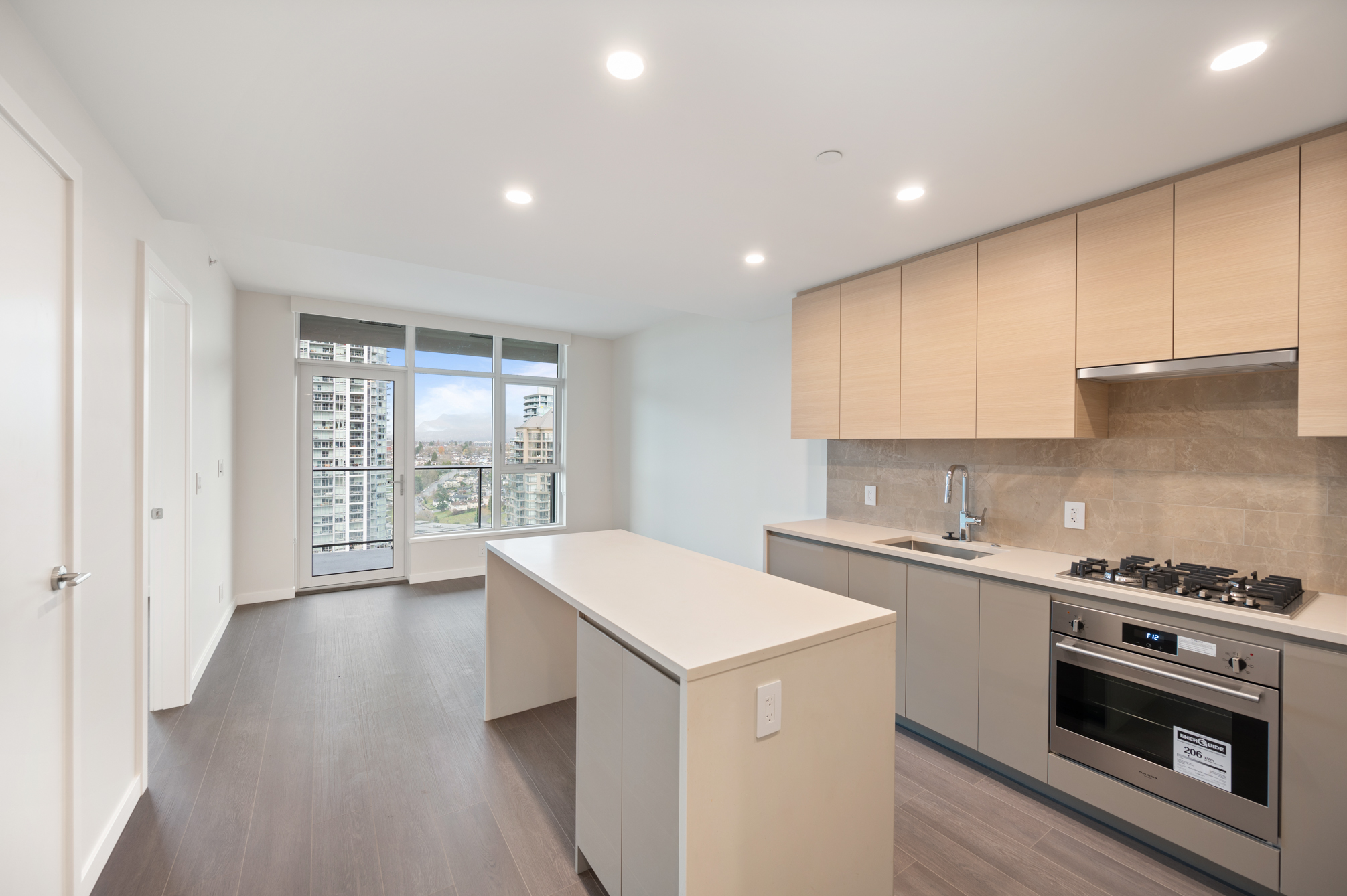 Enjoy the views from this 27th floor unit. Features include high-end stainless steel and integrated appliances: Fridge, Fulgor gas cook top, oven, dishwasher, and microwave, quartz kitchen island, countertops & backsplash, built-in nook for work space, central air-conditioning & heating, unobstructed city and mountain views, private balcony, and in-suite washer and dryer