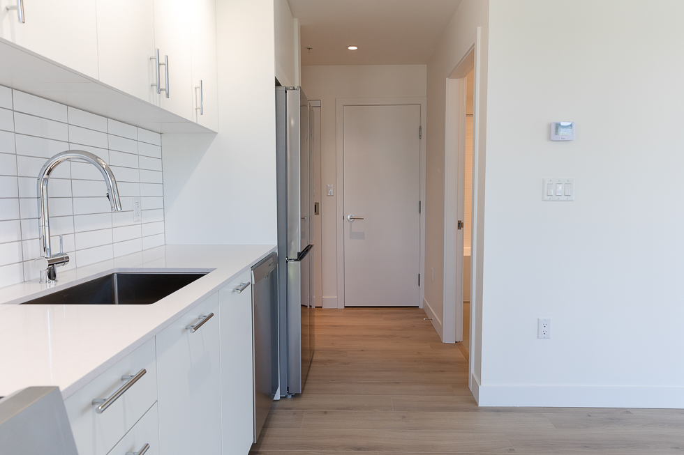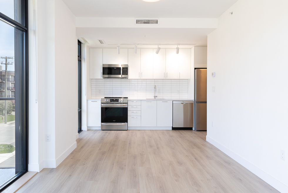Features in this brand new unit include Air Conditioning, floor to ceiling windows, bright and modern kitchen with quartz counter tops and white subway tile backsplash, full-size stainless-steel appliances, wide plank laminate flooring throughout, covered balcony, and in-suite washer and dryer