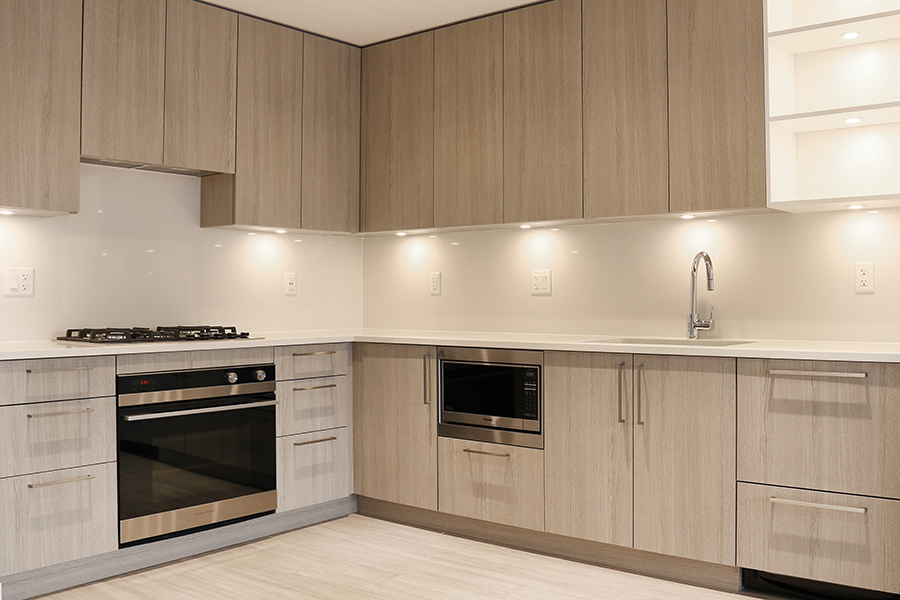 Features include over height 9-foot ceilings, air-conditioning, integrated Stainless Steel Fisher & Paykel Appliances: fridge, gas range, oven, dishwasher & Panasonic microwave, superior quality wood-laminate kitchen cabinetry with soft close doors and drawers, premium quartz slab countertop & backsplash, under-cabinet lighting, built-in space-saving features, roller blinds in all rooms, laminate flooring throughout, covered patio, in-suite washer and dryer