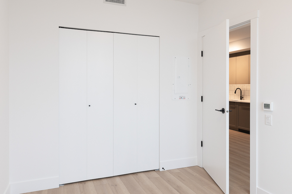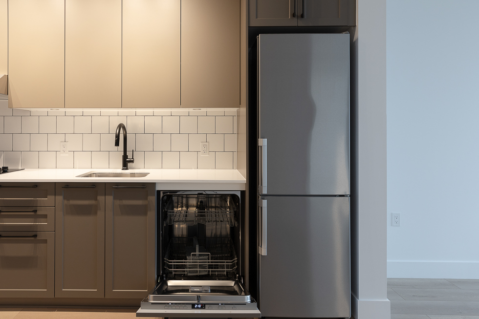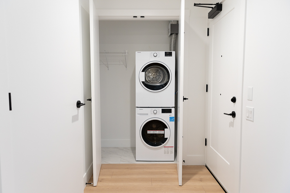 Features in this 8th floor unit include a central heating system, floor to ceiling windows, laminate flooring throughout, full-size Stainless-steel & integrated appliances, Juliette balcony, and in-suite washer and dryer