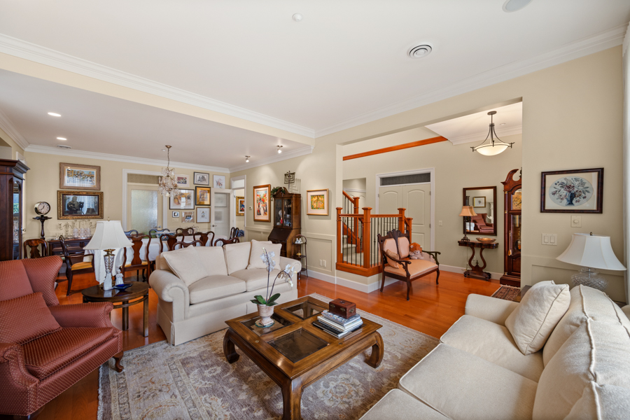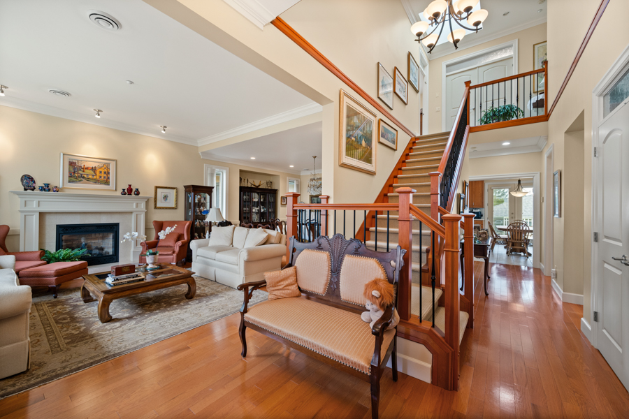 It also boasts central air-conditioning & radiant heating, 2 gas fireplaces, over height ceilings throughout and a soaring double height entryway ceiling, spacious primary bedroom on main floor with walk-in-closet and ensuite bathroom with a soaker tub, walk-in shower, and double-sink vanity. Beautiful hardwood floors throughout living spaces, carpeting in upstairs bedrooms. Versatile study/flex spaces – ideal for a home office, gym or bedroom. Large lower level – perfect as a game room with a live-in nanny suite
