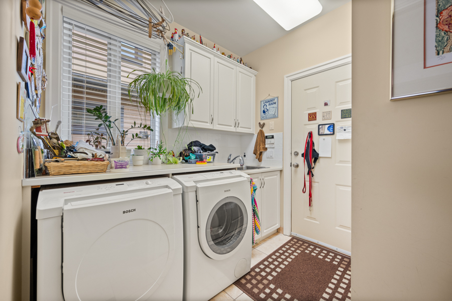 The conveniences of a main floor mid and laundry room with Bosch washer and dryer, and cabinets for storage, central vacuum, automated sun filter blinds in eat-in kitchen and family room, over 400 sq ft of immaculately finished basement crawl space for storage, a security system for peace of mind, and the detached 3 car garage