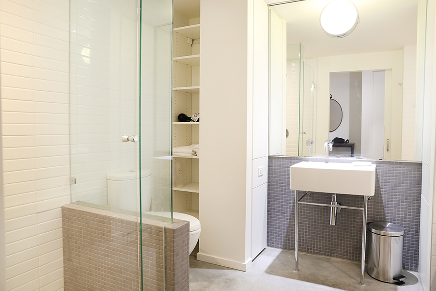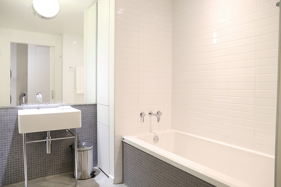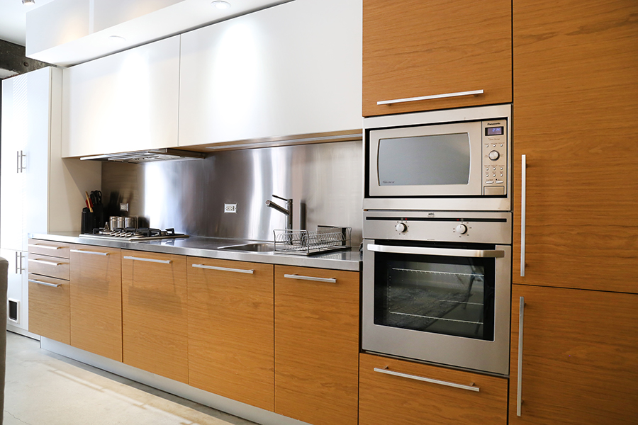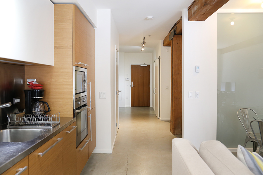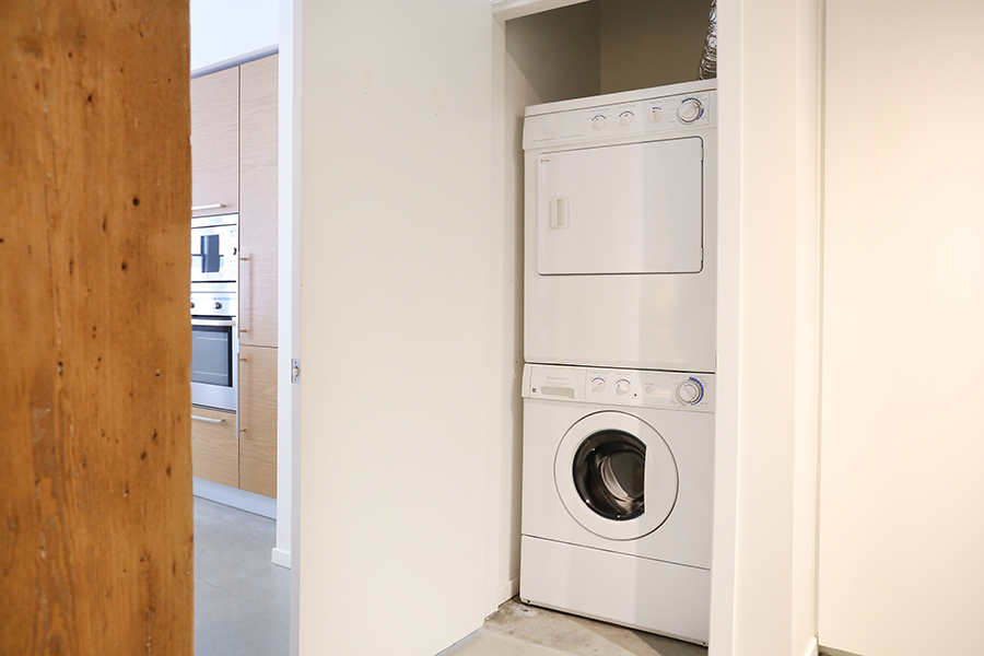 Features include open plan living, premium stainless steel and integrated appliances: Fridge, Dishwasher, Gas Stove, Oven, and Microwave, spacious spa bathroom with separate tub and shower, concrete floor, exposed wood beams and original brick wall, double door Juliet balcony, in-suite washer and dryer, and nice contemporary furnishings.