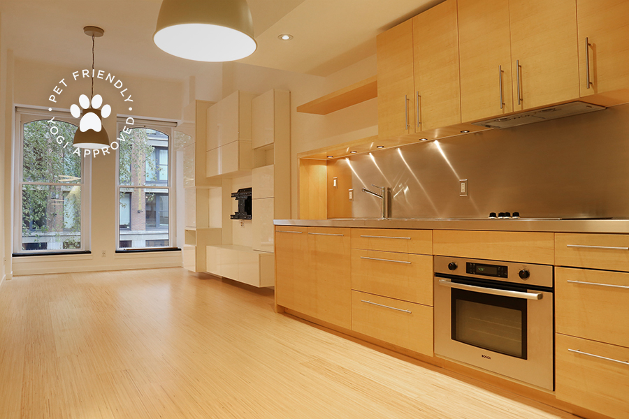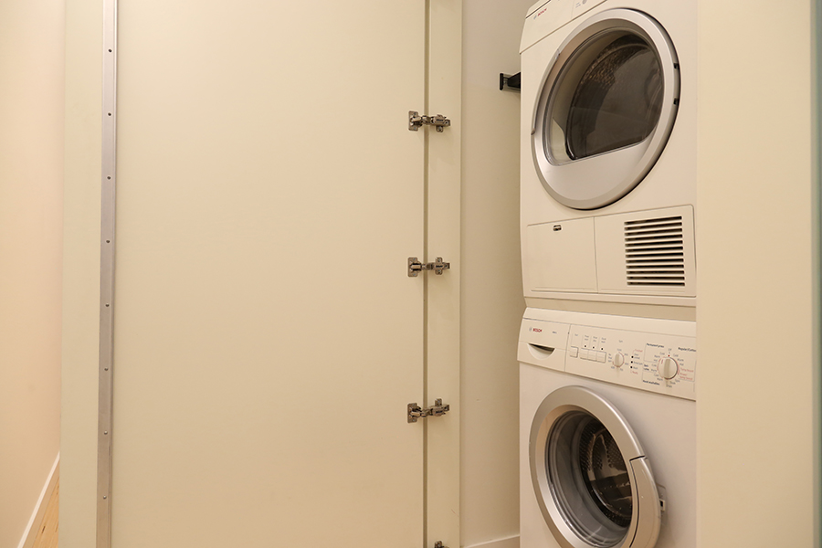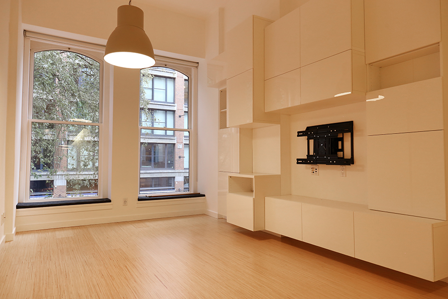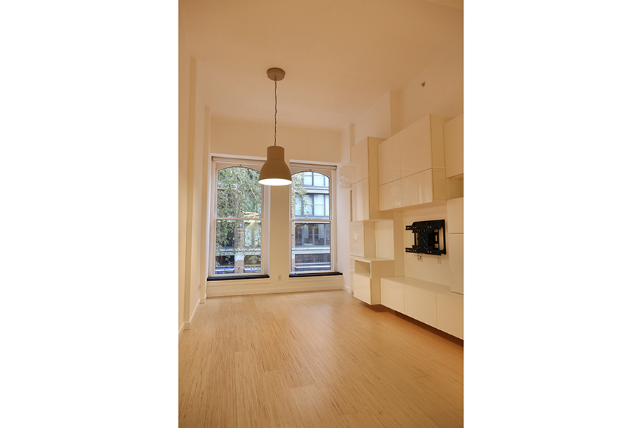 Features in this heritage loft conversion include, gorgeous arched windows facing Water Street, airy 10’ ceilings, engineered hardwood flooring throughout, geothermal heating and cooling (A/C), integrated and stainless-steel Miele & Bosch appliances: fridge, stove, oven and dishwasher, large built-in storage units in bedroom, media storage unit in living room, separate walk-in shower and deep soaker tub, full-size in-suite washer and dryer