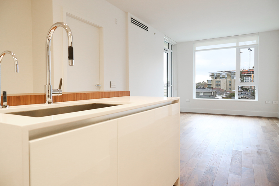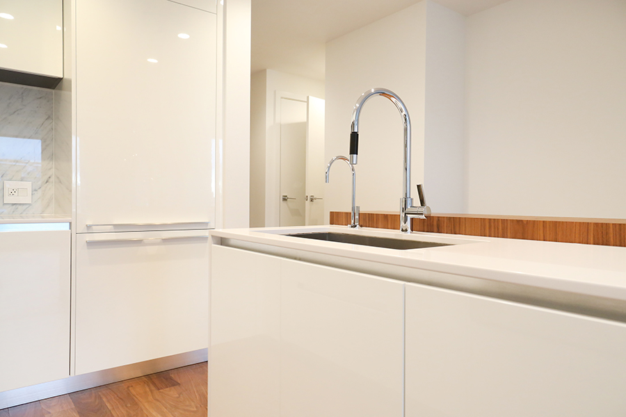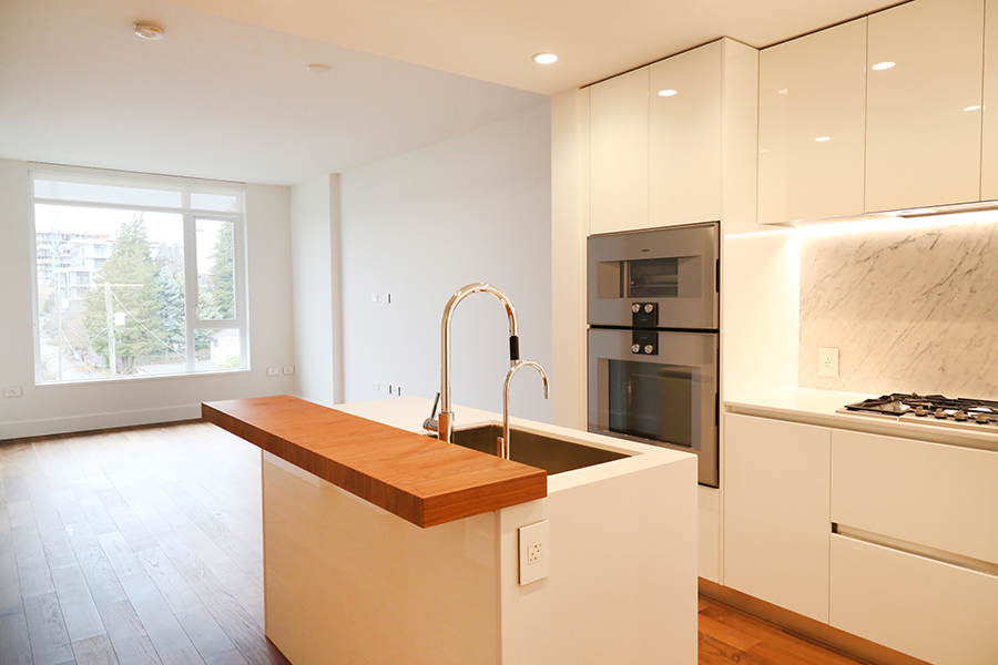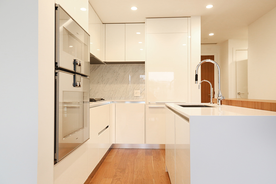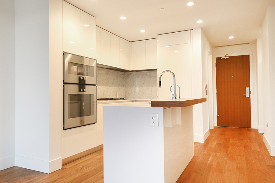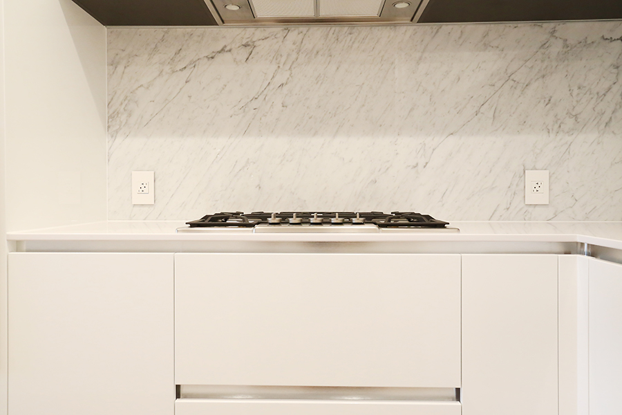 Features include hardwood flooring throughout, air conditioning, oversized windows bring abundant natural light, custom Italian cabinetry, polished stone countertops with elevated island extension, marble backsplash