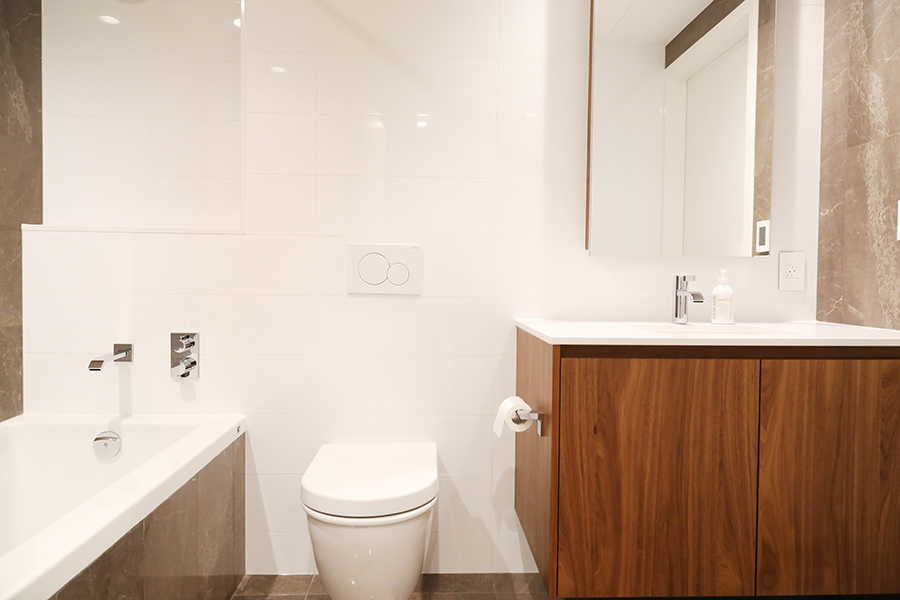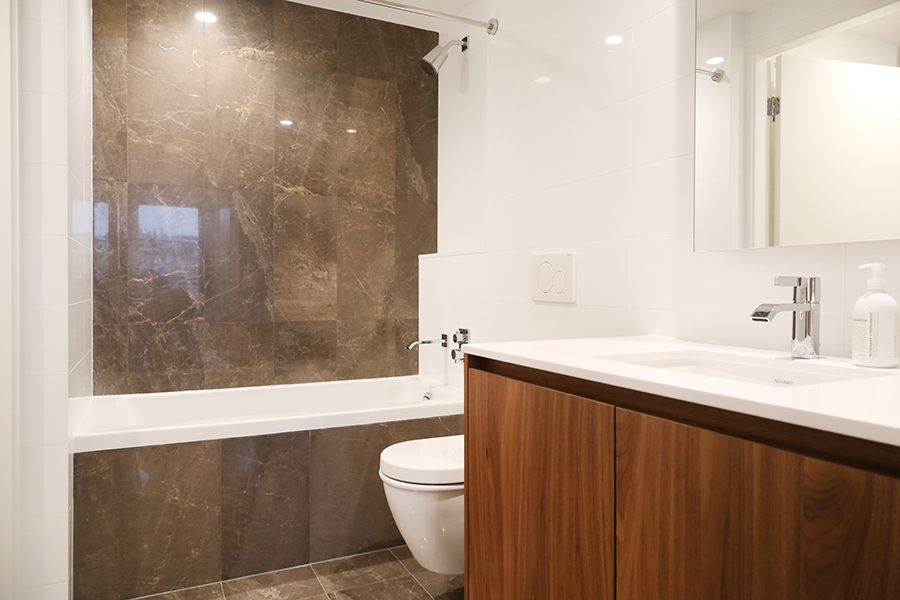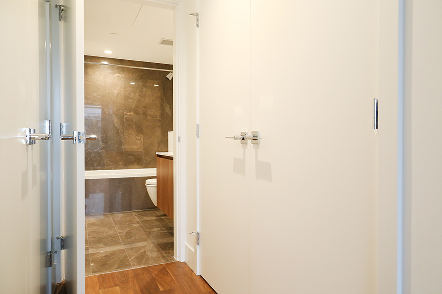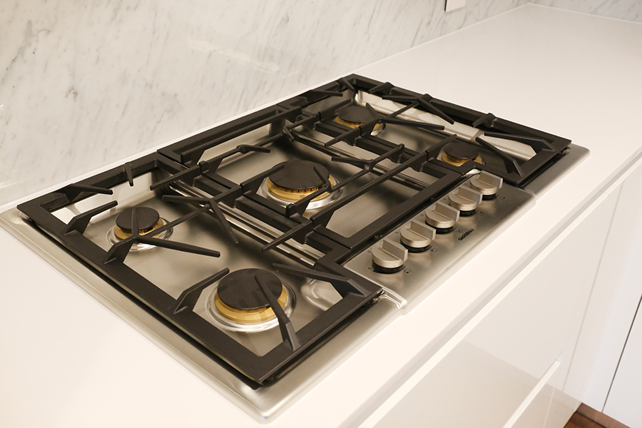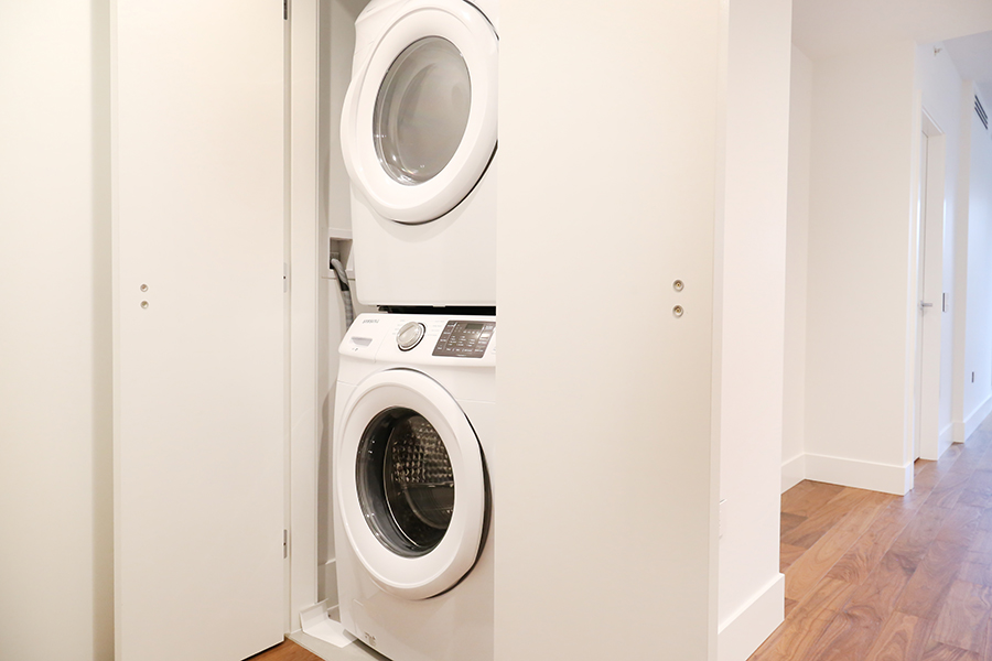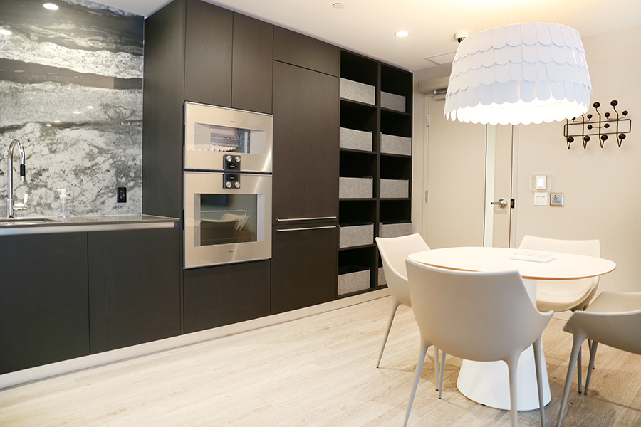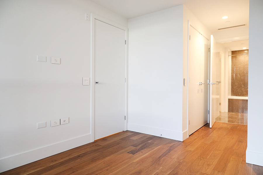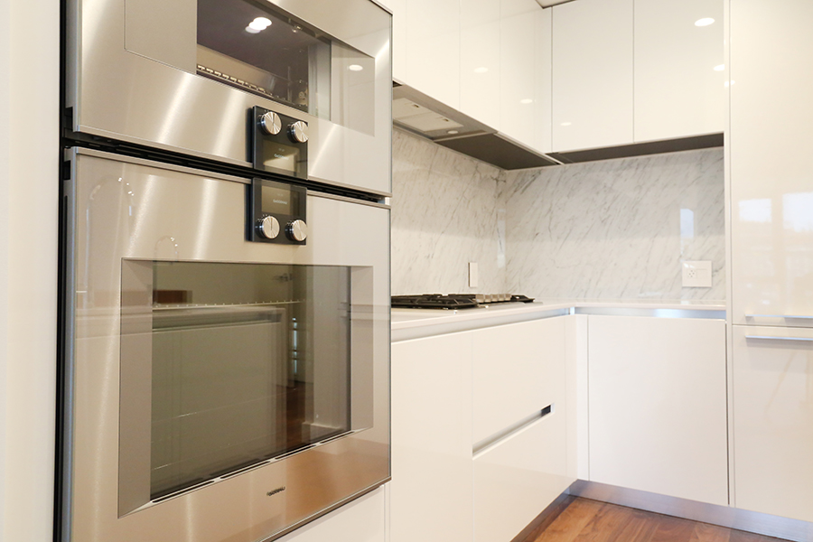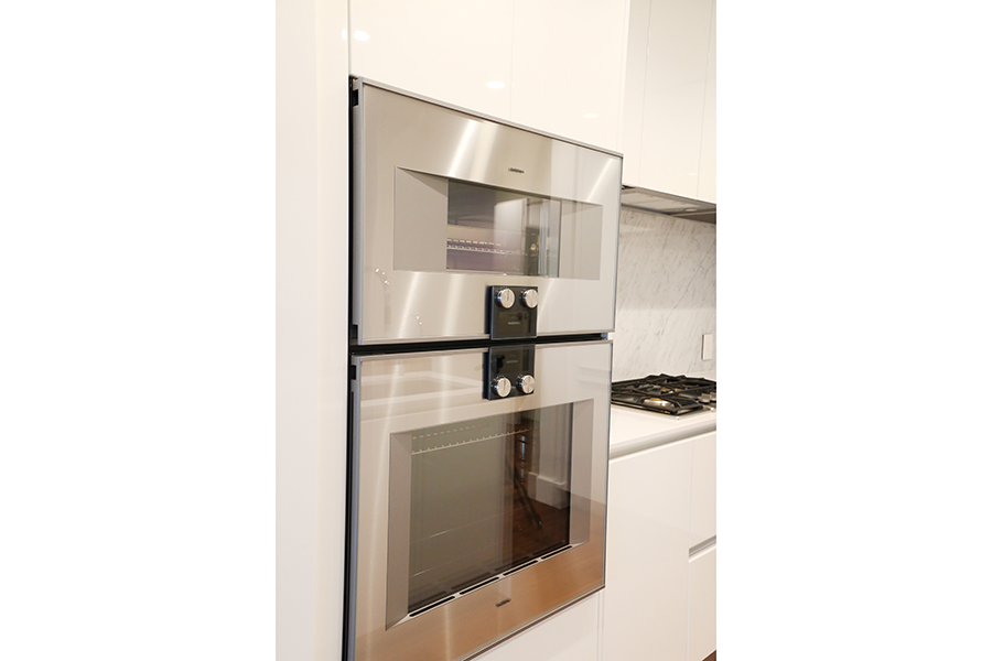 Full-sized stainless steel integrated Gaggenau appliances, 5 burner gas cooktop, large walk-in closet in master suite, nuheat flooring in bathroom, in-suite washer and dryer, private patio with park views