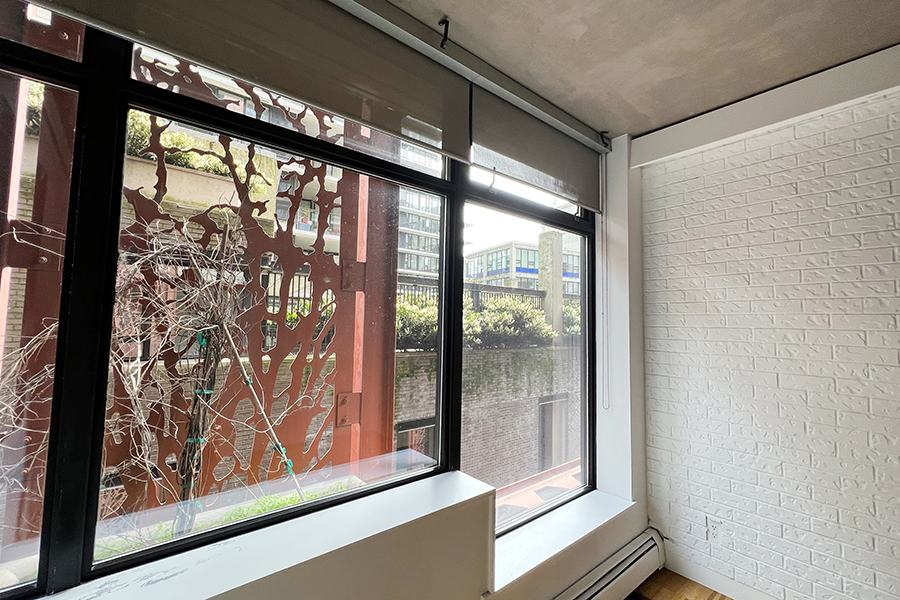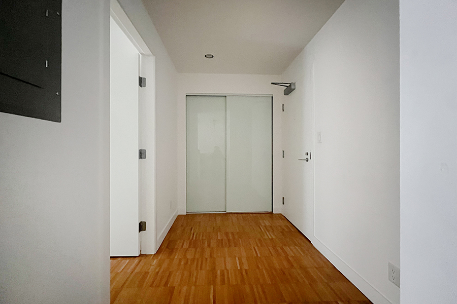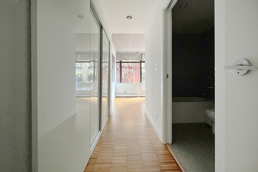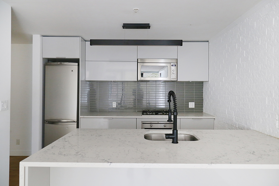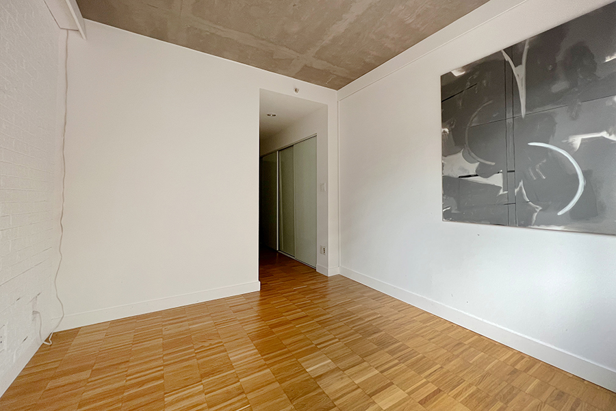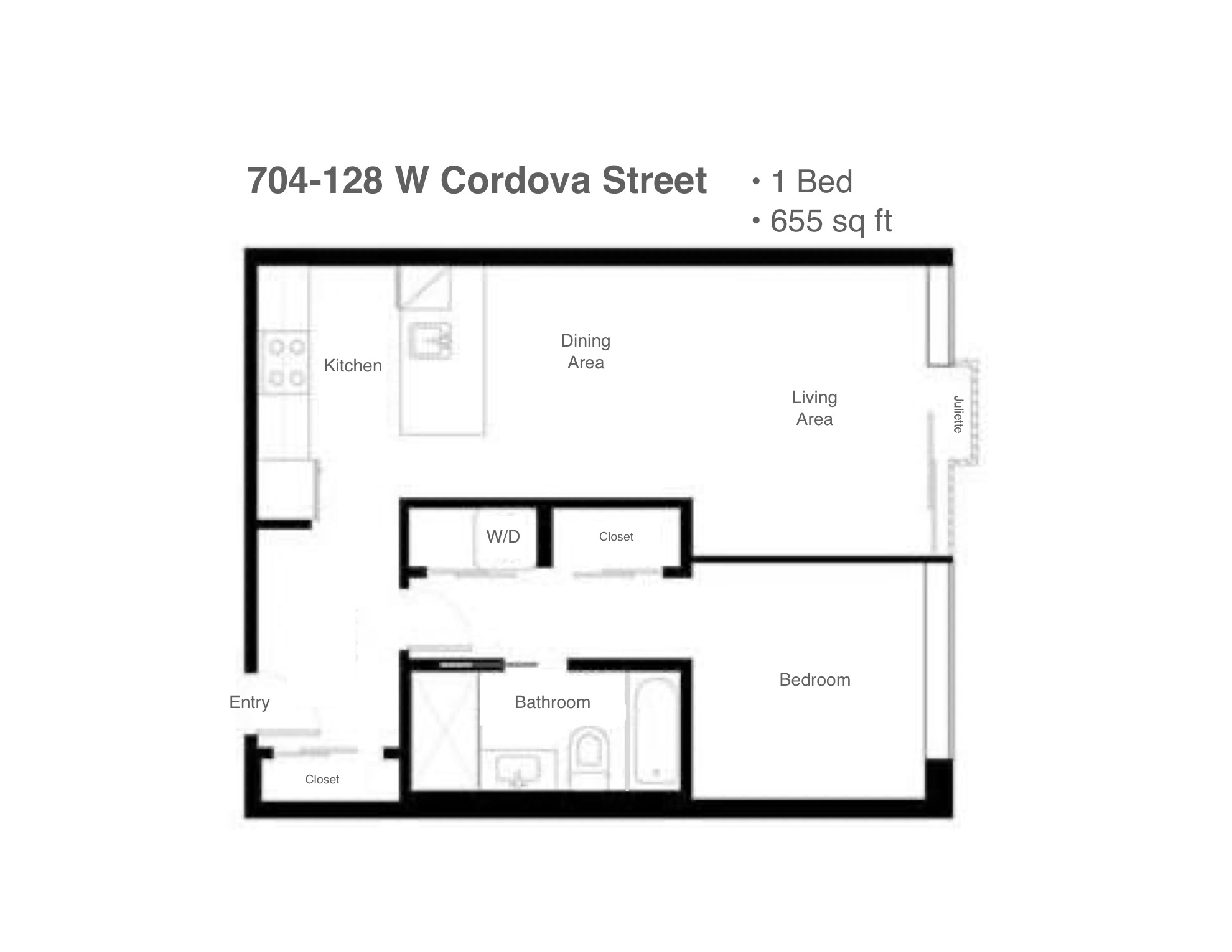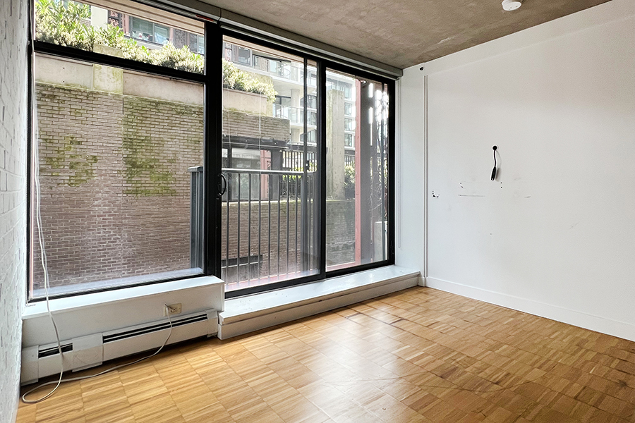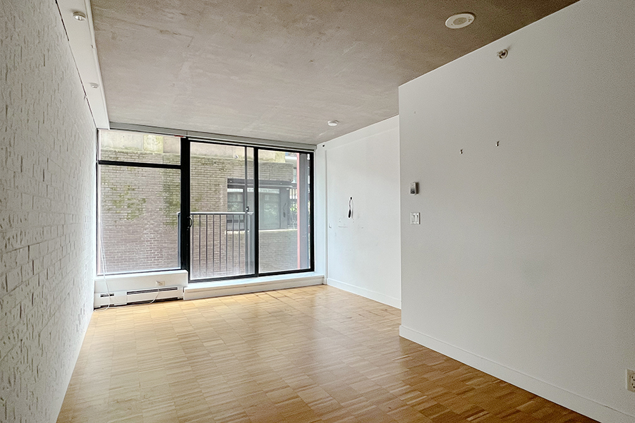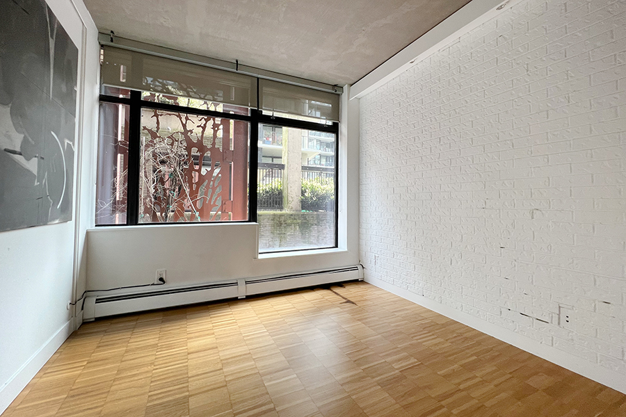 Features in this historic building include over height exposed concrete ceilings, charming brick walls, modern Kitchen with quartz counter tops, full-size Stainless-steel appliances: fridge, stove & oven, dishwasher, and microwave, engineered hardwood flooring throughout, bathroom with separate bath tub and shower, sleek grey slate tile flooring, closet shelving with high gloss doors, covered balcony, and in-suite washer and dryer.