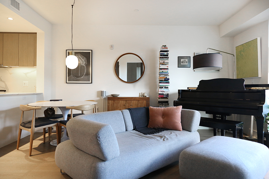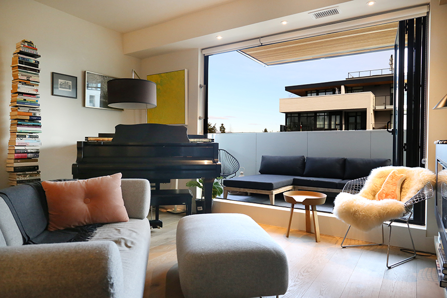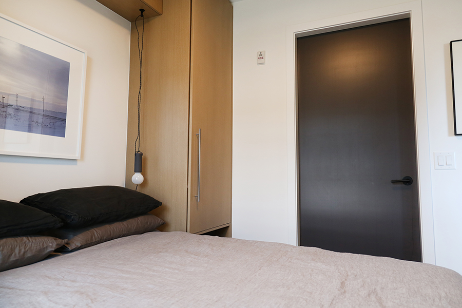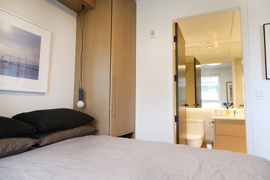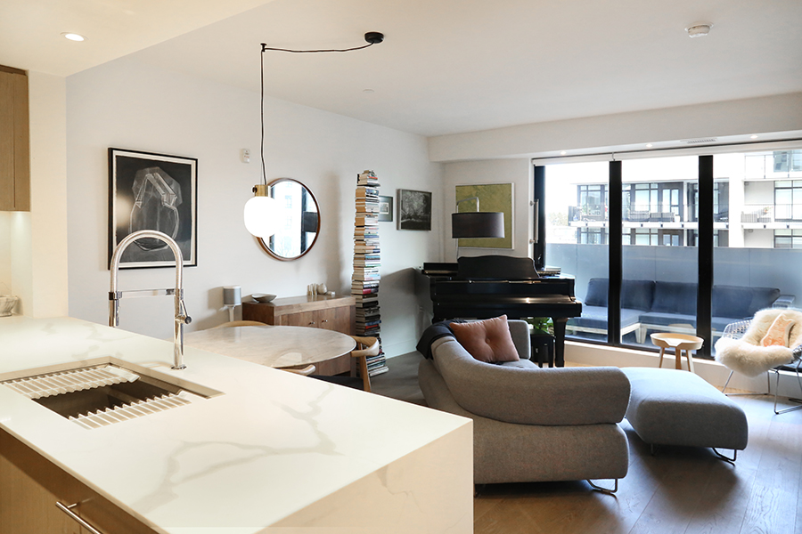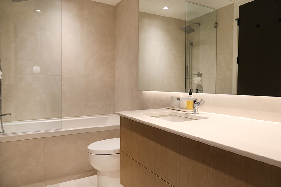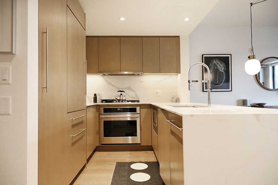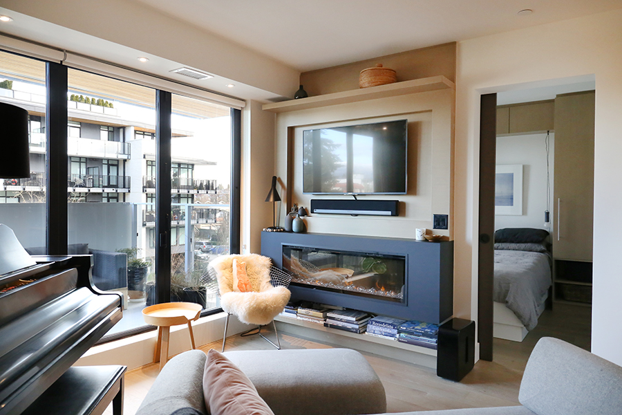 Features in this unit include open plan living, monogram collection professional-grade appliances, including an Energy Star refrigerator, 5 burner gas cooktop, stainless steel wall oven, dishwasher, built-in microwave, and stainless steel hood vent, marble-look quartz countertops, and backsplash in kitchens and bathrooms, European wide plank white oak hardwood flooring, custom millwork in the bedroom and living room, wall-mounted linear fireplace integrated into a custom millwork feature wall, folding glass window wall in the living room, built-in bedroom closets, Kohler bathroom fixtures, ensuite bathroom with Nuheat in-floor heating, air-conditioning, spacious private outdoor terrace with gas connection for BBQ, and in-suite Energy-efficient GE washer and dryer