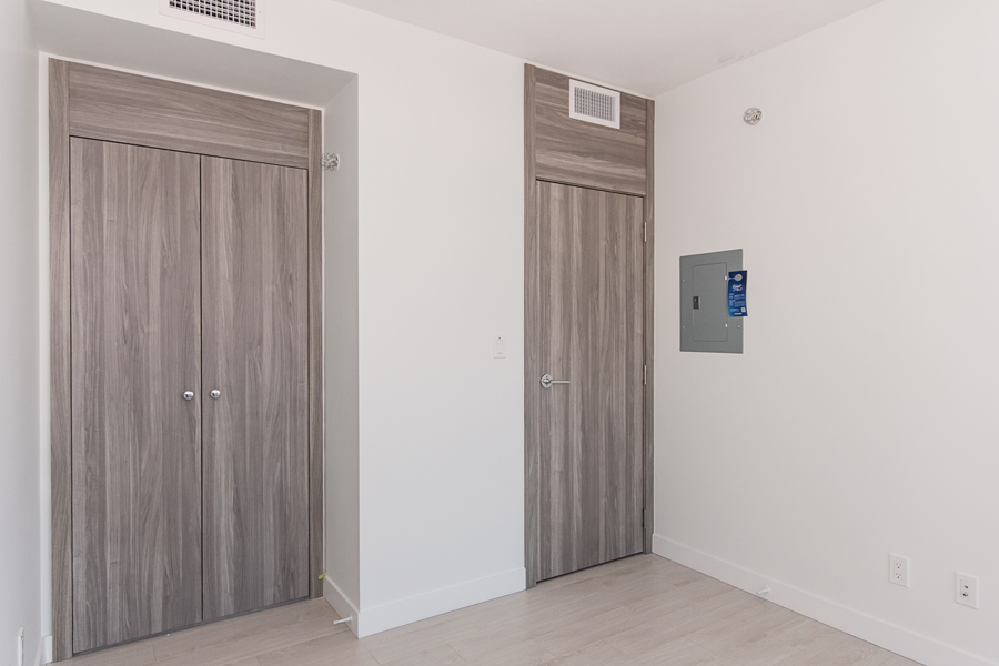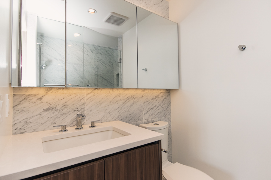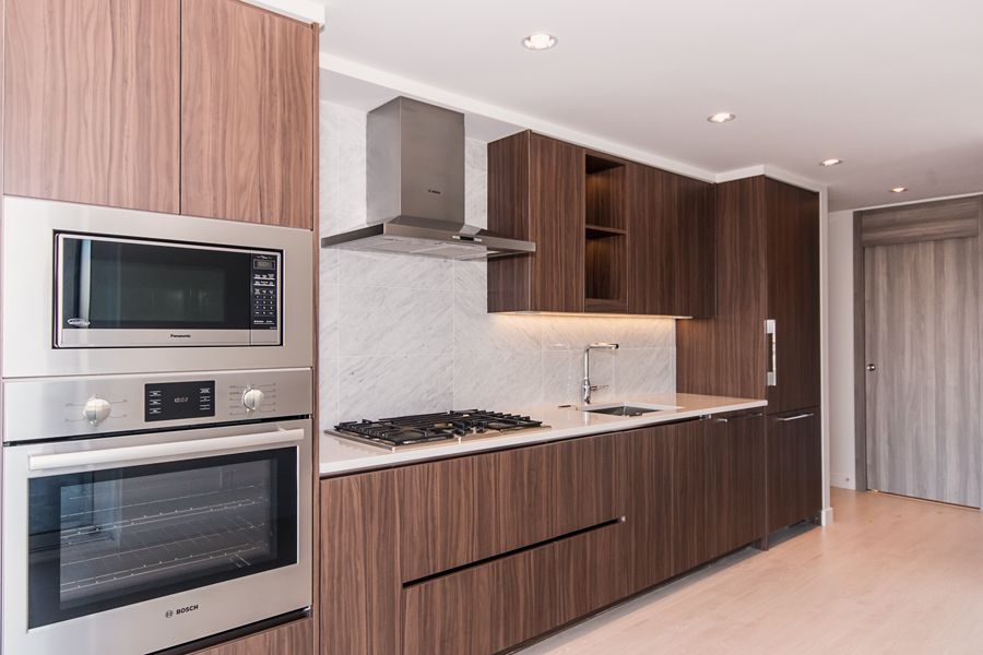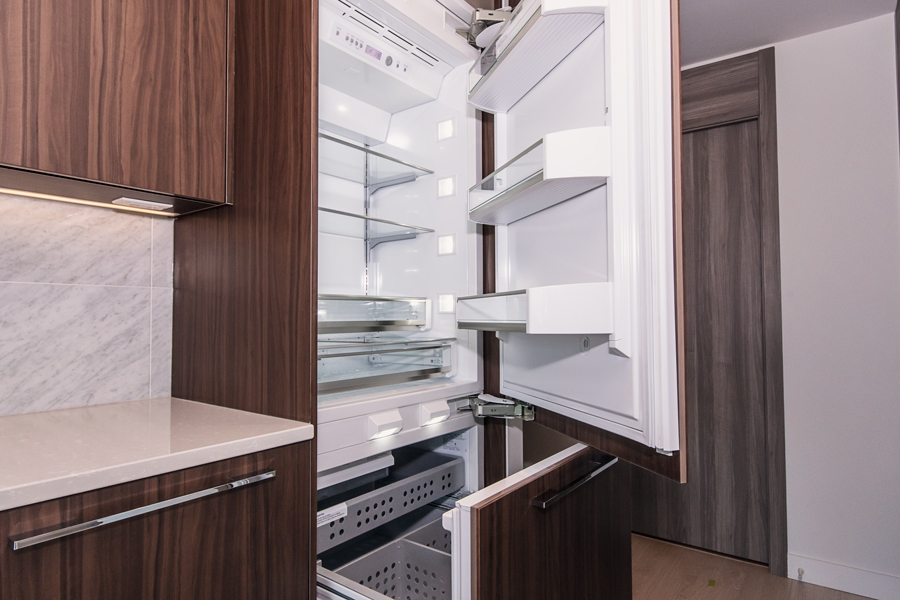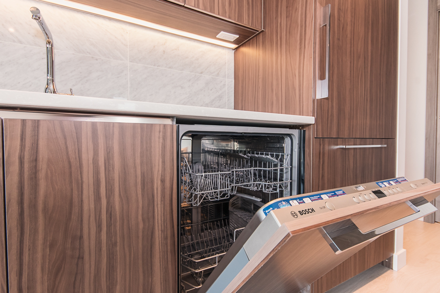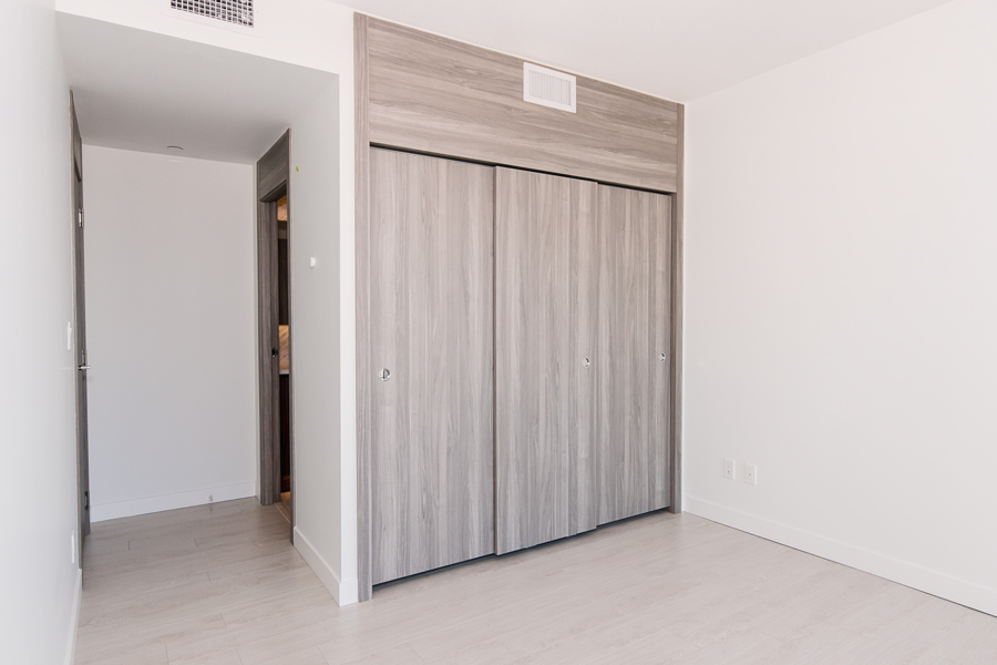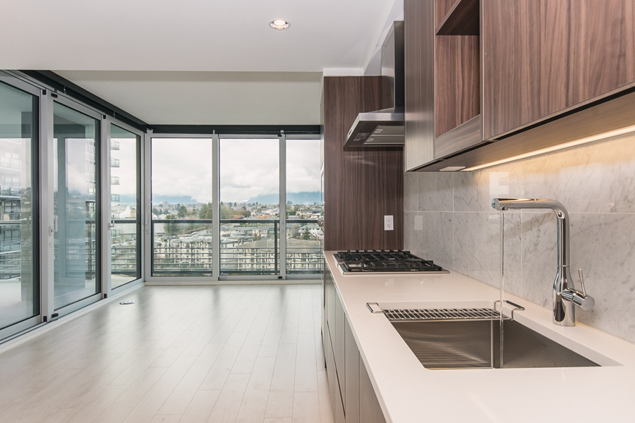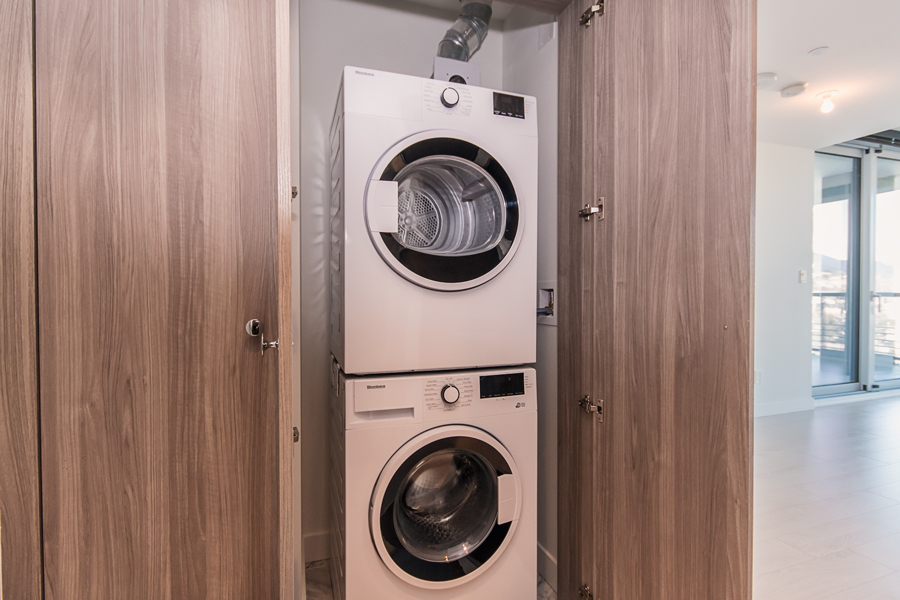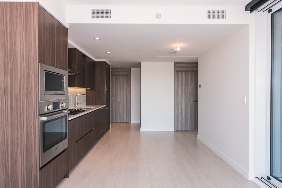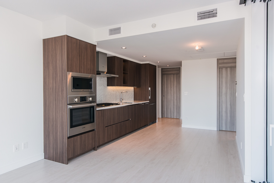 Features in this brand new South-West facing condo include in-unit central heating & air conditioner, electric blinds in the living room, a 330 sq ft wraparound balcony, dark roller shade window coverings, modern kitchen with quartz counter tops, full-sized stainless steel & integrated appliances, smart home thermostat, in-suite washer and dryer, and a living room with floor to ceiling windows on 2 walls and stacker doors that transition onto a large covered balcony