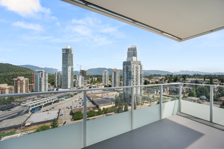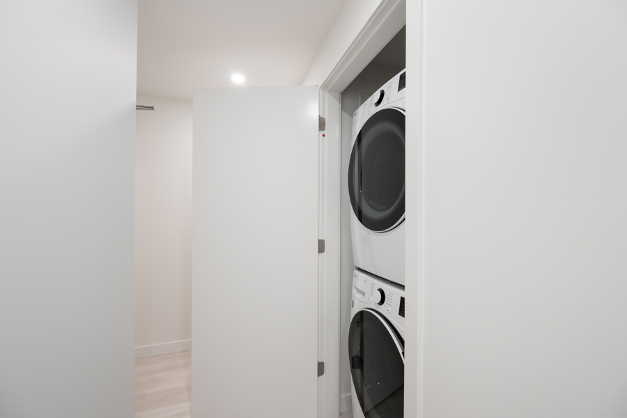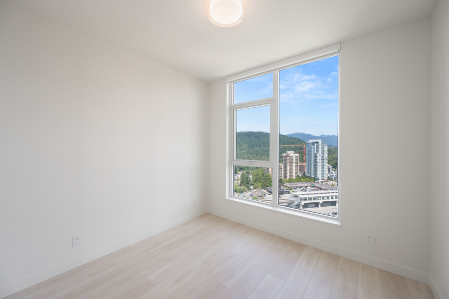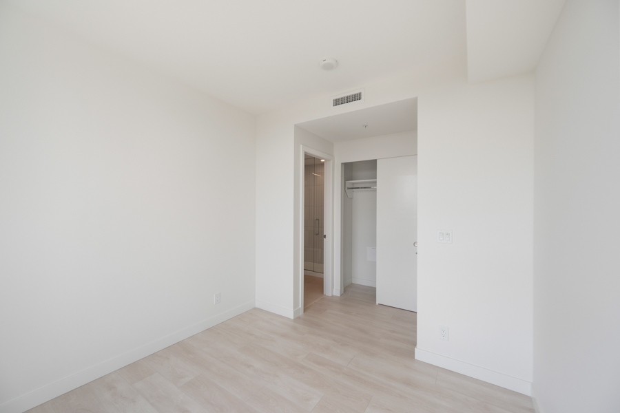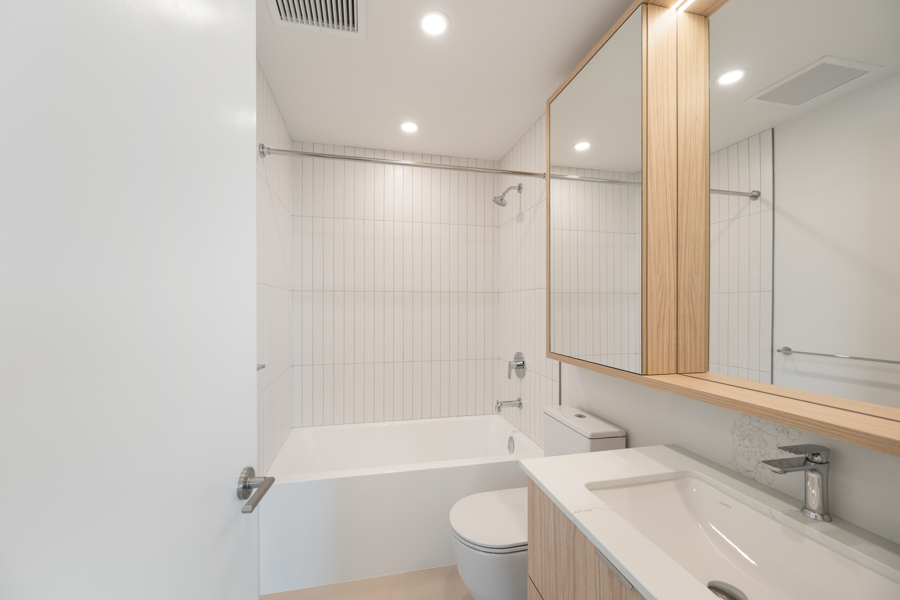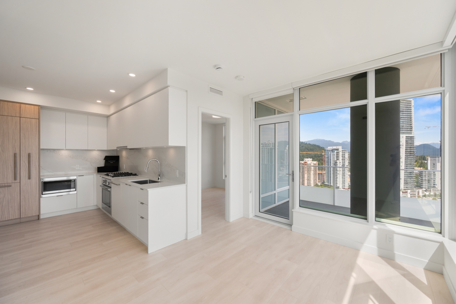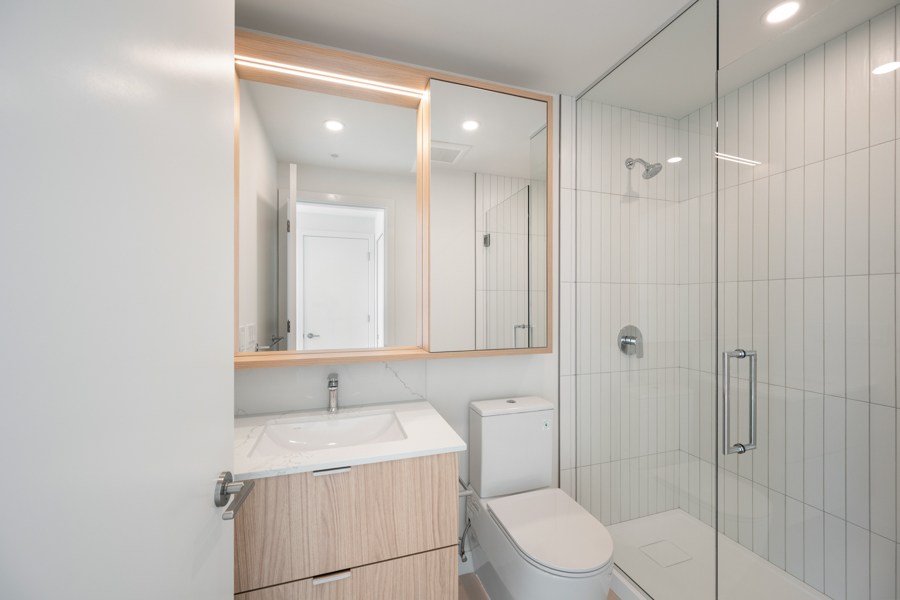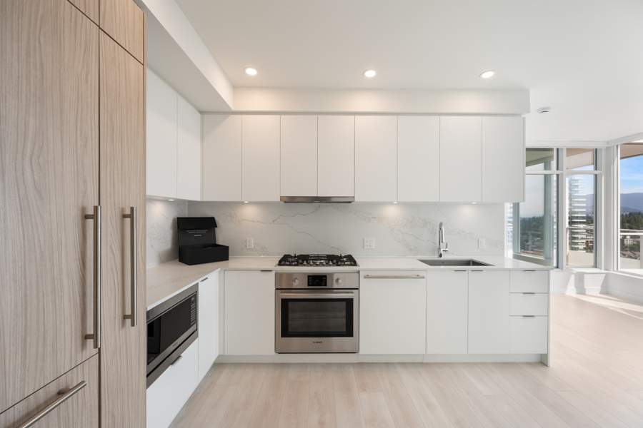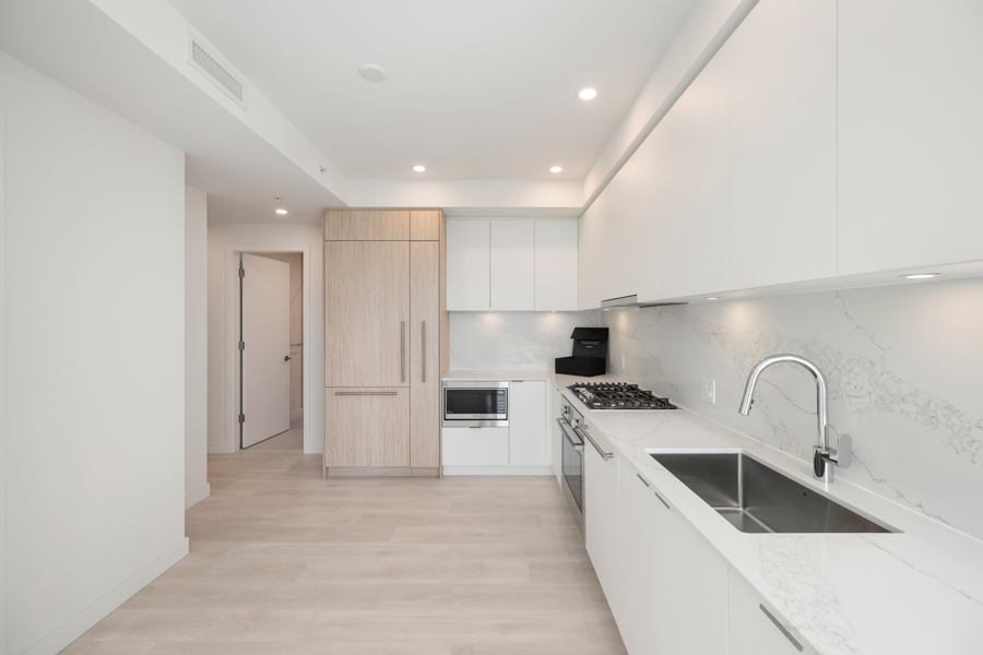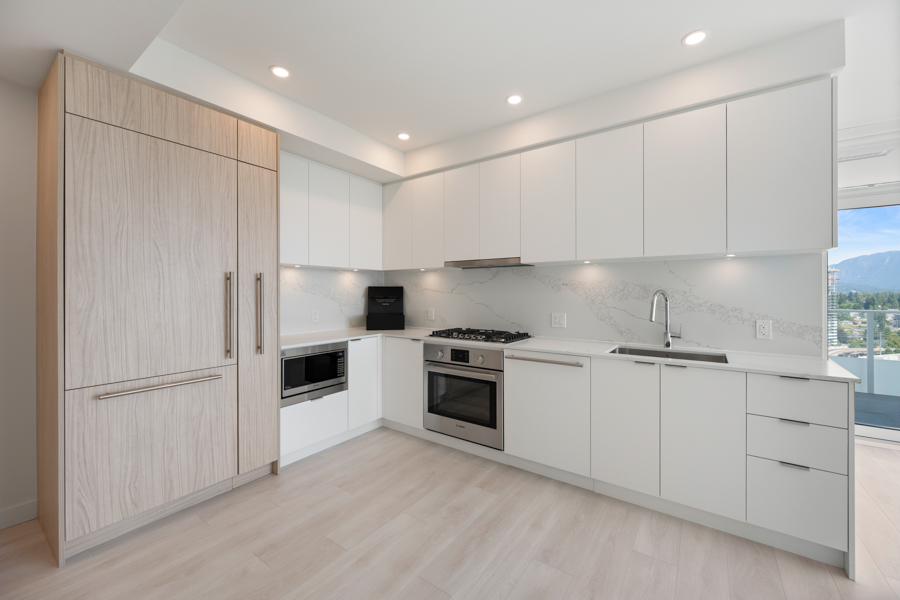 Features in this 21st floor unit include 9’ Ceilings, laminate flooring throughout living areas and bedrooms, Roller Blinds, and a generous sized 131 sq ft balcony. Modern open plan kitchen with European style cabinetry with recessed under-cabinet lighting, and quartz countertops & backsplash. High-end Bosch stainless steel and integrated appliances: fridge, gas cook top, oven, dishwasher, and Panasonic microwave. Primary bedroom has ensuite with step-in shower. Heat pump heating and cooling. In-suite washer and dryer