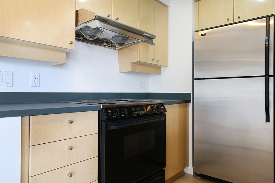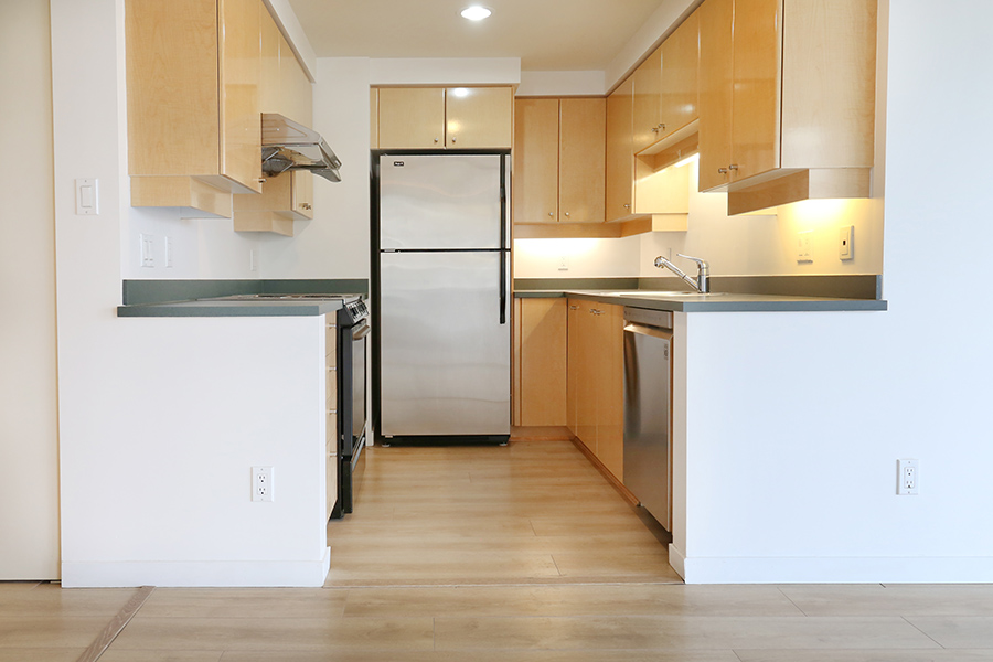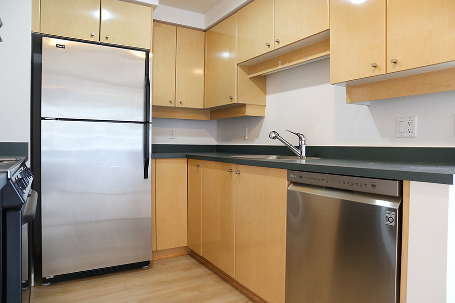 Features in this unit include panoramic city views, a spacious bedroom, bright flex den space with windows, suitable as a second bedroom or office, laminate flooring throughout living area and bedroom, large kitchen with plenty of storage, electric stove and oven, stainless steel refrigerator and dishwasher, and in-suite washer and dryer.
