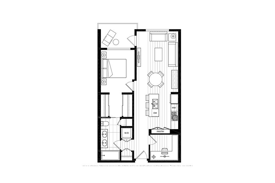 Features in this open floor plan unit include a mid-century modern inspired aesthetic, granite kitchen countertops with a large island, stainless steel appliances, a spacious bedroom with walk-through closet, ensuite bathroom with double vanity, over-height ceilings, and in-suite washer and dryer.
