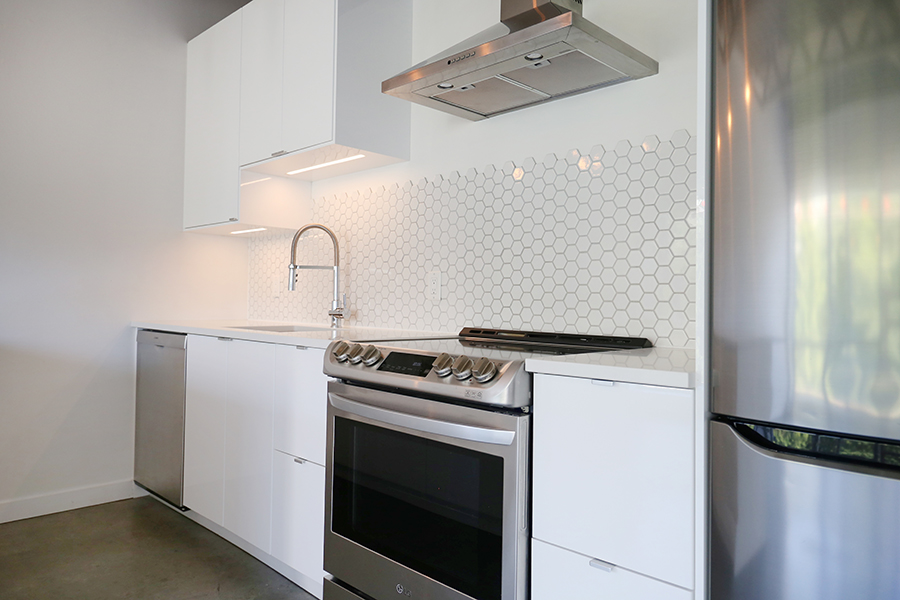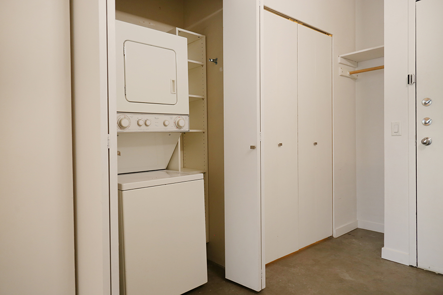Features in this open plan live/work loft space include 10 ft exposed ceilings, floor-to-ceiling windows, polished concrete floors & Juliet balcony, modern cabinetry & Stone countertops, stainless steel fridge, stove/oven, dishwasher, and microwave, and in-suite washer and dryer.