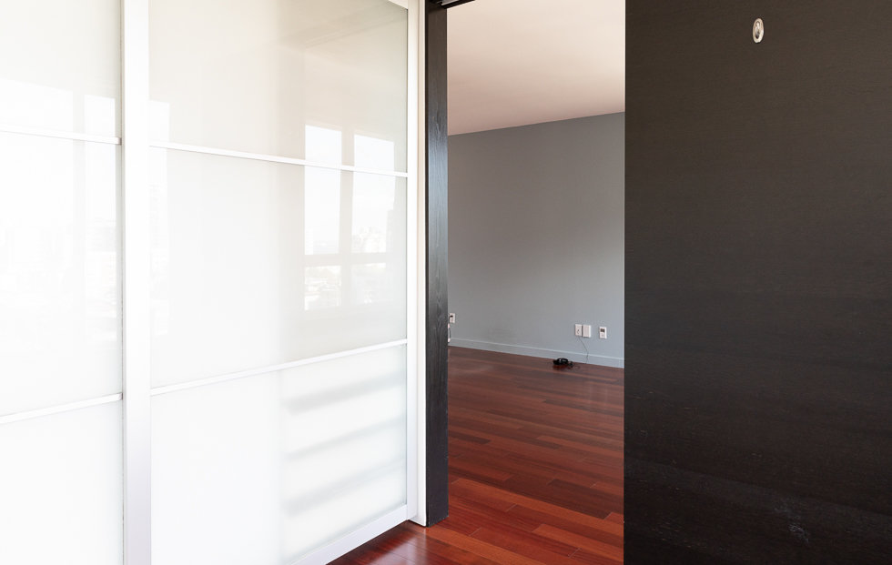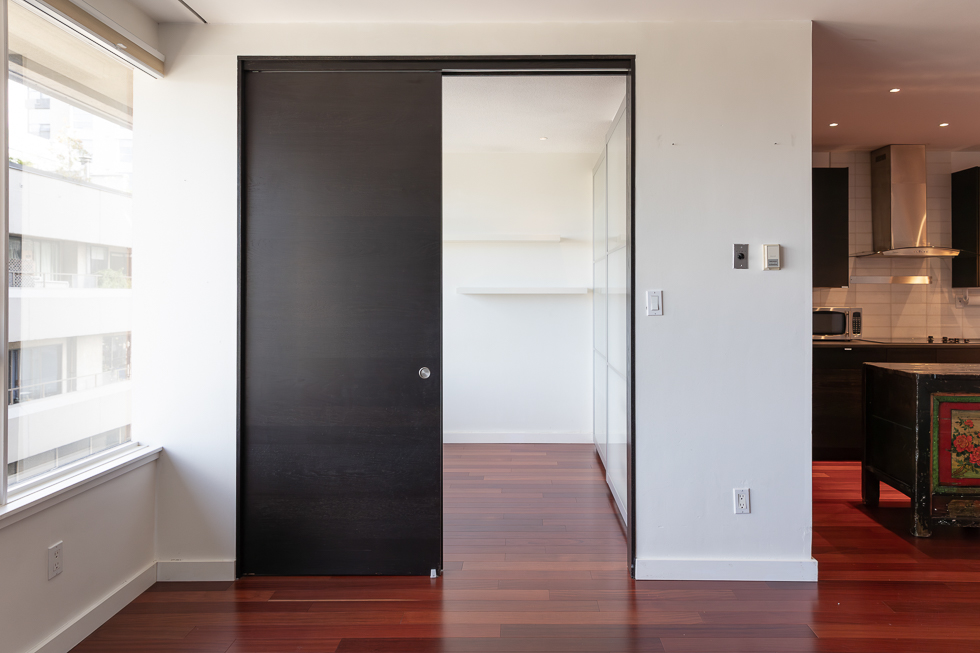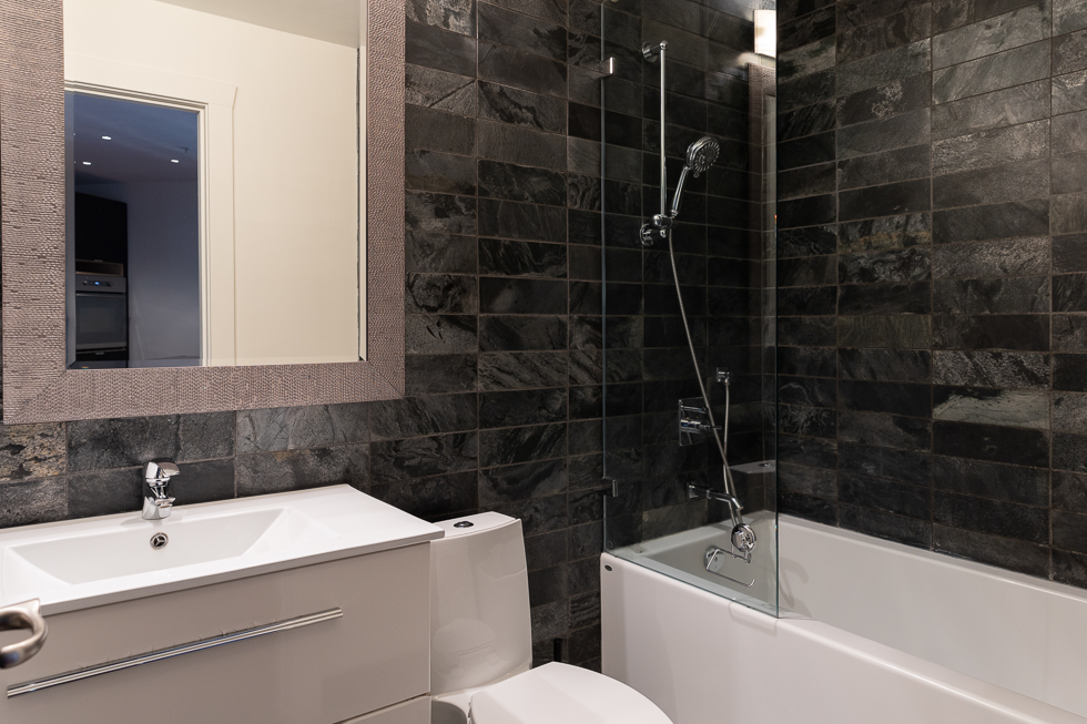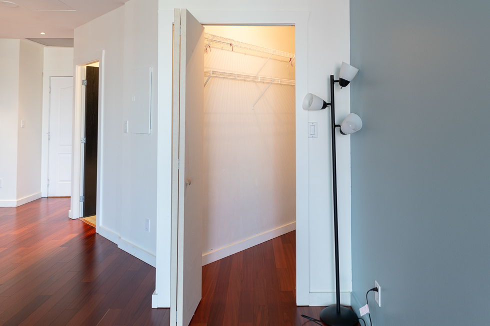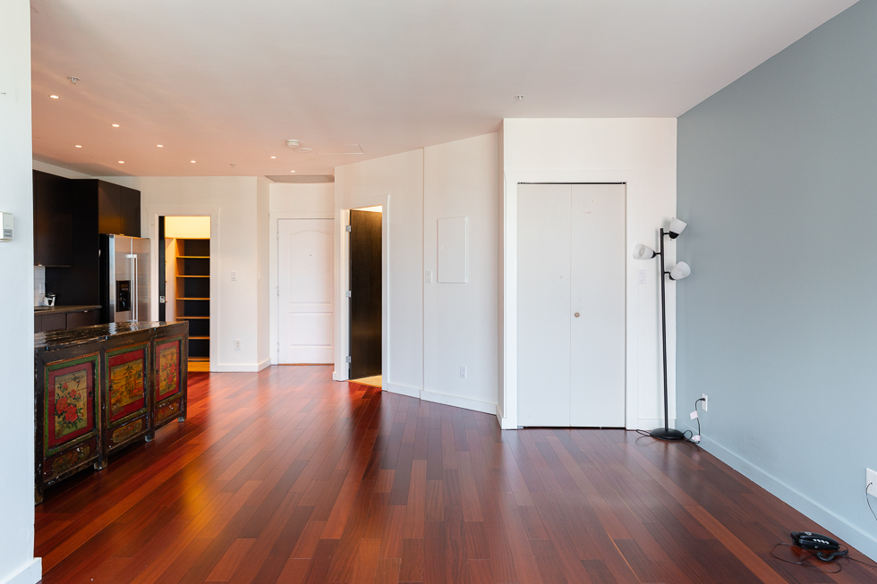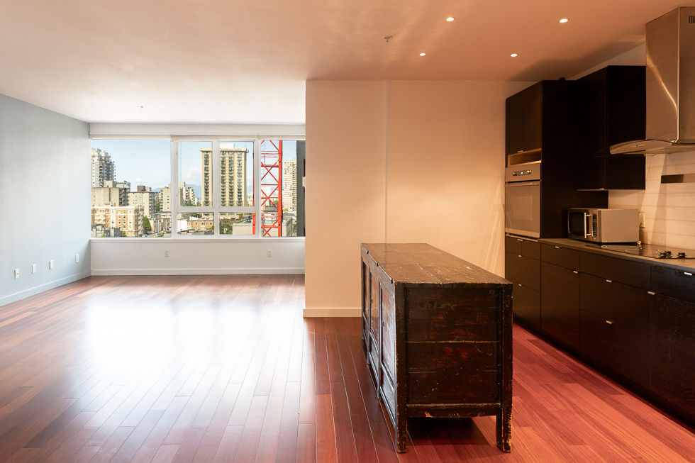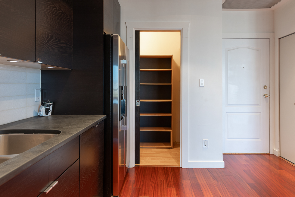 Features in this 9th floor unit include a modern open plan kitchen with island and quartz counter tops and rustic antique kitchen island and full-size stainless-steel and integrated appliances: fridge, glass cooktop, oven, dishwasher, and microwave. There is in-suite storage off of kitchen area, a spacious living room, laminate flooring throughout, and a bedroom with built-in wardrobe system.
