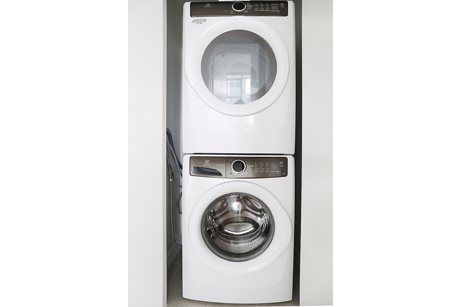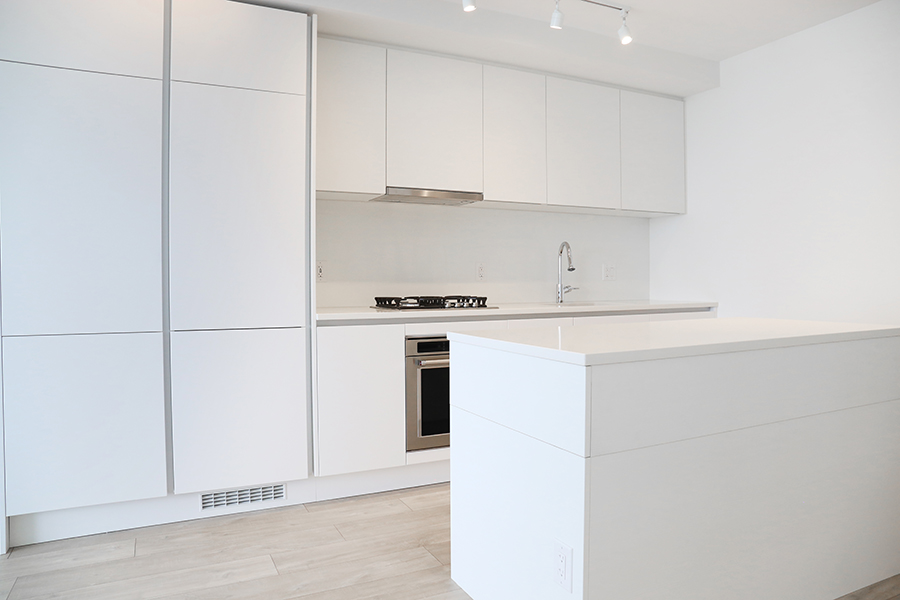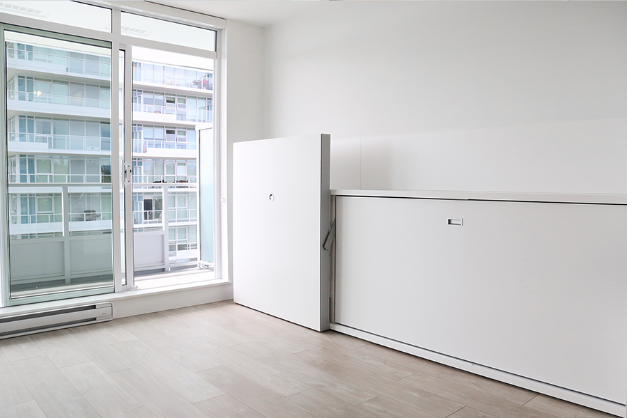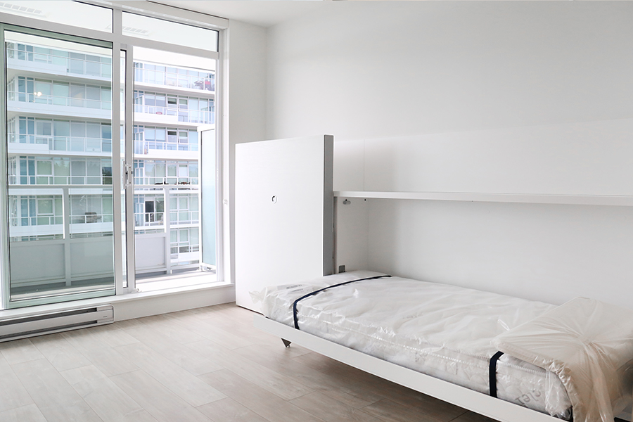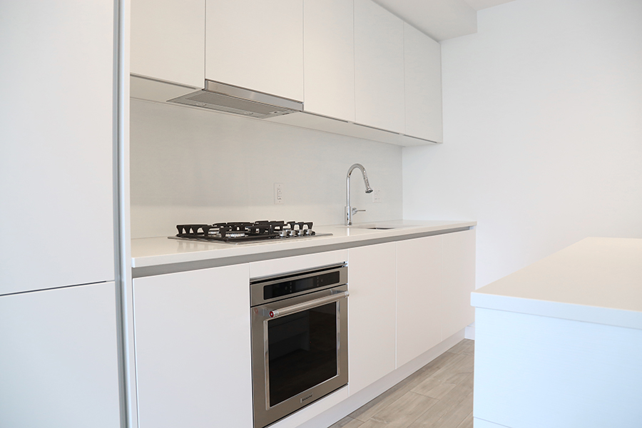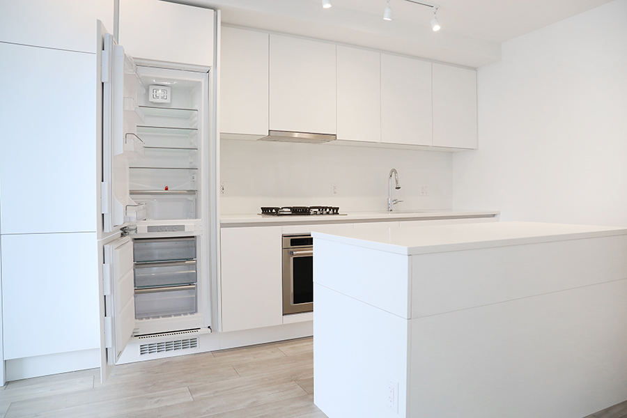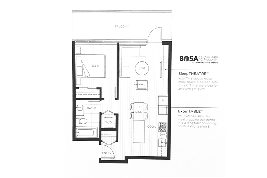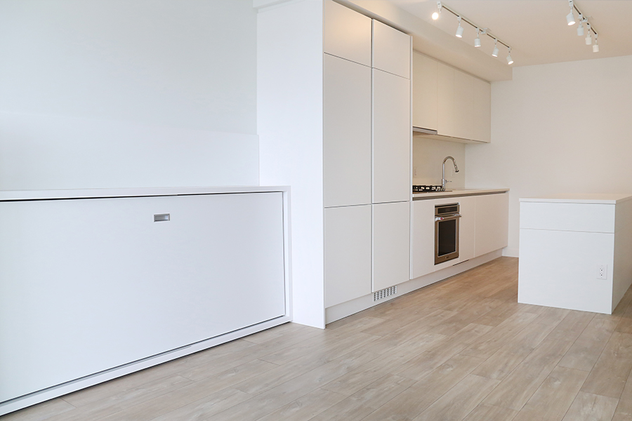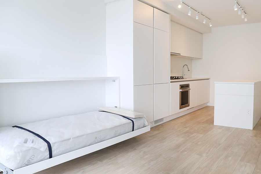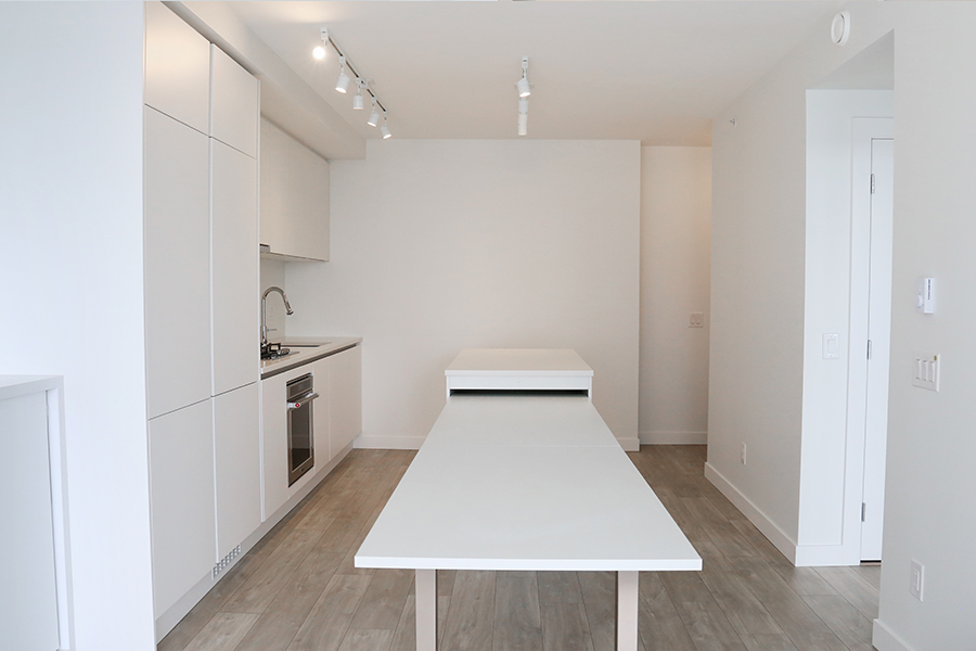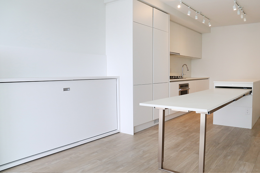Features include open plan living, floor to ceiling windows to allow plenty of natural light, premium integrated appliances: Fridge, Dishwasher, Gas Stove, Oven, composite stone countertops, large kitchen island with ExtenTABLE that can comfortably seat 8 people, SleepTHEATRE (your tv slides to reveal a spare bed for an overnight guest), laminate wood flooring throughout, large patio 144 sq ft patio, beautiful views to the West, and in-suite washer and dryer.