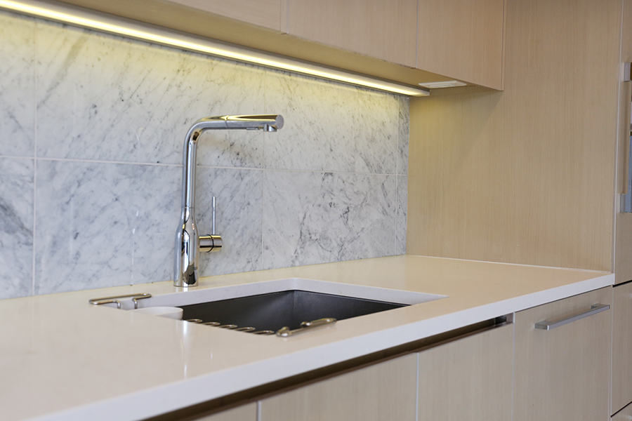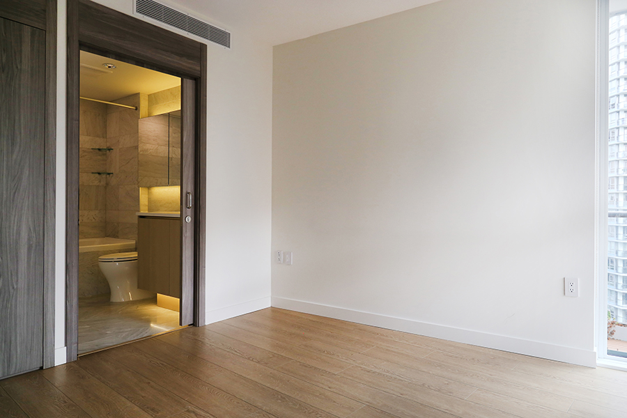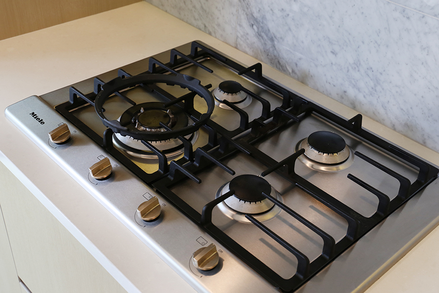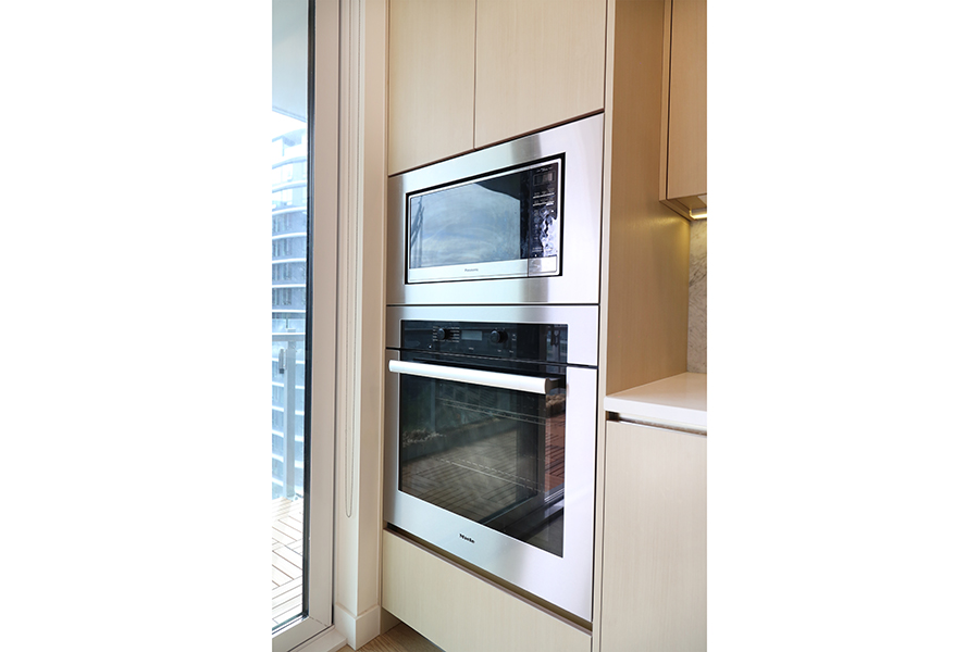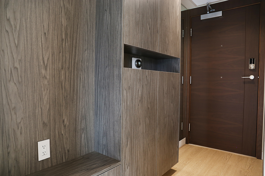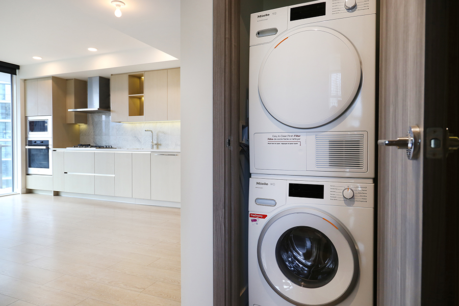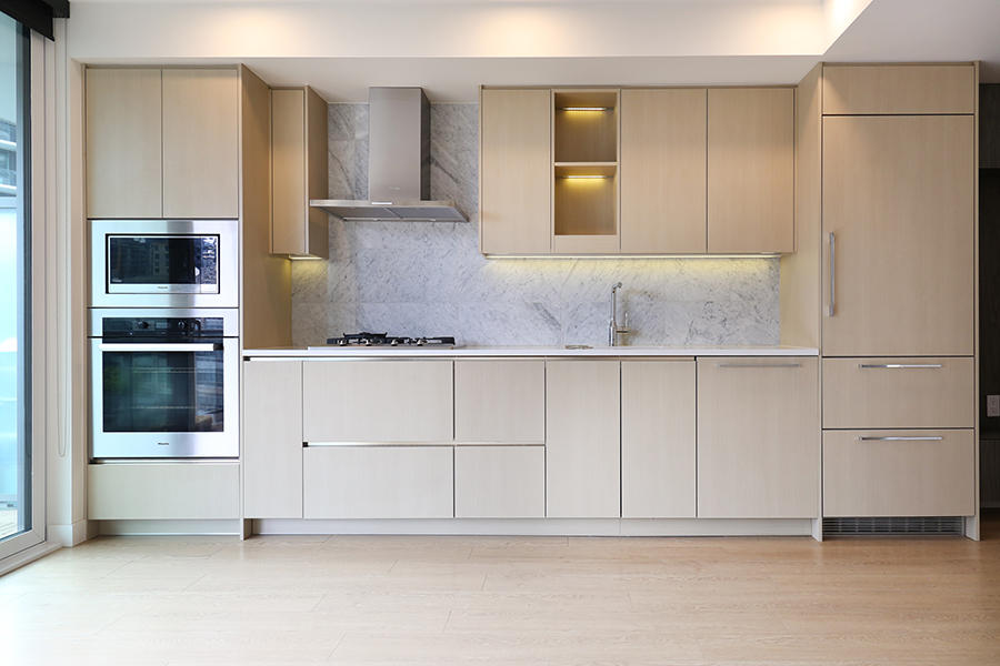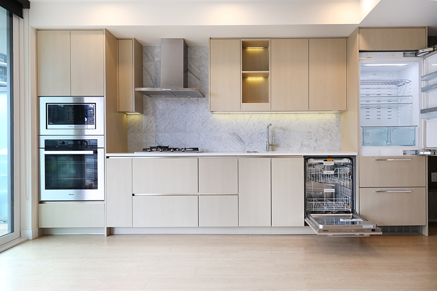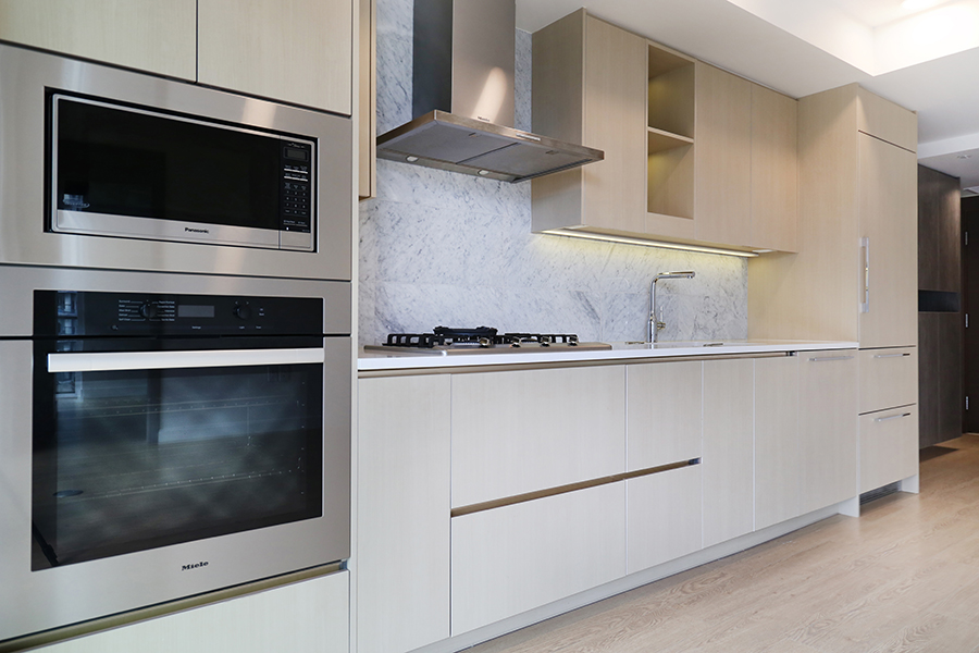 Features in this unit include Miele stainless steel and integrated appliances: fridge, gas cook top, oven, dishwasher, and microwave, central air-conditioning & heating, quartz countertops & marble tile backsplash, primary ensuite bathroom, customized closet and organizers, private wrap around patio, in-suite washer and dryer
