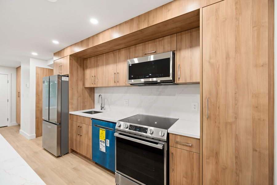 Features in this ground level suite include open plan kitchen with custom cabinetry and plenty of storage. High efficiency radiant heating and ventilation system. Stainless steel fridge, stove/oven, dishwasher, and microwave. Kitchen island with room for barstools. Spacious bedrooms, lots of closet space throughout suite, and a Private Courtyard. High efficiency combination gas boiler supplying both the radiant heating and on-demand hot water. In-suite washer and dryer