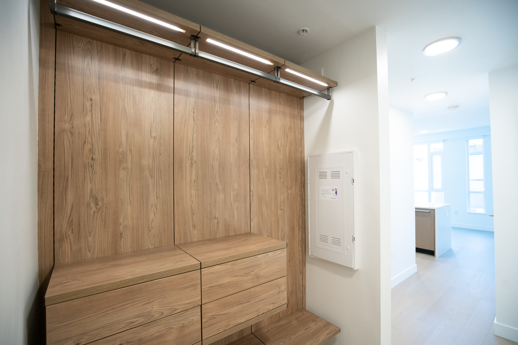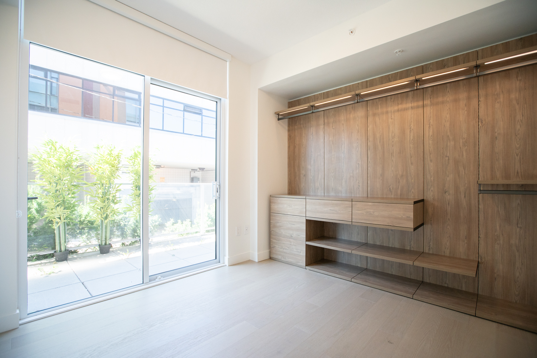 Features in this second floor corner unit include a 412 sq ft wraparound patio, open plan kitchen with Italian style cabinetry with kitchen island and quartz countertops & backsplash. Stainless steel and integrated Miele appliances: fridge, gas cook top, oven, dishwasher, and microwave, central air-conditioning & heating, 9’3” ceilings, spacious primary bedroom with built in cabinetry system, in-suite storage room/flex space, wide plank engineered hardwood flooring throughout, and in-suite washer and dryer