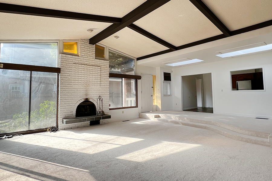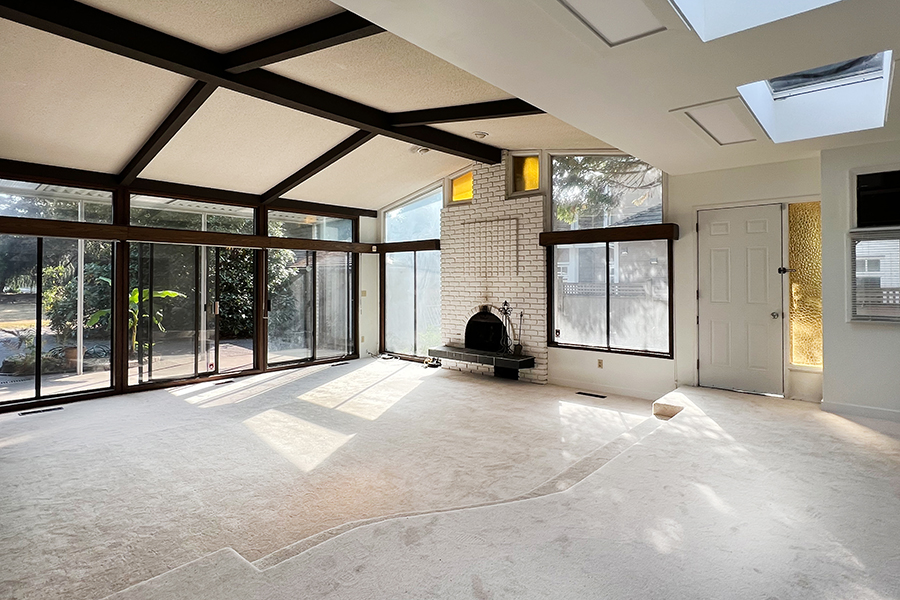 Features include mid-century house with unique design features, large property with private yard, living areas all on one level, large windows & skylights allowing plenty of natural light, spacious living rooms & bedrooms, shared tennis court (with house next door).
